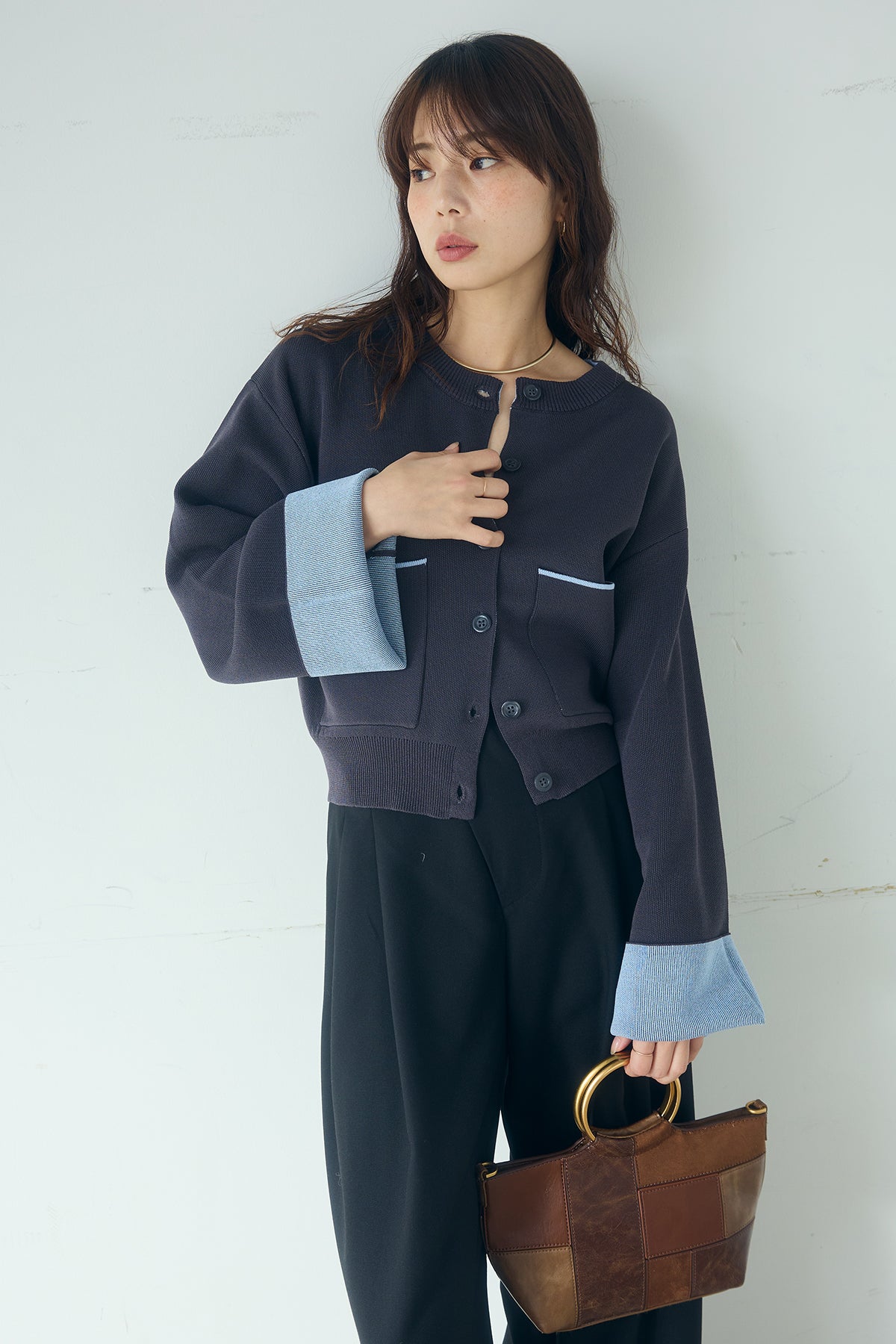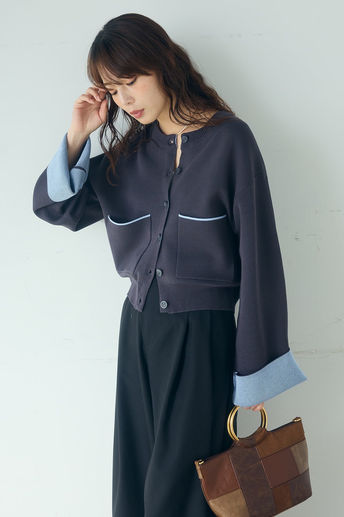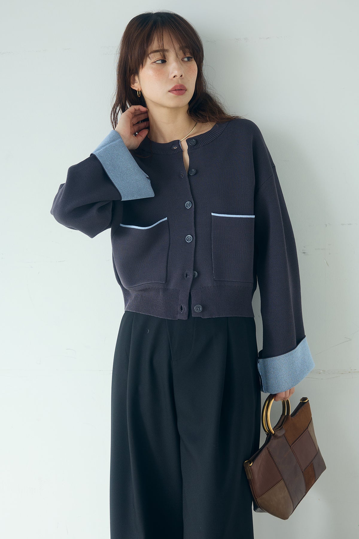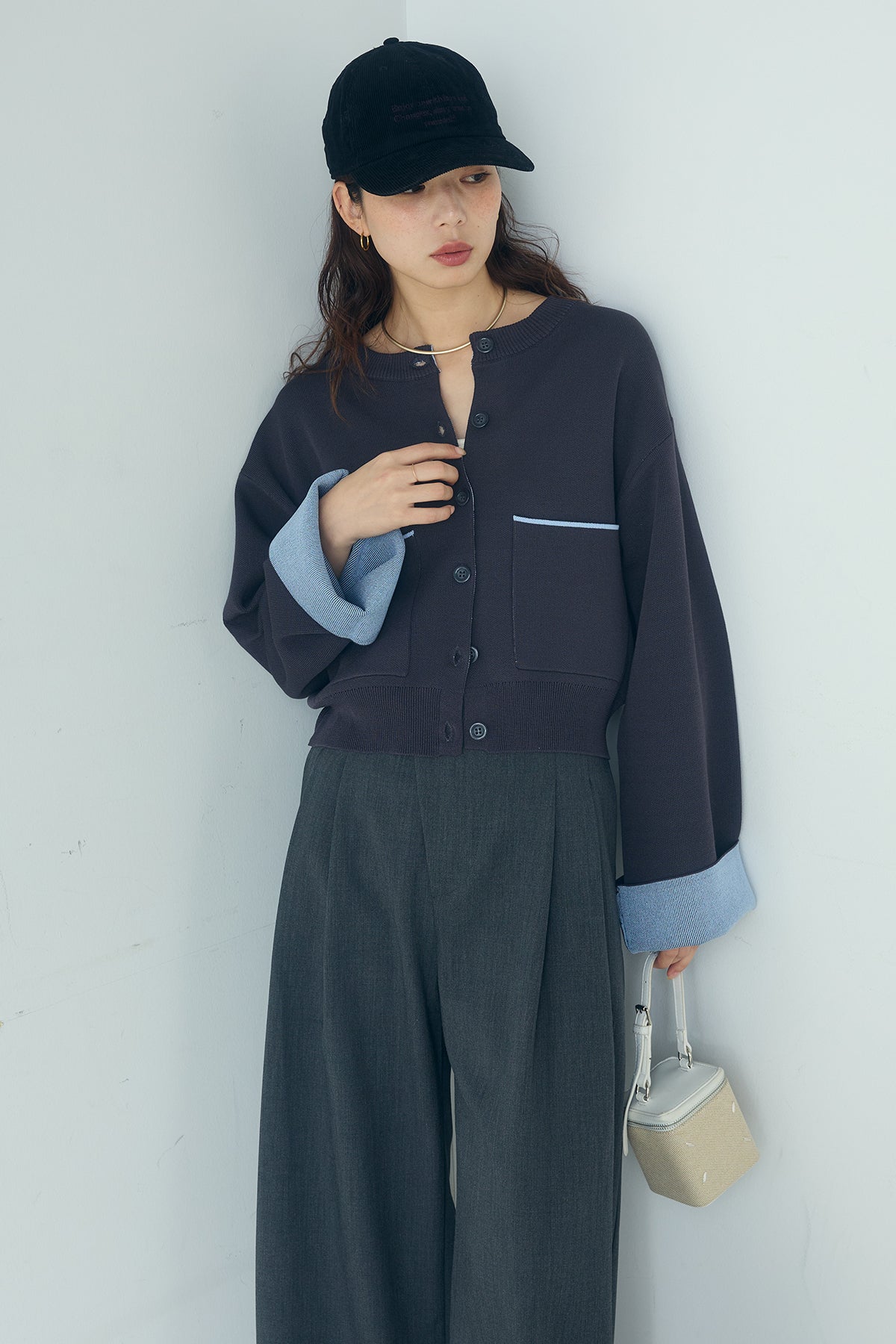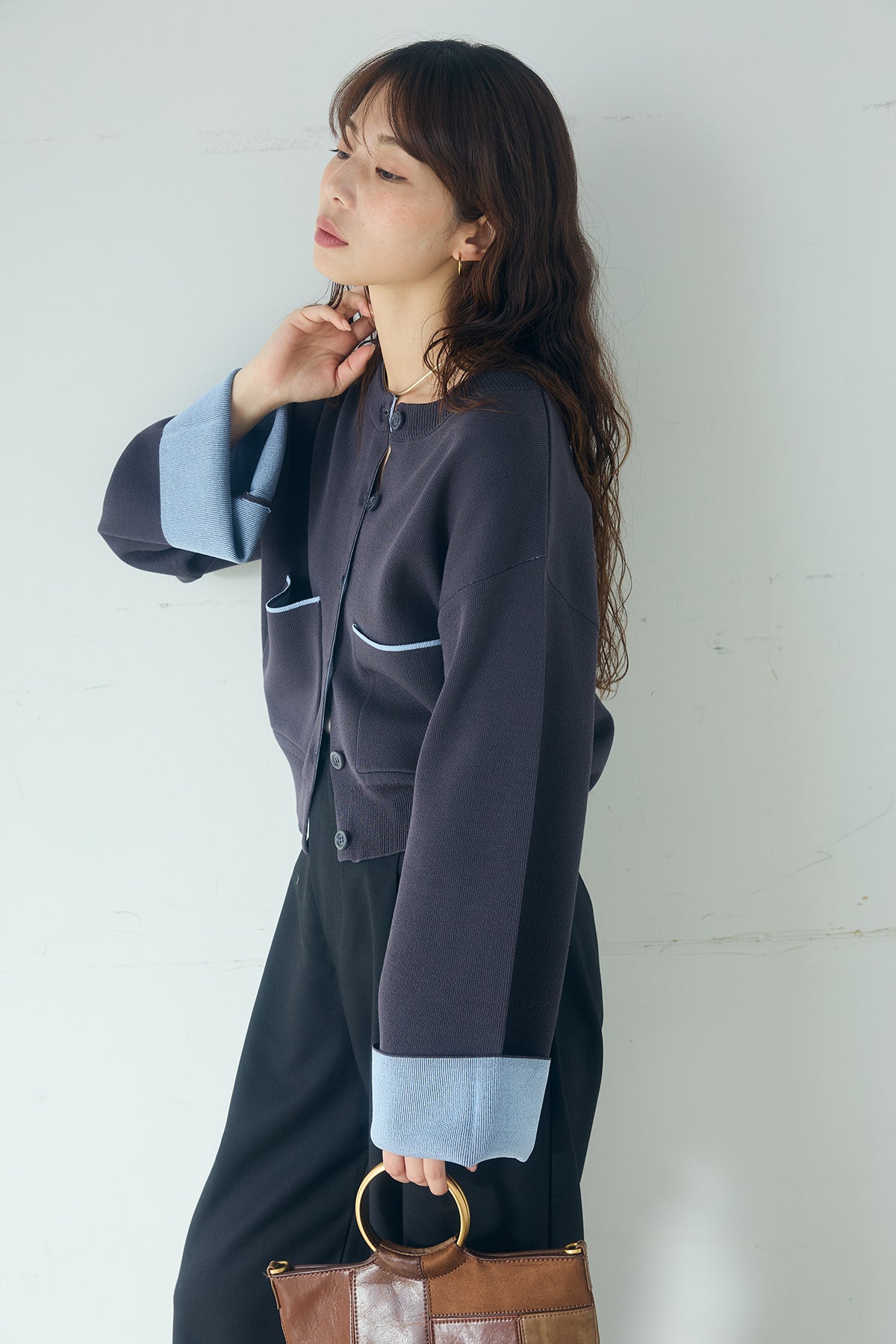 ほどよい落ち感のあるダブルフェイス仕立てが、上品な印象を引き立てるカーディガン。 配色のパイピングやカフスの切り替えが、シンプルな中にさりげないアクセントを添えています。 すっきりとした丈感で、ワイドパンツやスカートとも好相性。 きちんと感とリラックス感のバランスが取れた、日常に取り入れやすい一枚です。