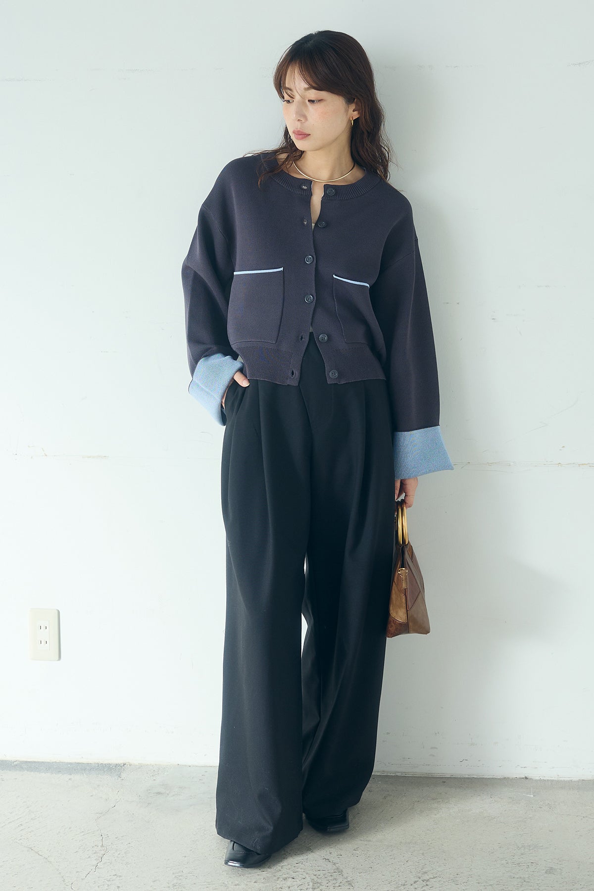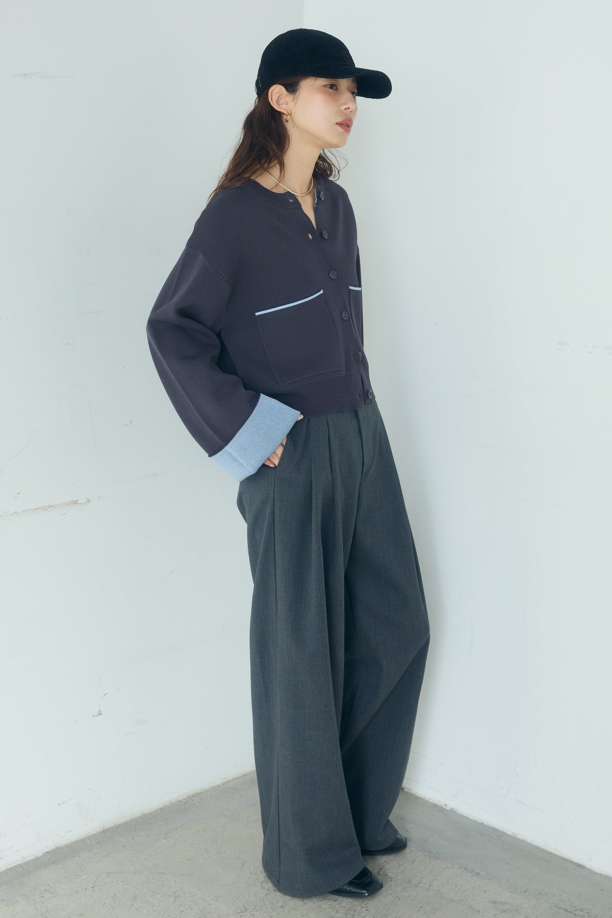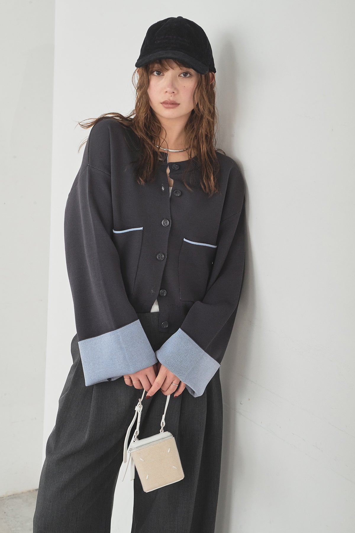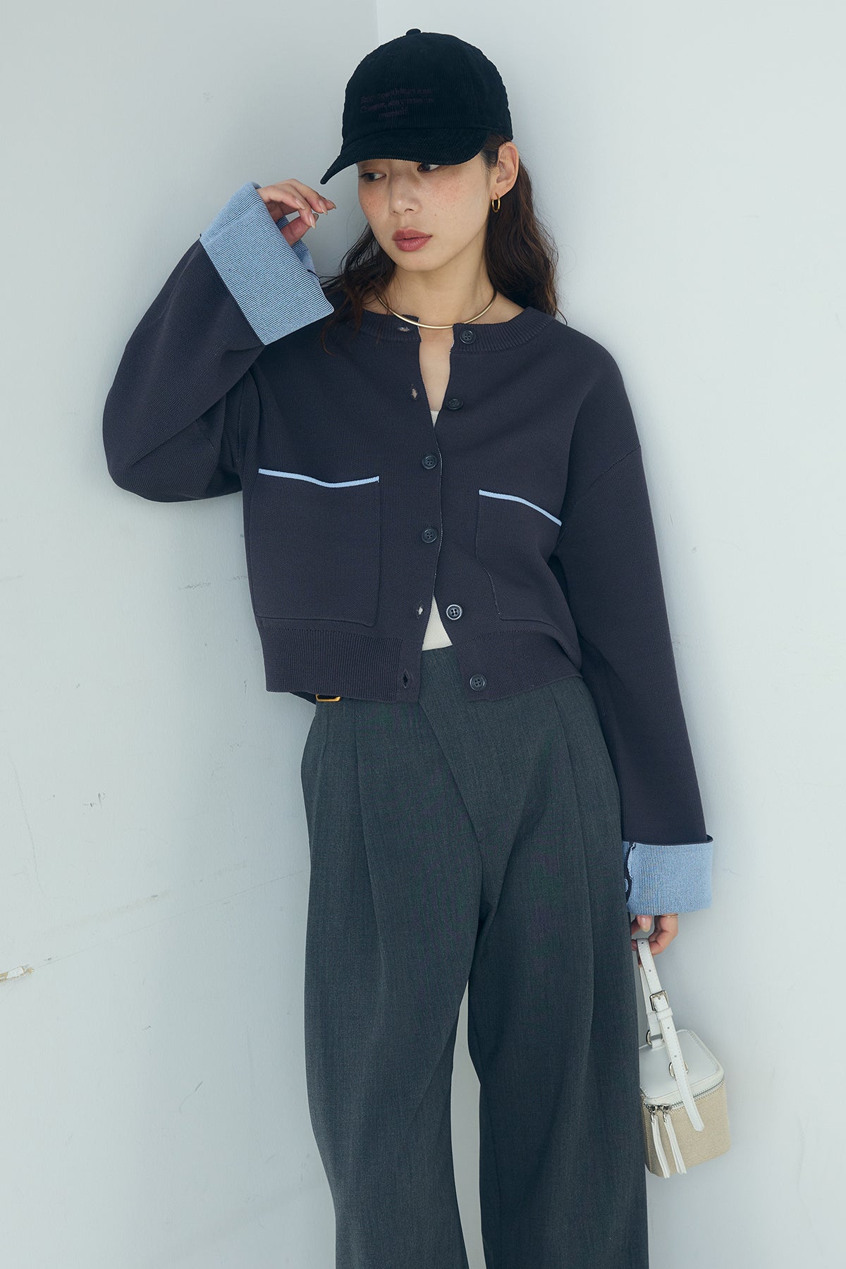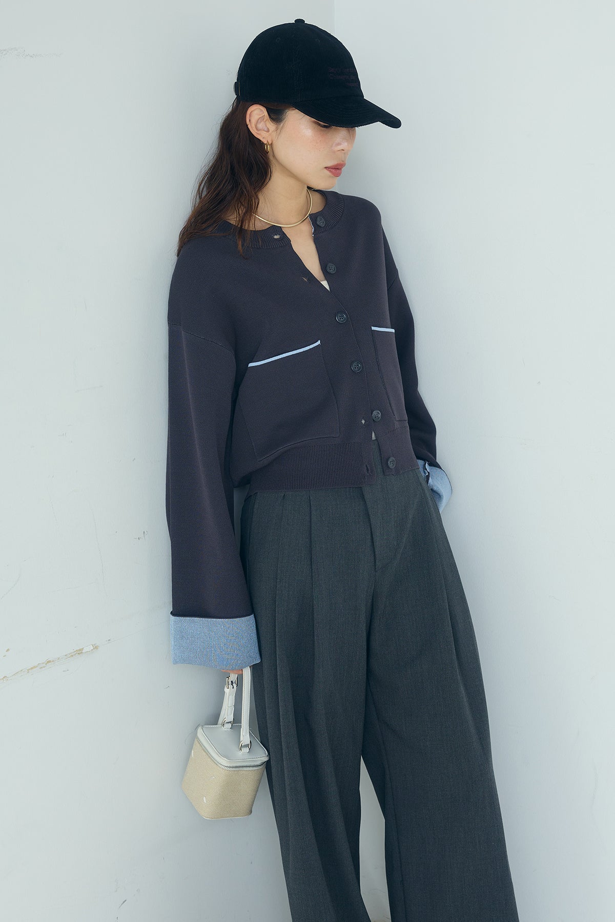 ほどよい落ち感のあるダブルフェイス仕立てが、上品な印象を引き立てるカーディガン。 配色のパイピングやカフスの切り替えが、シンプルな中にさりげないアクセントを添えています。 すっきりとした丈感で、ワイドパンツやスカートとも好相性。 きちんと感とリラックス感のバランスが取れた、日常に取り入れやすい一枚です。
