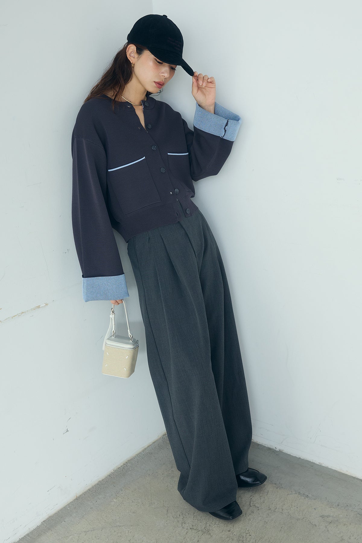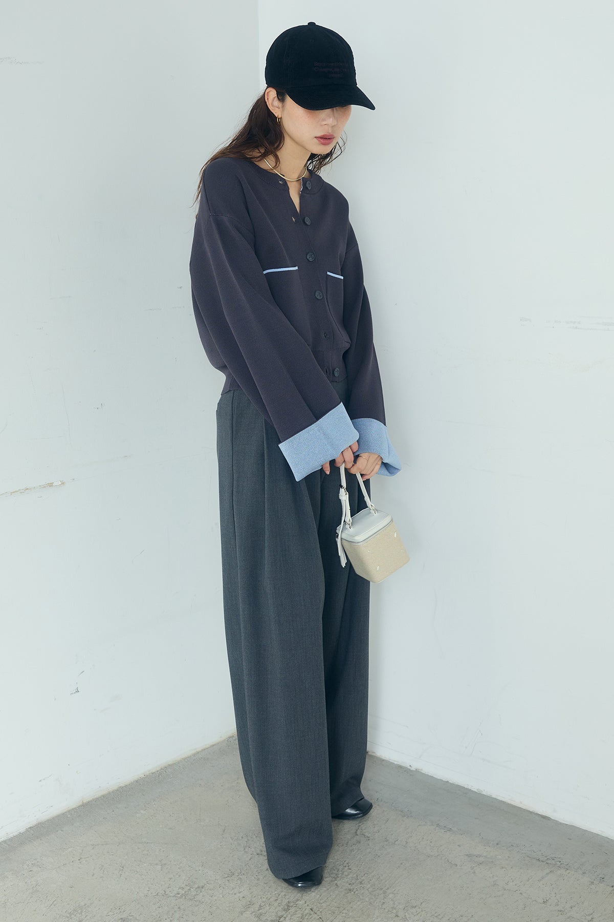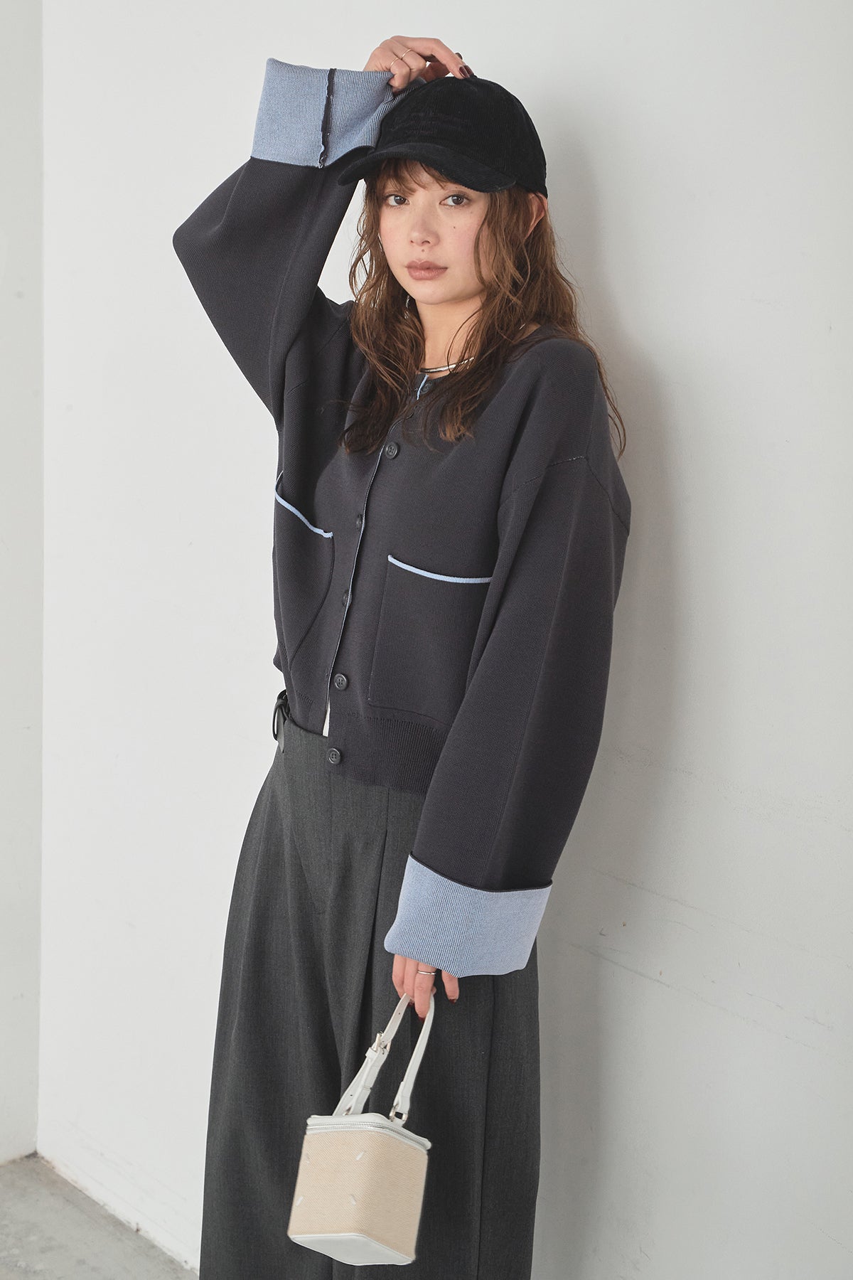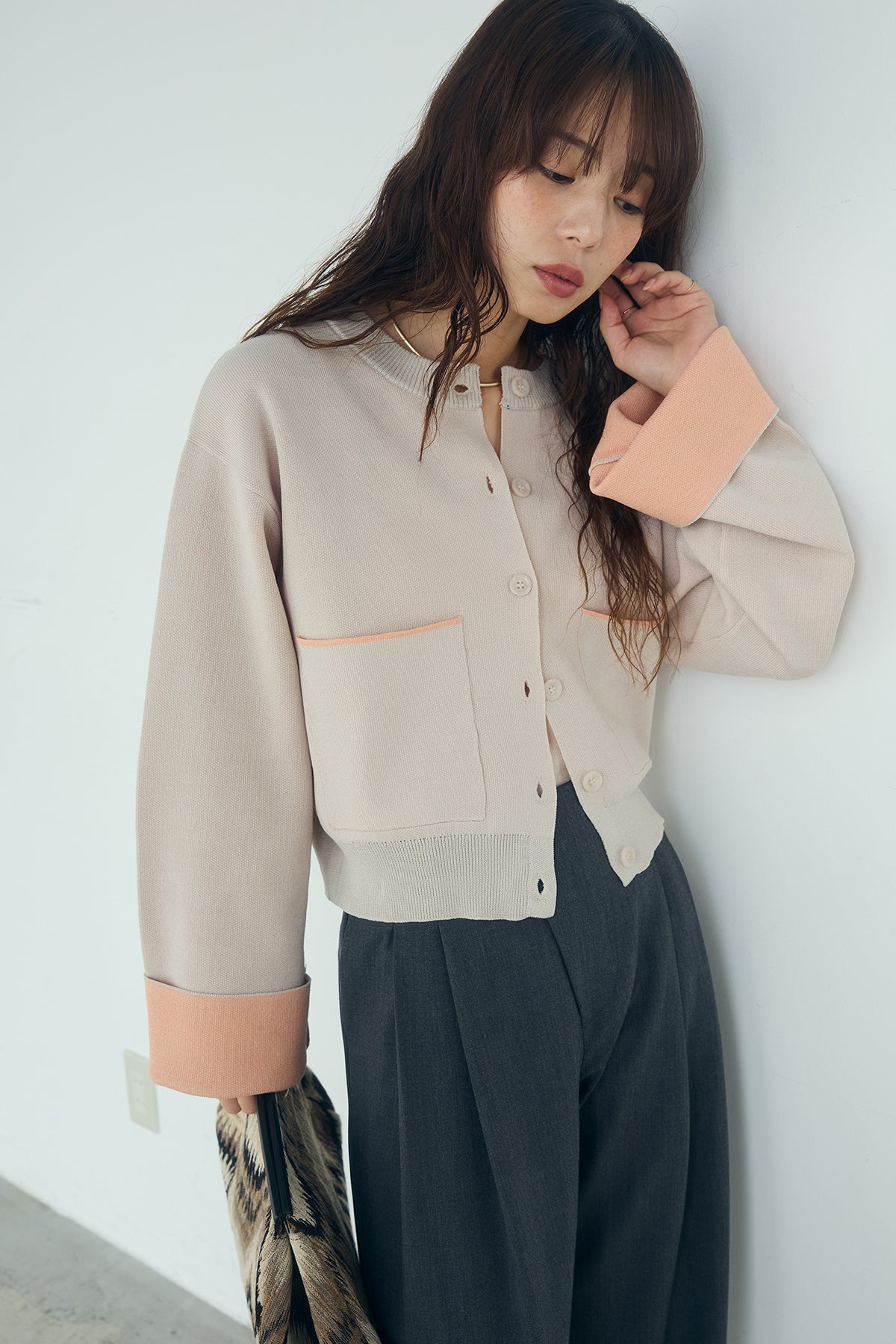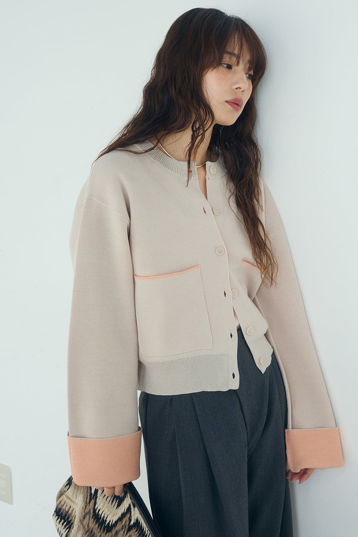ほどよい落ち感のあるダブルフェイス仕立てが、上品な印象を引き立てるカーディガン。 配色のパイピングやカフスの切り替えが、シンプルな中にさりげないアクセントを添えています。 すっきりとした丈感で、ワイドパンツやスカートとも好相性。 きちんと感とリラックス感のバランスが取れた、日常に取り入れやすい一枚です。