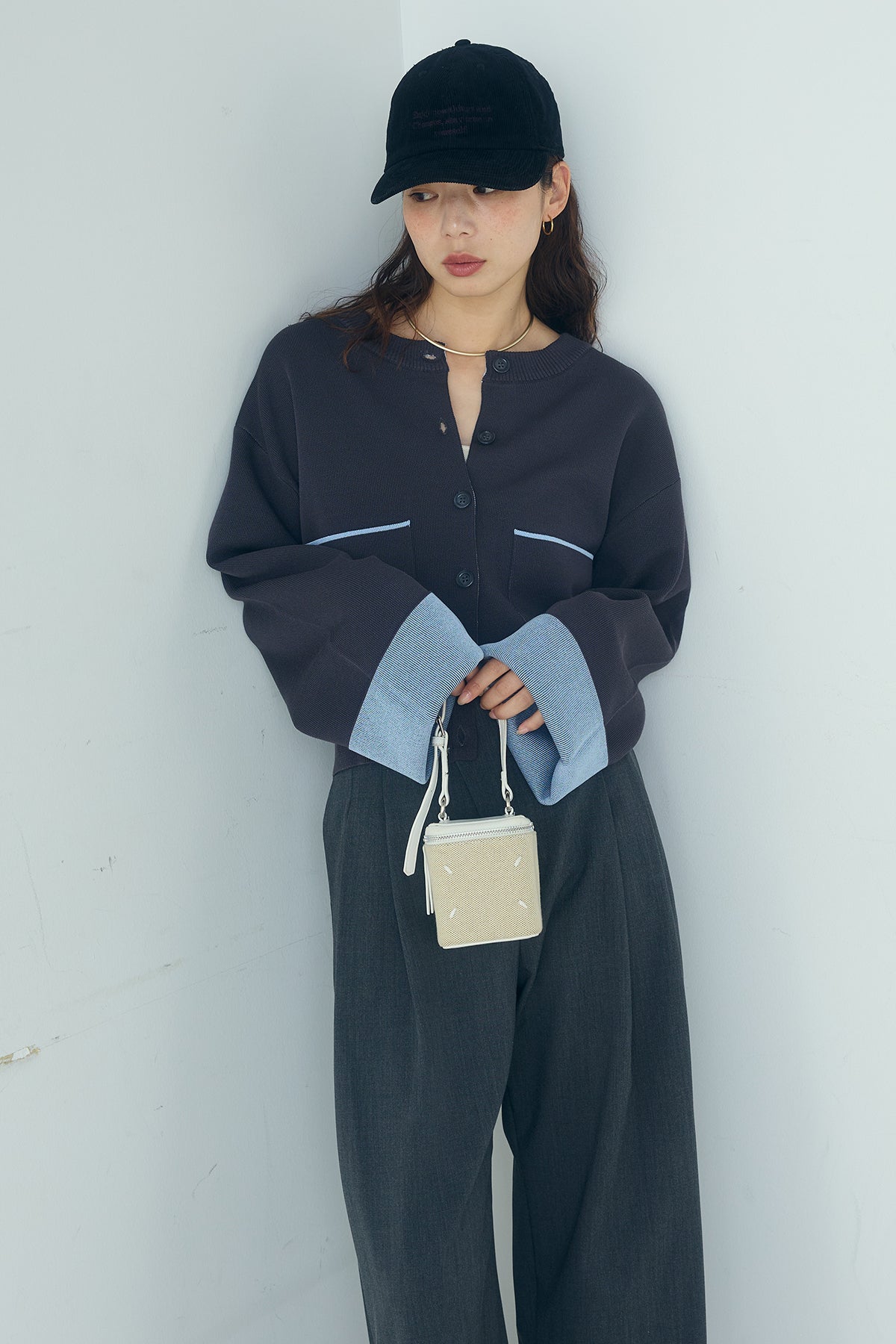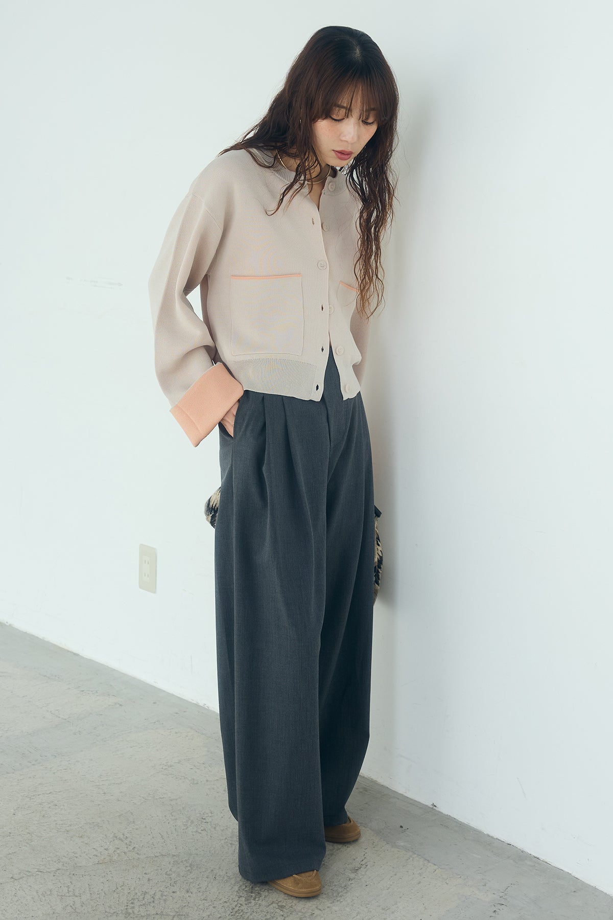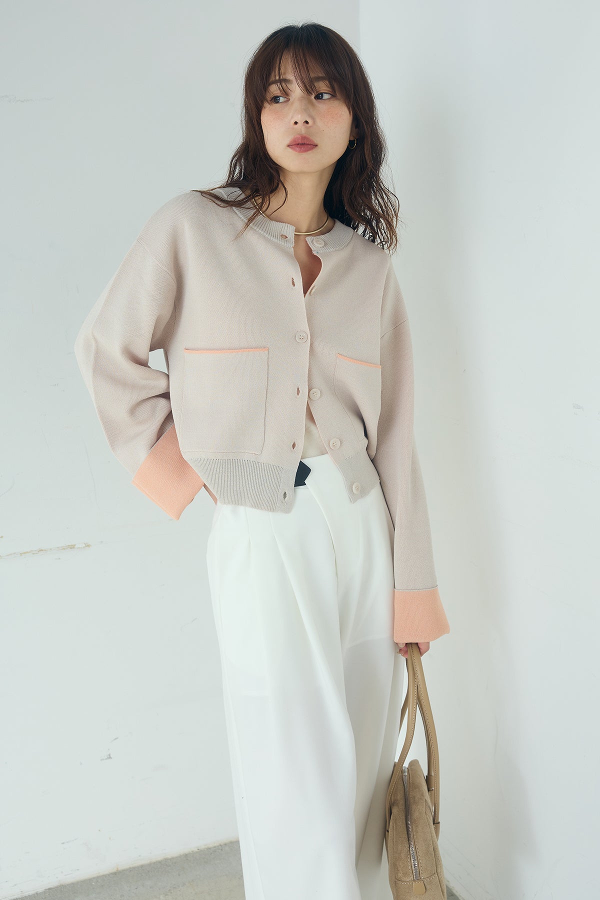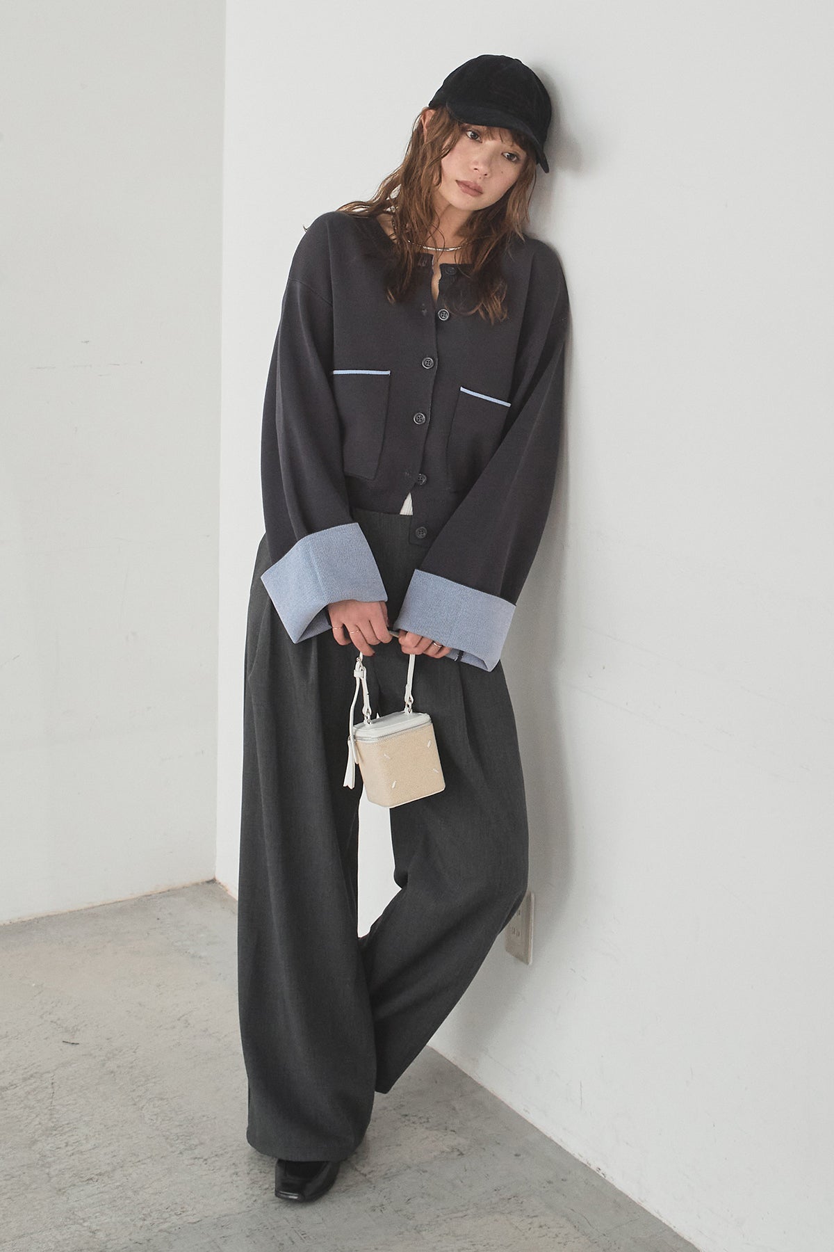 ほどよい落ち感のあるダブルフェイス仕立てが、上品な印象を引き立てるカーディガン。 配色のパイピングやカフスの切り替えが、シンプルな中にさりげないアクセントを添えています。 すっきりとした丈感で、ワイドパンツやスカートとも好相性。 きちんと感とリラックス感のバランスが取れた、日常に取り入れやすい一枚です。