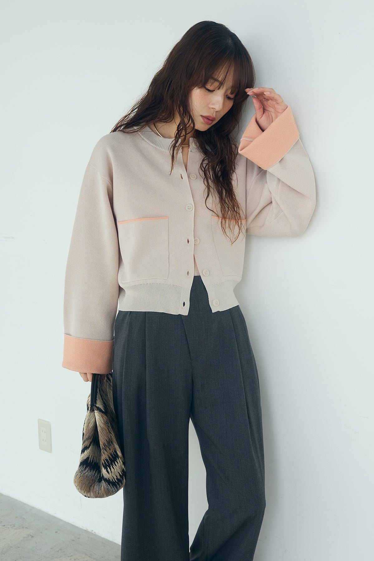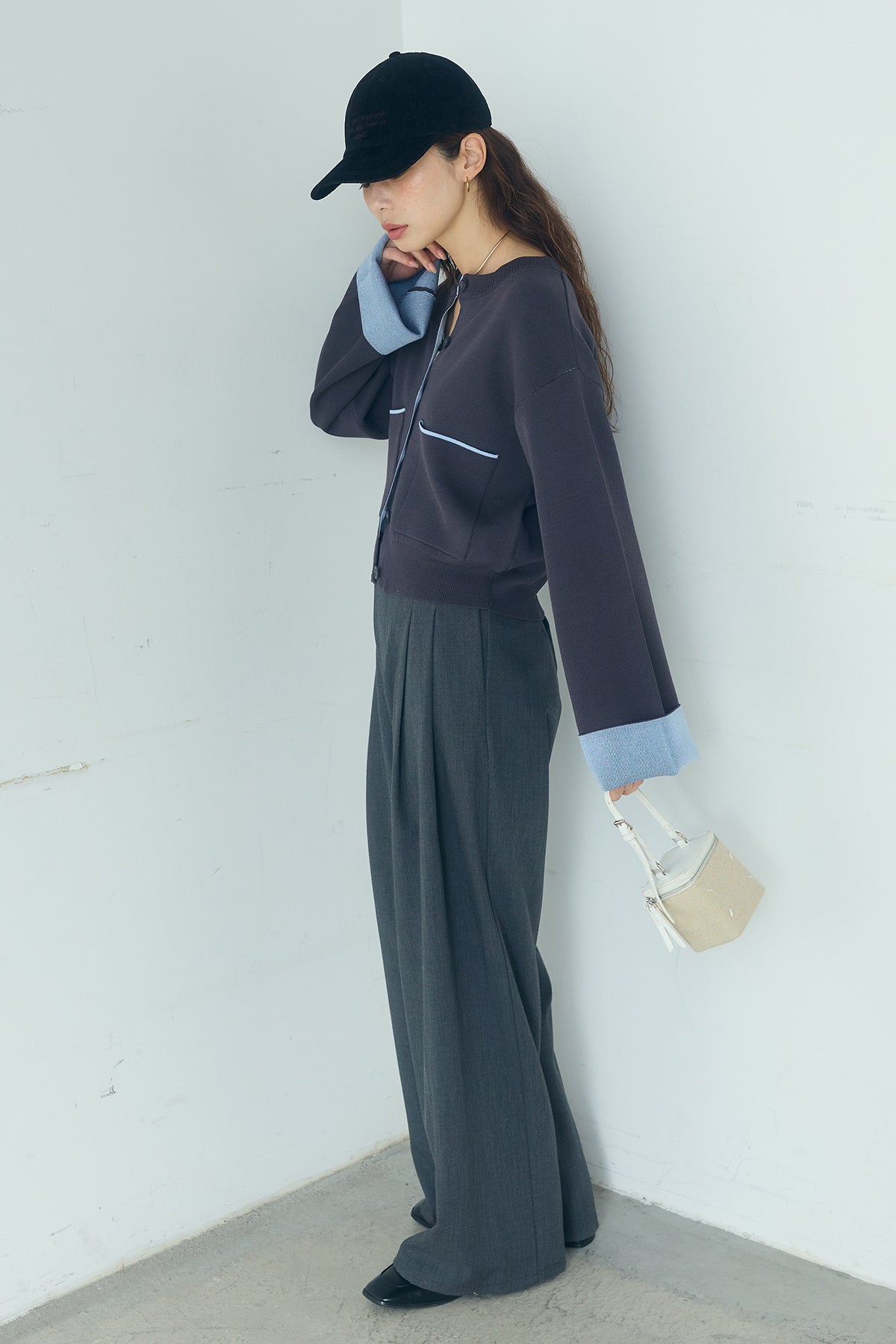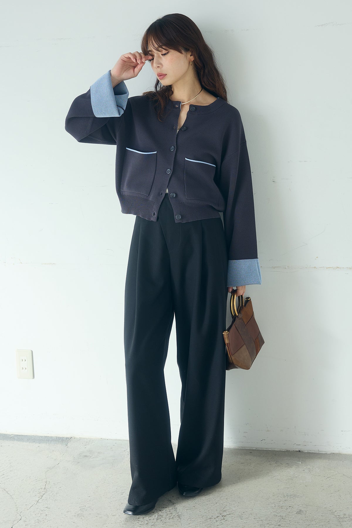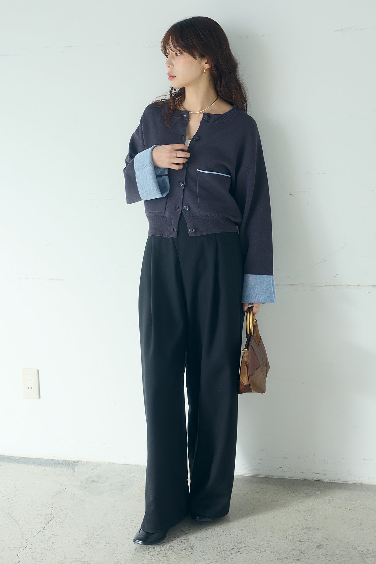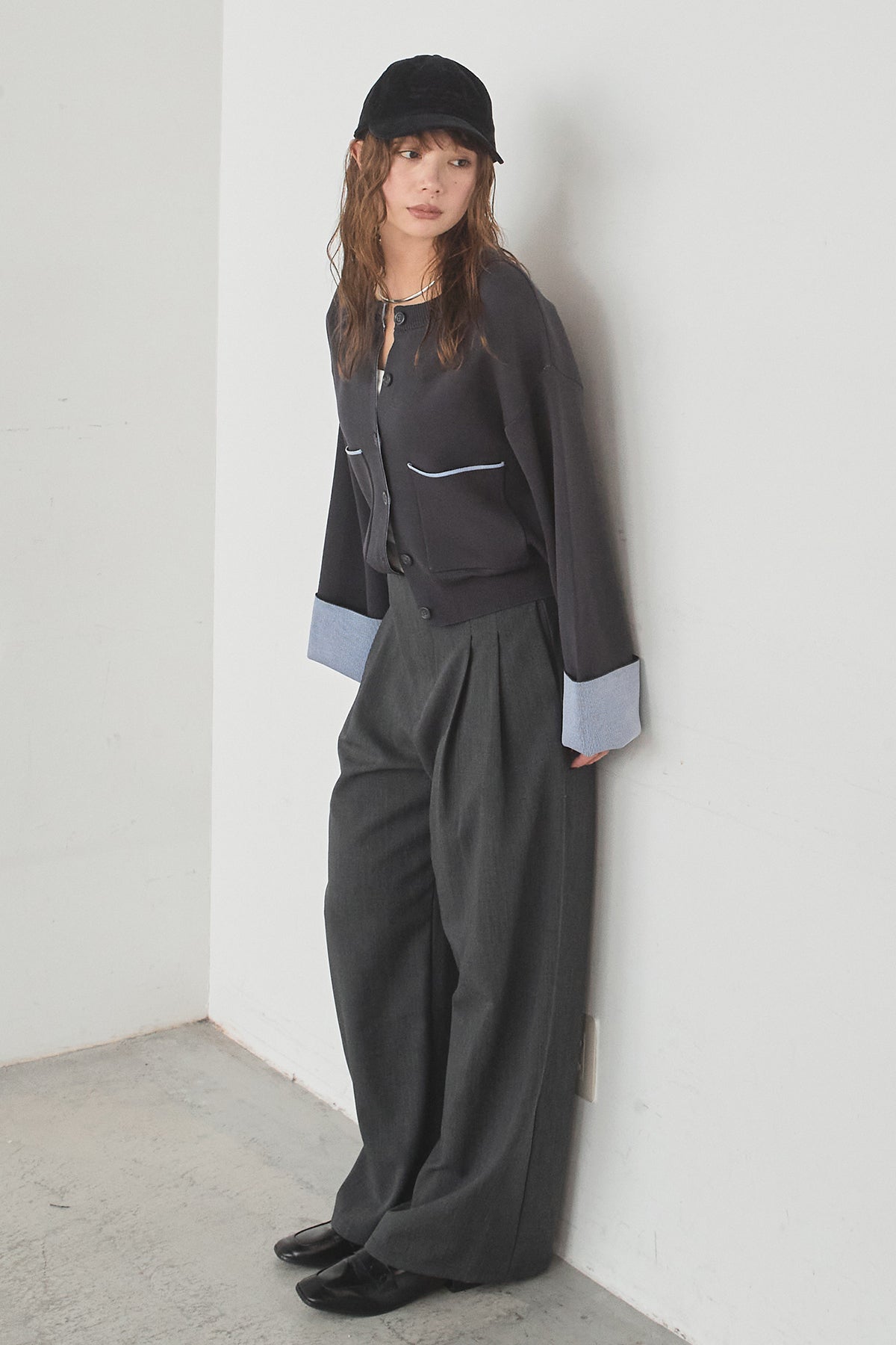 ほどよい落ち感のあるダブルフェイス仕立てが、上品な印象を引き立てるカーディガン。 配色のパイピングやカフスの切り替えが、シンプルな中にさりげないアクセントを添えています。 すっきりとした丈感で、ワイドパンツやスカートとも好相性。 きちんと感とリラックス感のバランスが取れた、日常に取り入れやすい一枚です。