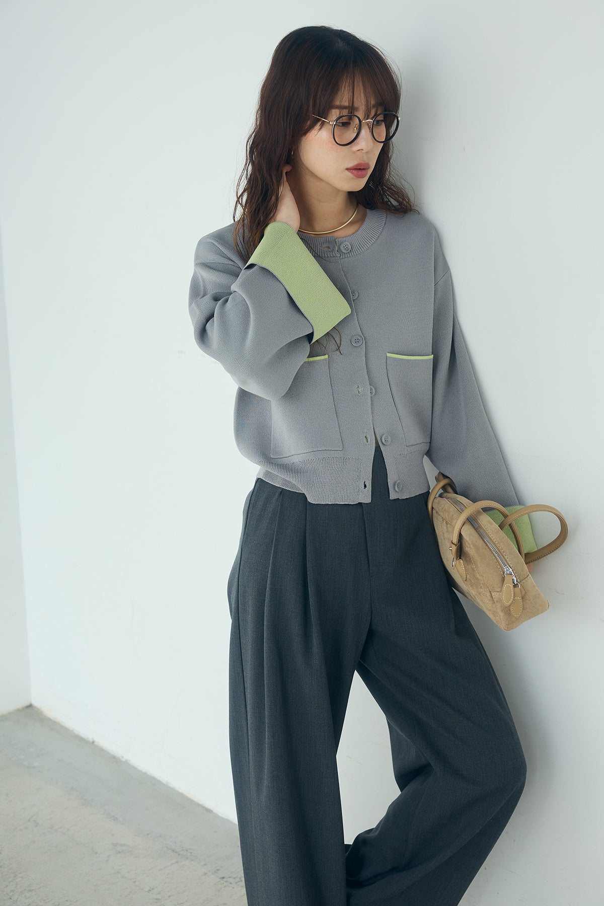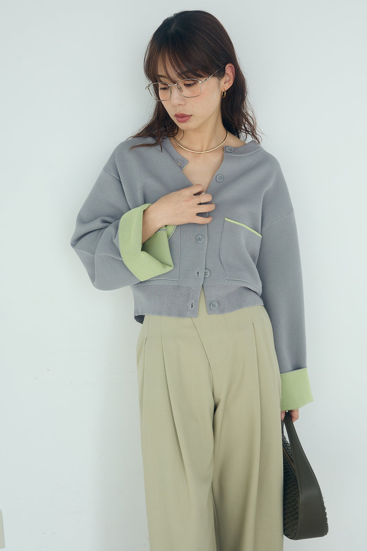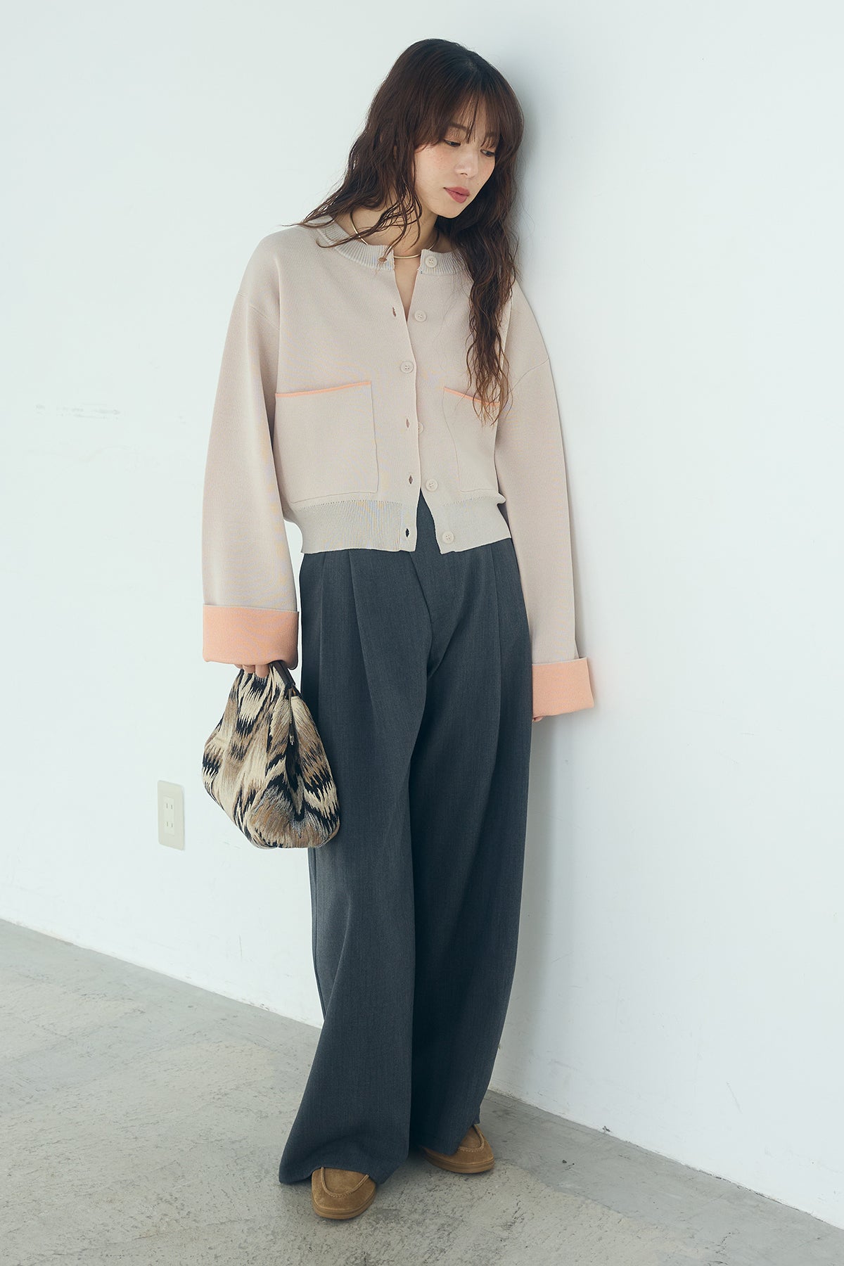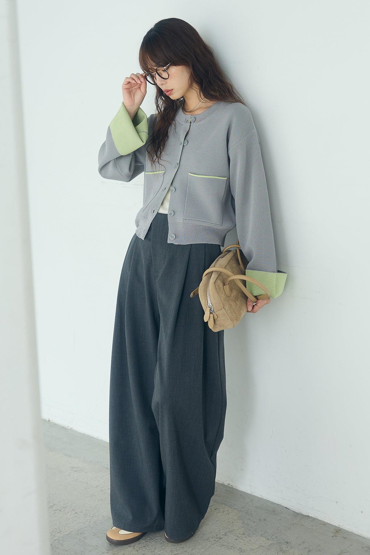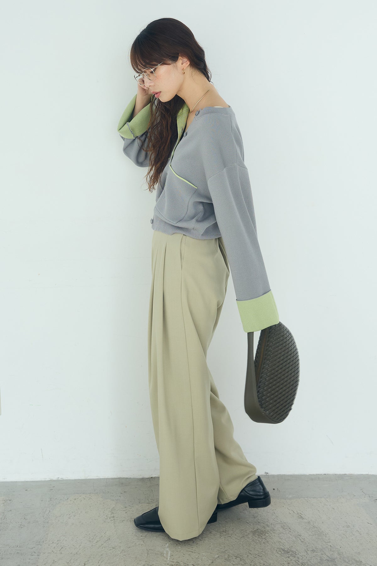 ほどよい落ち感のあるダブルフェイス仕立てが、上品な印象を引き立てるカーディガン。 配色のパイピングやカフスの切り替えが、シンプルな中にさりげないアクセントを添えています。 すっきりとした丈感で、ワイドパンツやスカートとも好相性。 きちんと感とリラックス感のバランスが取れた、日常に取り入れやすい一枚です。