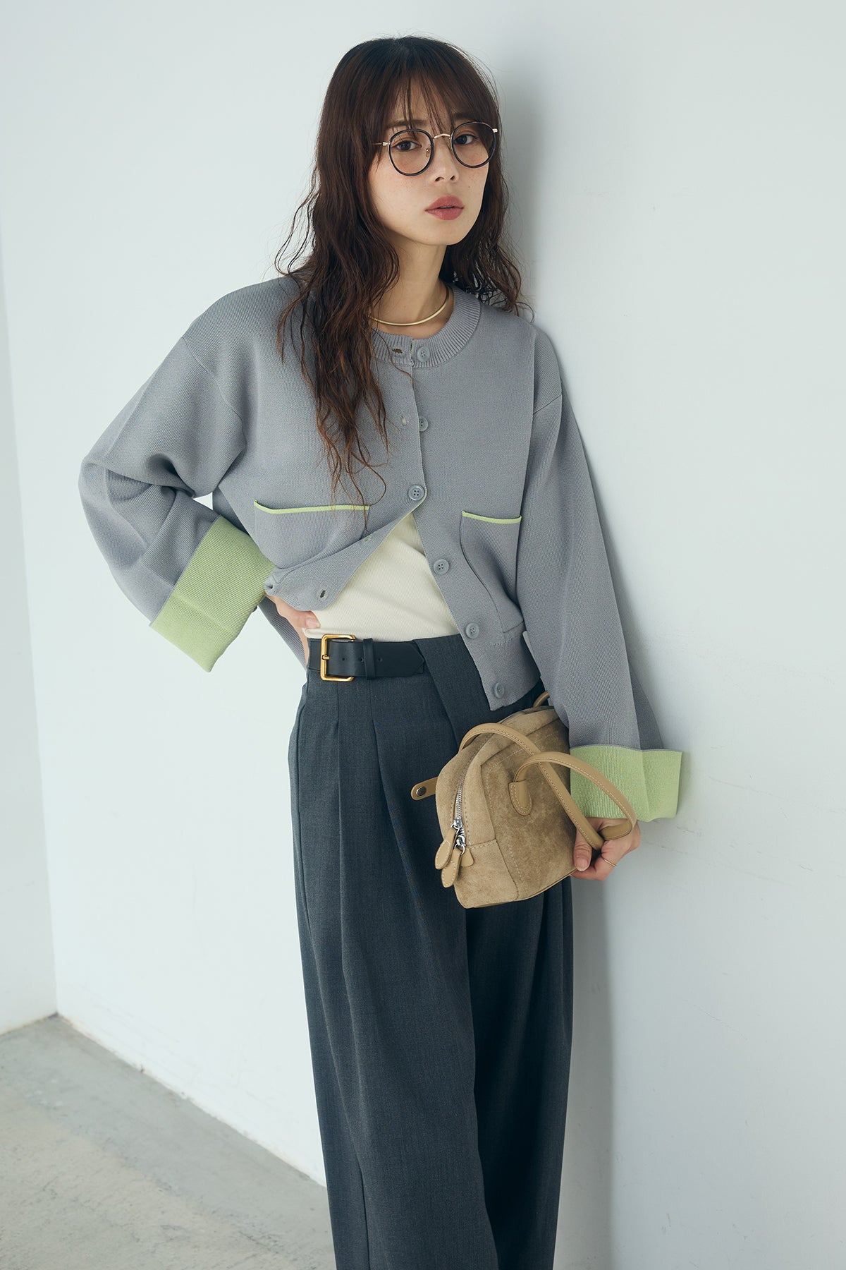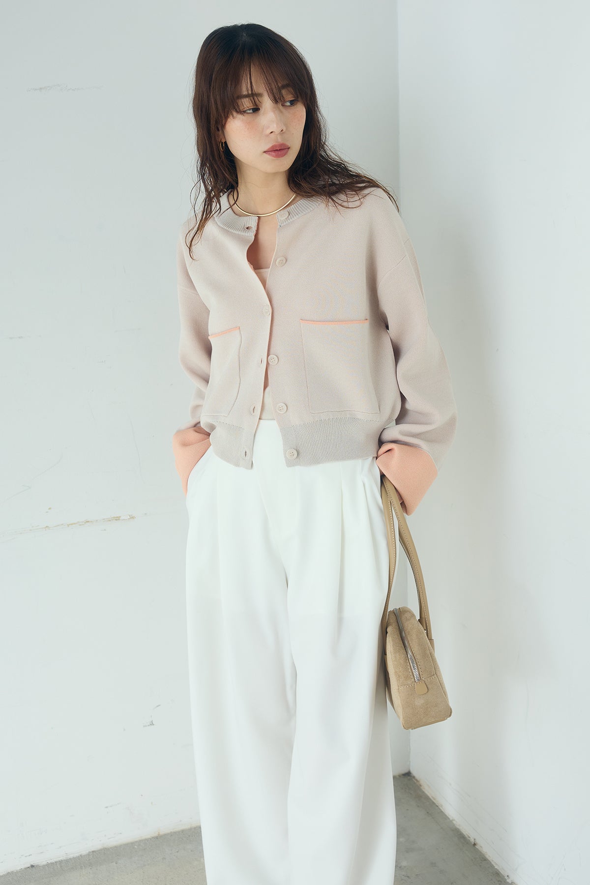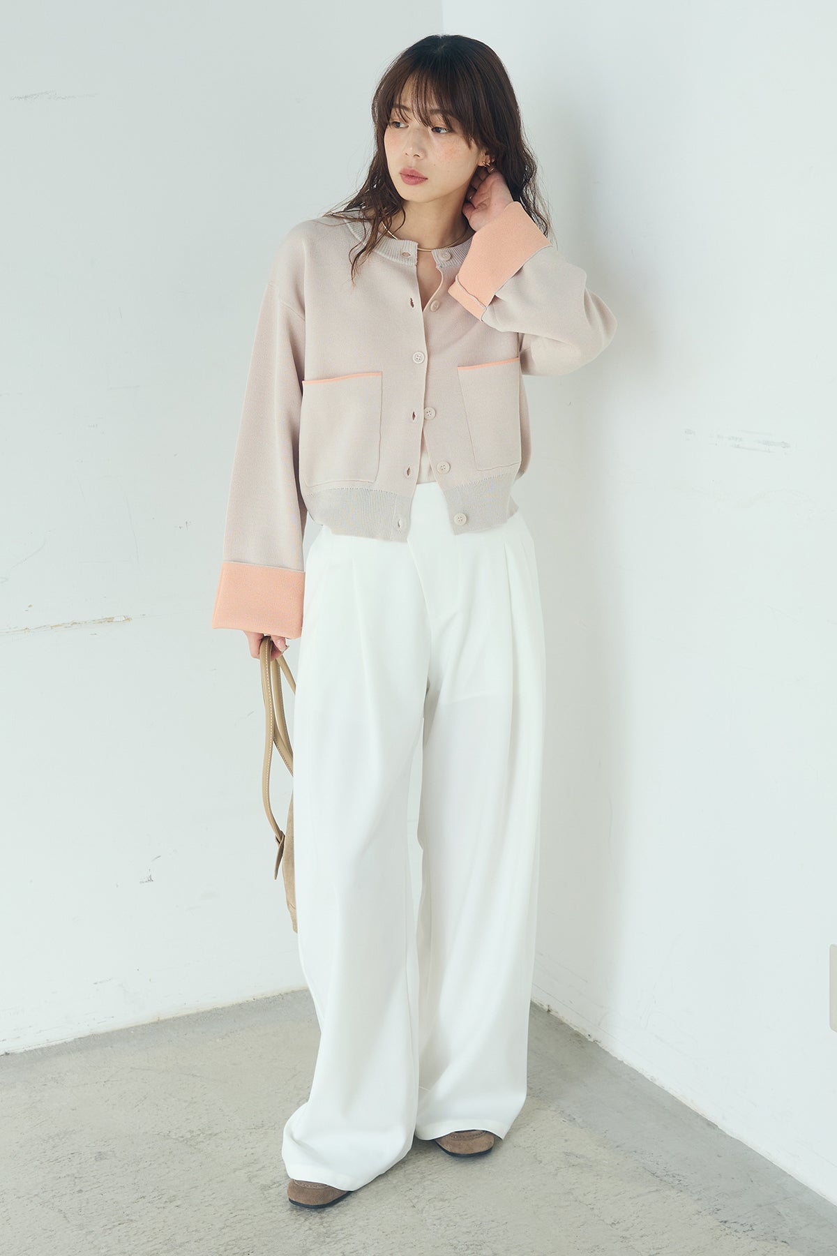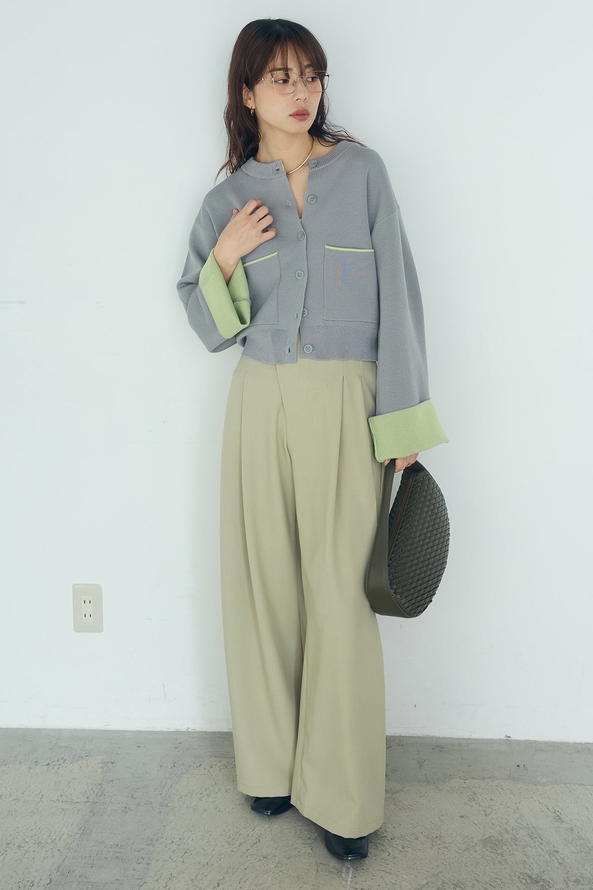 ほどよい落ち感のあるダブルフェイス仕立てが、上品な印象を引き立てるカーディガン。 配色のパイピングやカフスの切り替えが、シンプルな中にさりげないアクセントを添えています。 すっきりとした丈感で、ワイドパンツやスカートとも好相性。 きちんと感とリラックス感のバランスが取れた、日常に取り入れやすい一枚です。