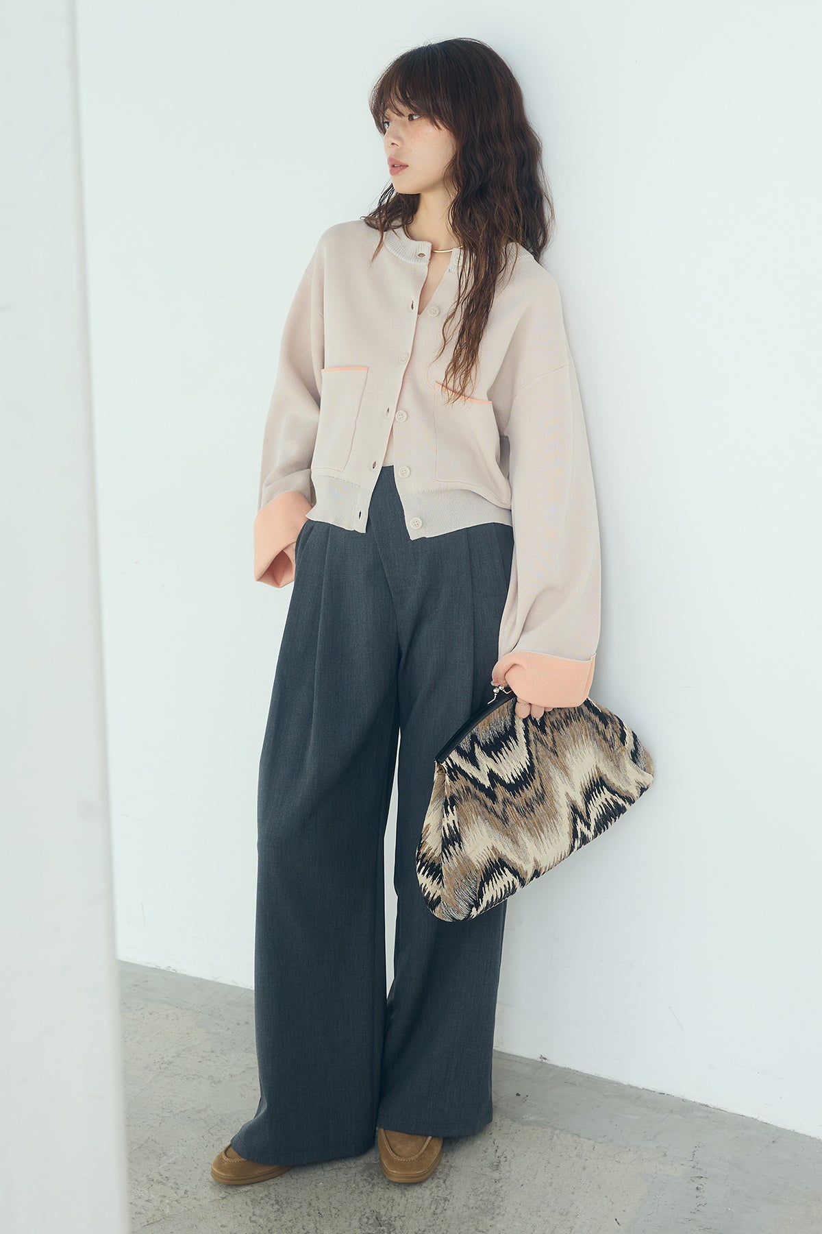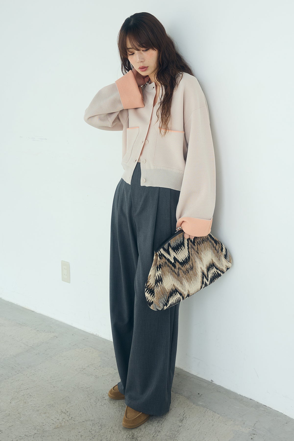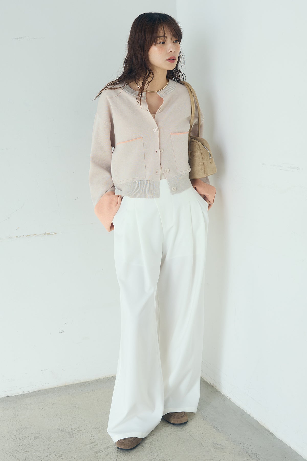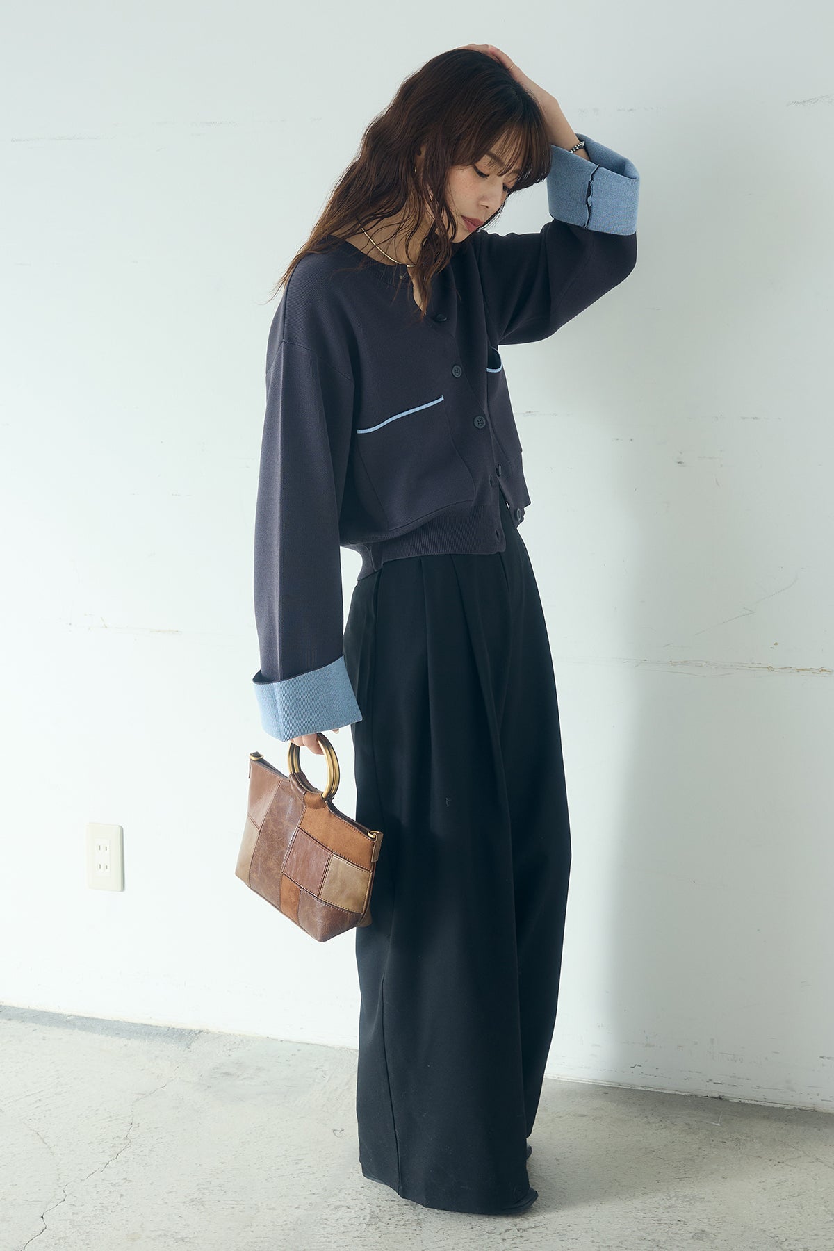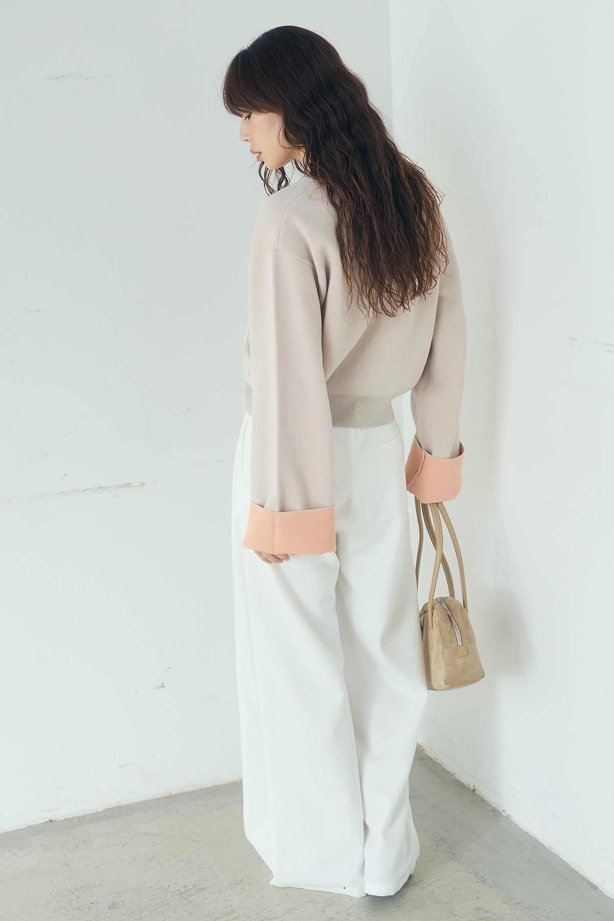 ほどよい落ち感のあるダブルフェイス仕立てが、上品な印象を引き立てるカーディガン。 配色のパイピングやカフスの切り替えが、シンプルな中にさりげないアクセントを添えています。 すっきりとした丈感で、ワイドパンツやスカートとも好相性。 きちんと感とリラックス感のバランスが取れた、日常に取り入れやすい一枚です。