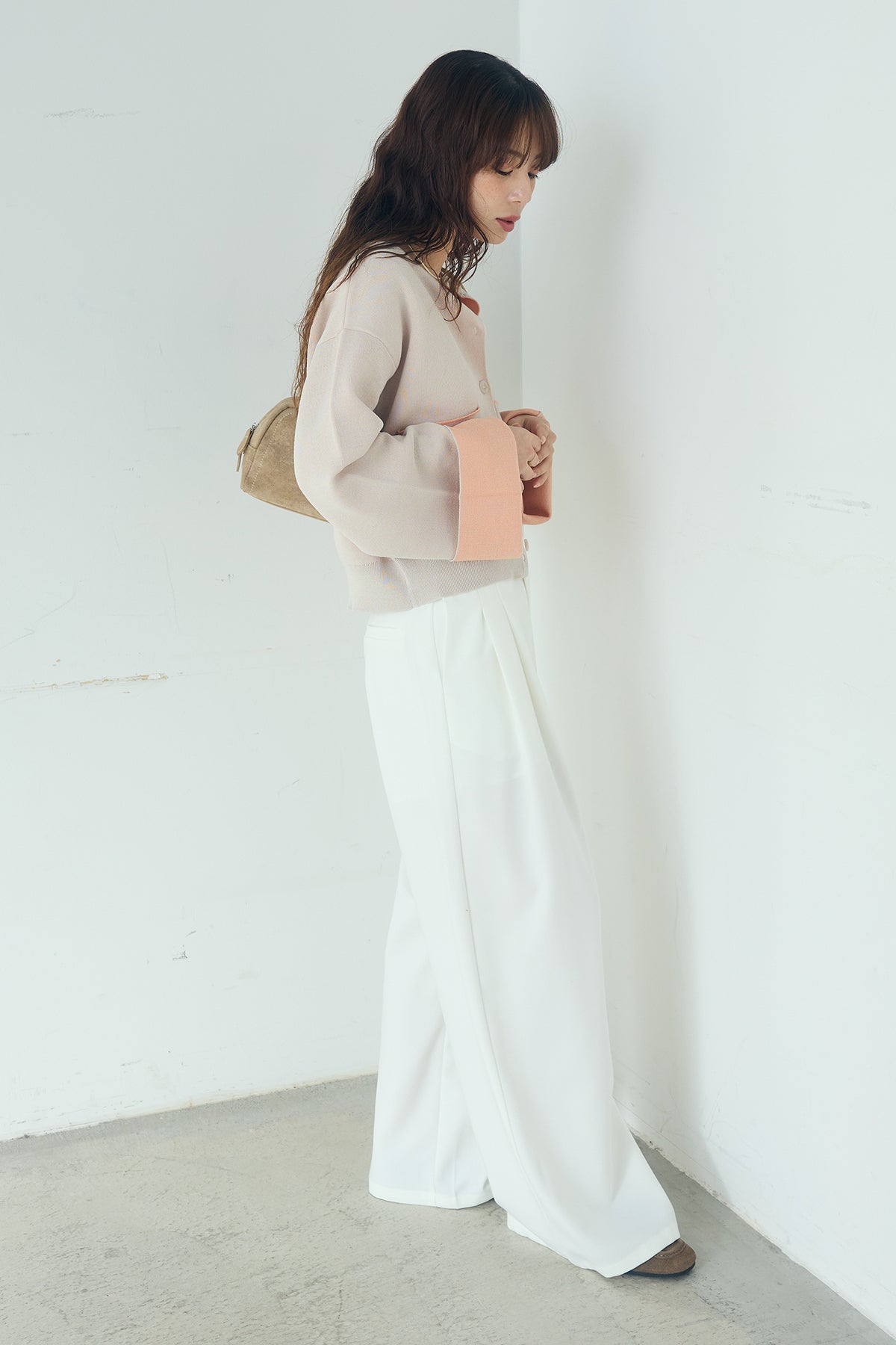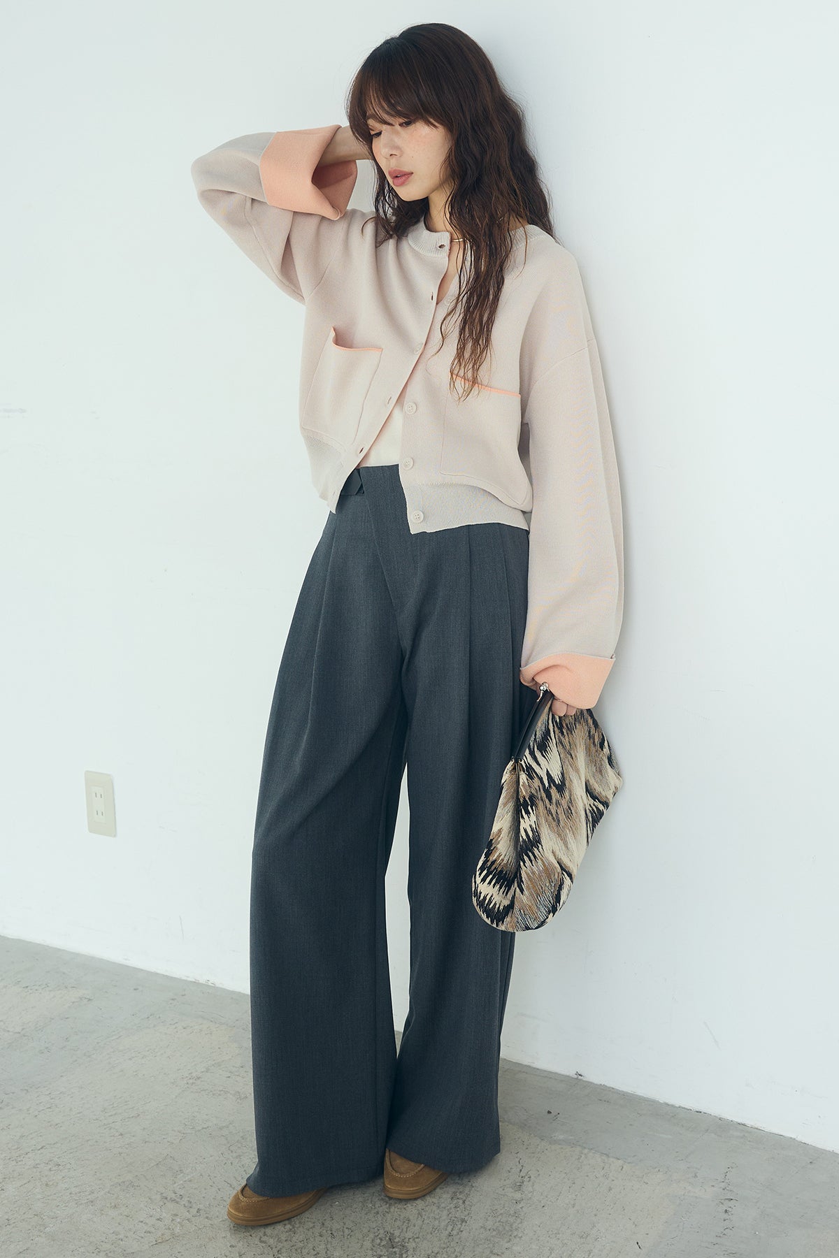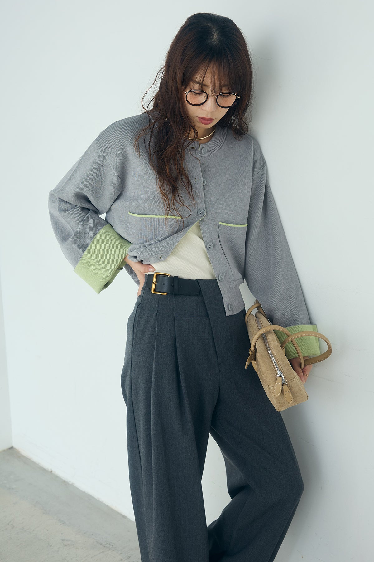 [SET]レーヨンポリダブルフェイスカーディガン+サイドベルトタック入りスラックス(2set)