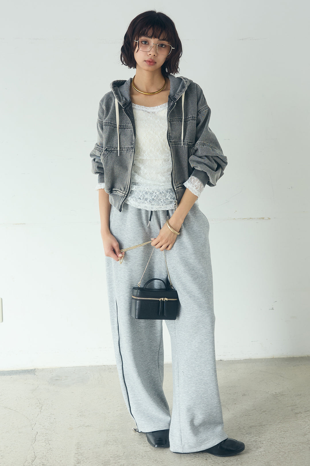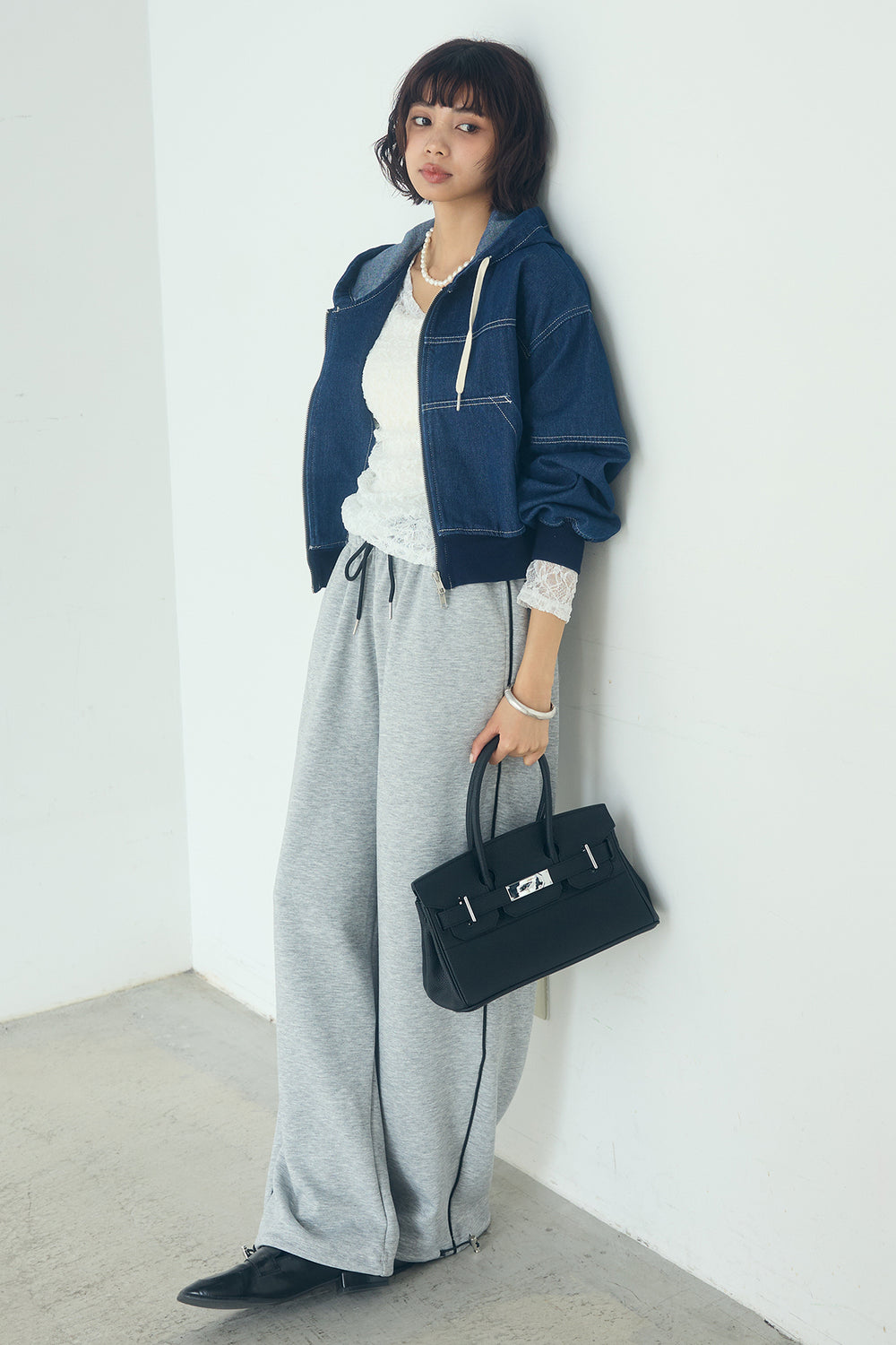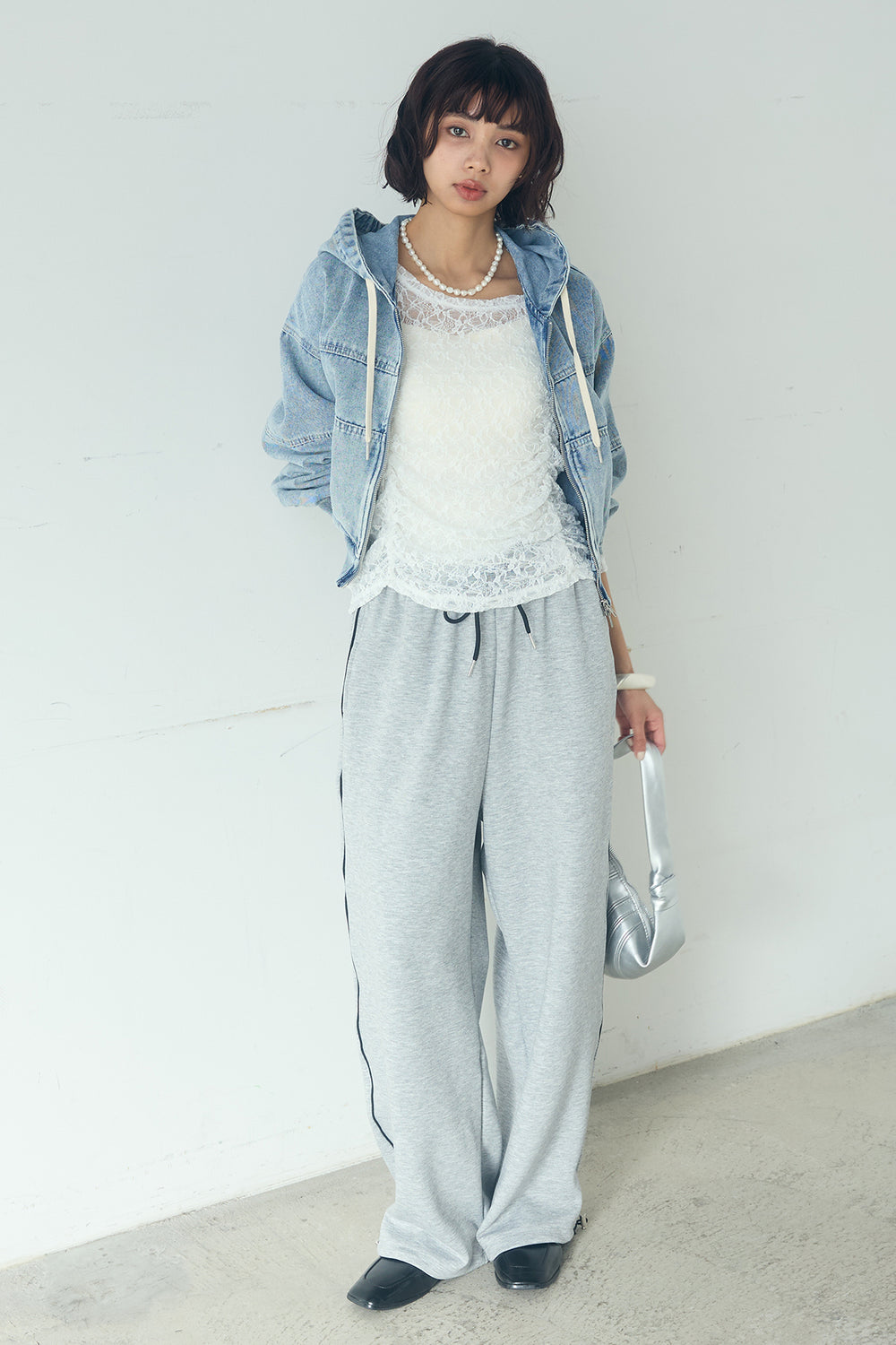 [SET]デニムダブルジップパーカーブルゾン+サイドラインスムーススウェットパンツ+レース刺繍ギャザーインナー(3set)