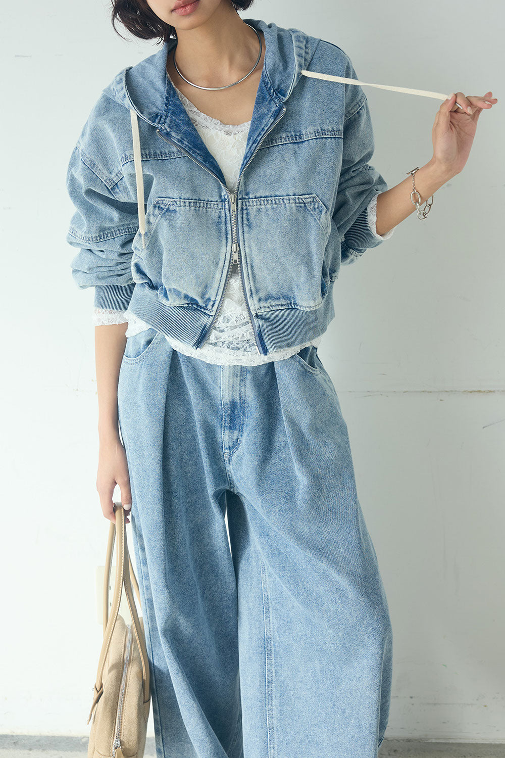 [SET]デニムダブルジップパーカーブルゾン+デニムタックカーブパンツ+レース刺繍ギャザーインナー(3set)