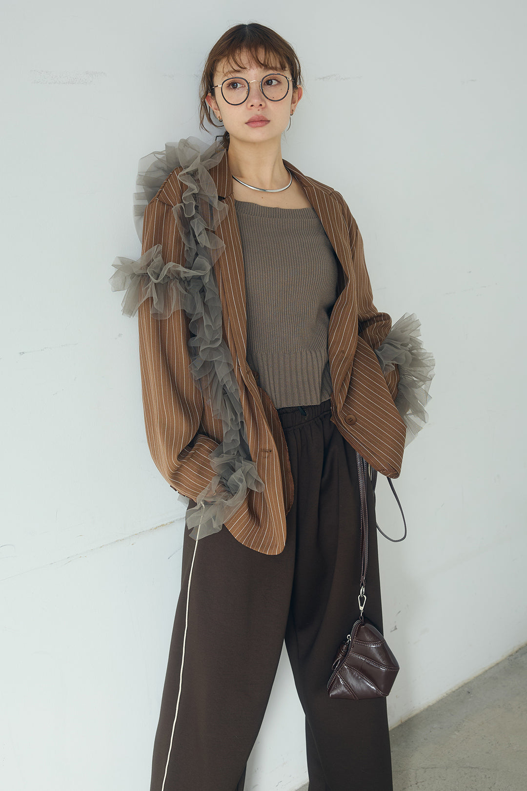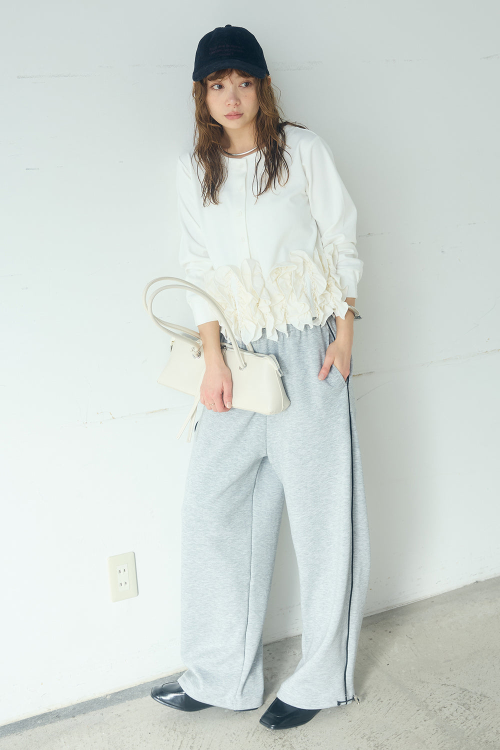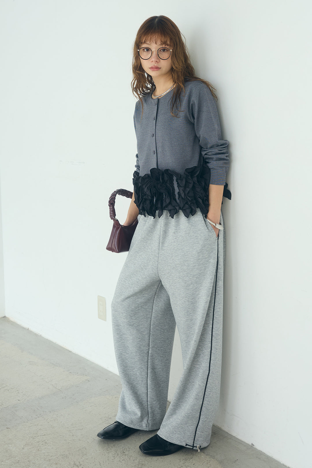[SET]異素材フリル&ポンチ前後2wayカーディガン+サイドラインスムーススウェットパンツ(2set)