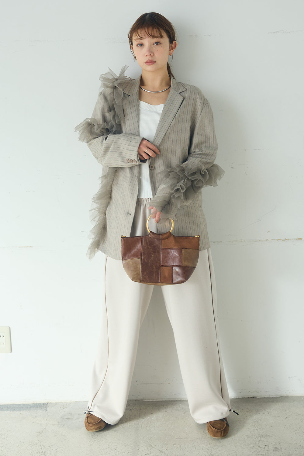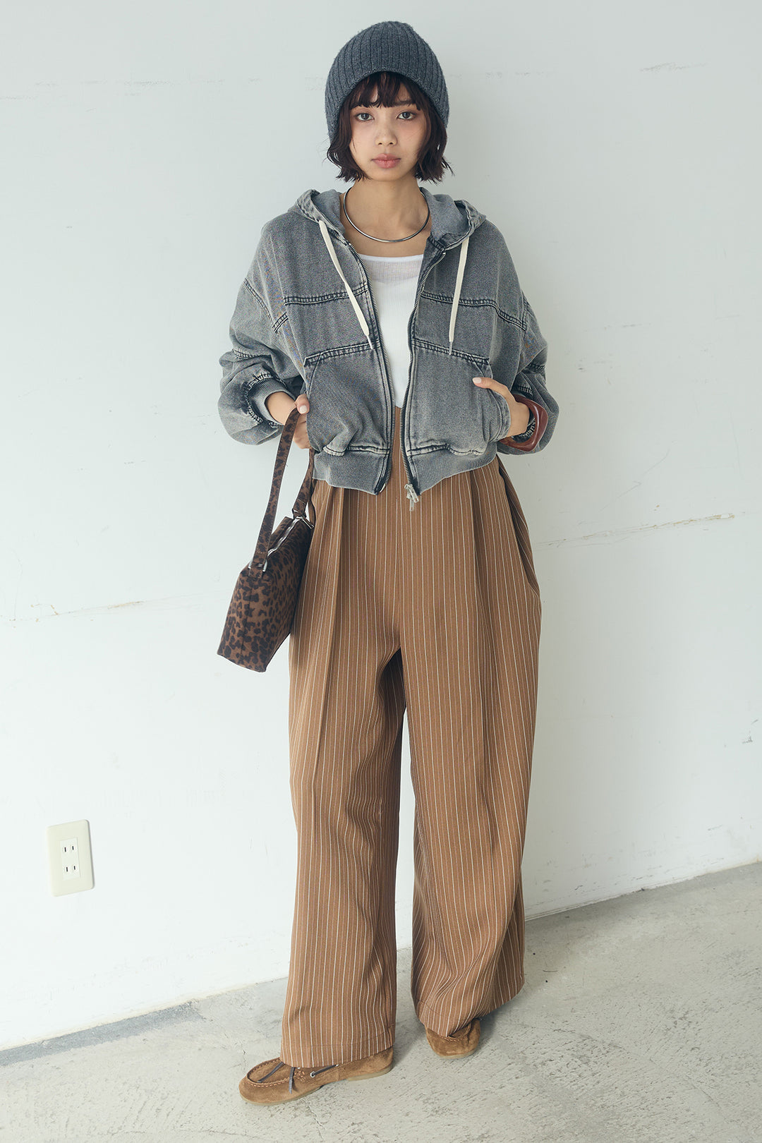 [SET]デニムダブルジップパーカーブルゾン+ツイード×デニムハイウエストラインロングパンツ(2set)