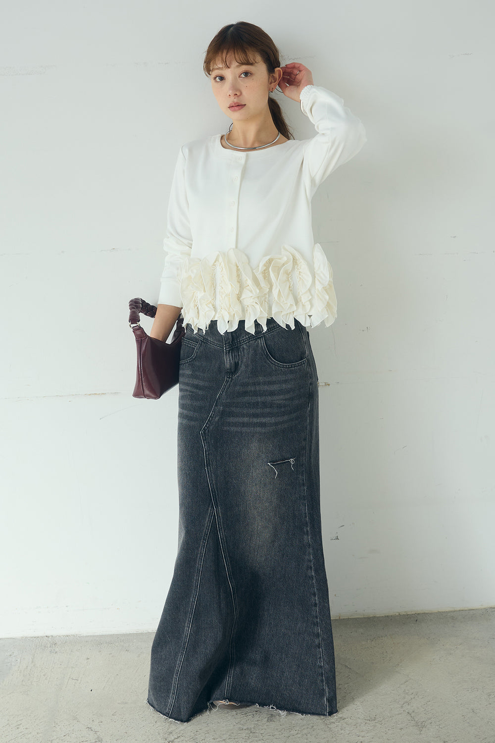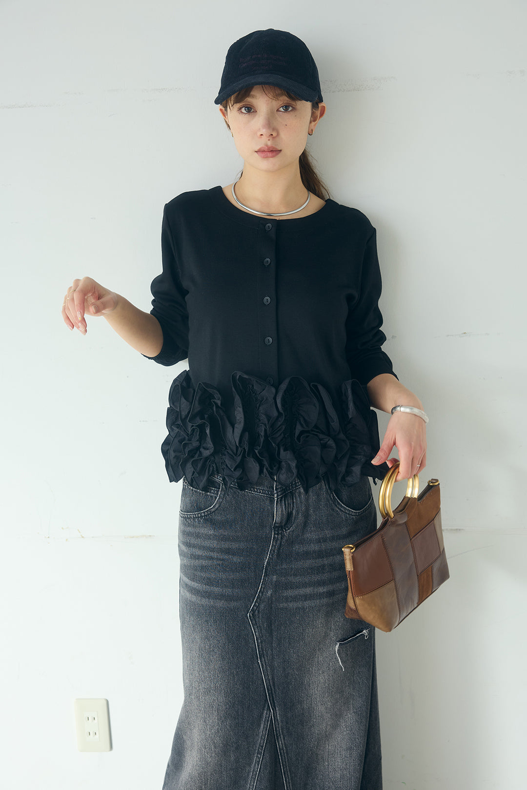 [SET]異素材フリル&ポンチ前後2wayカーディガン+Aラインデニムスカート(2set)