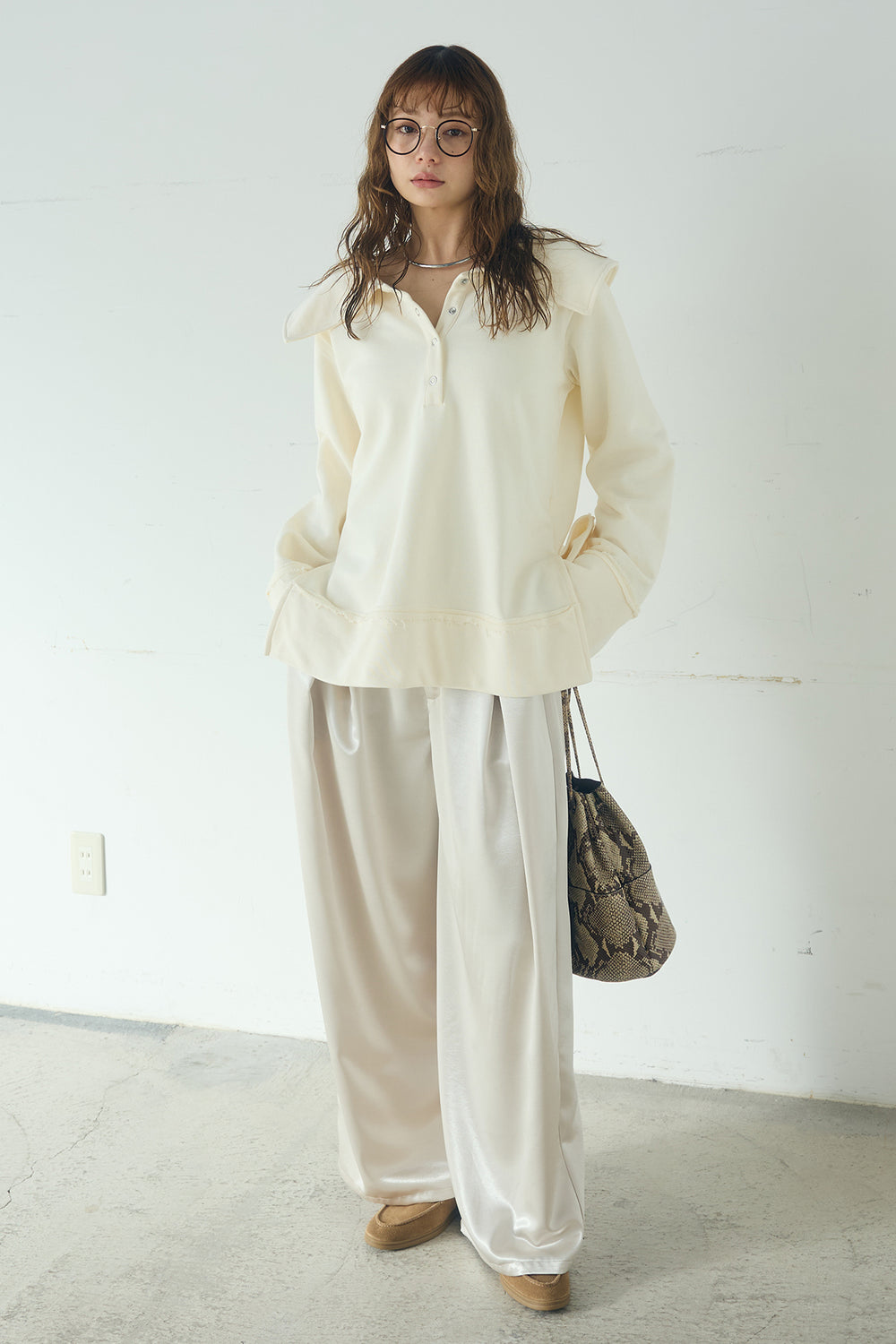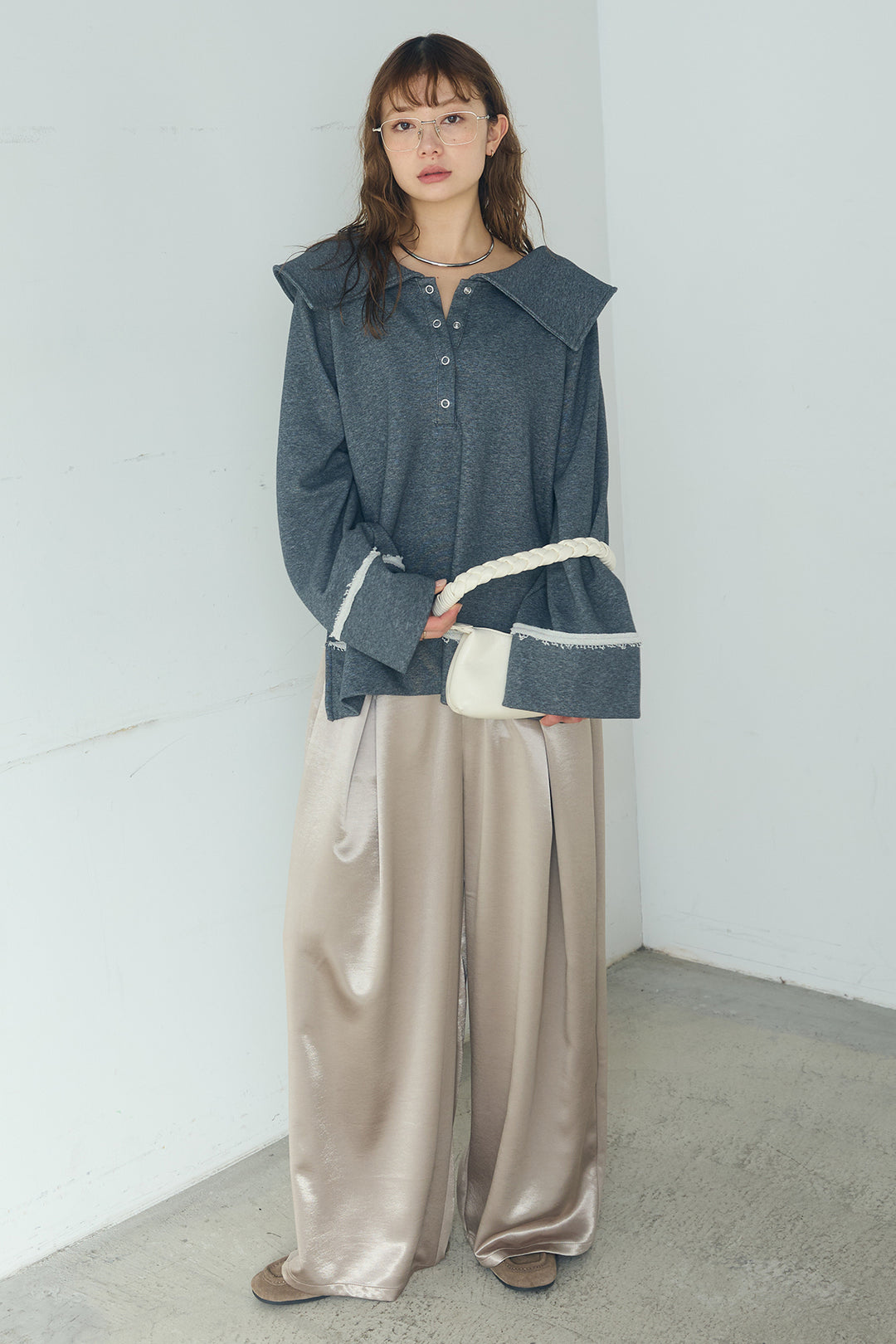 [SET]ビッグカラー2WAYスウェットトップス+サテンタックワイドパンツ(2set)
