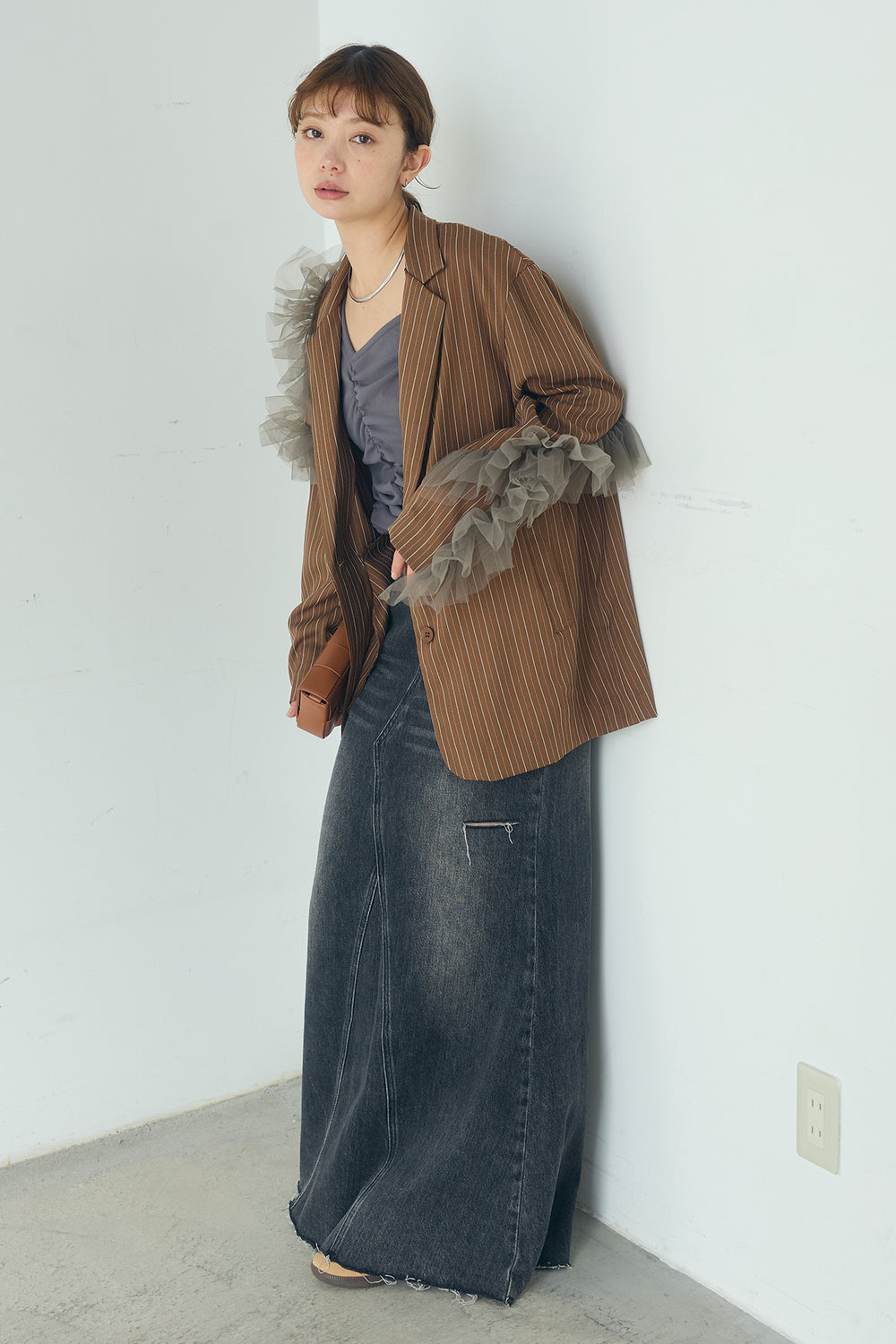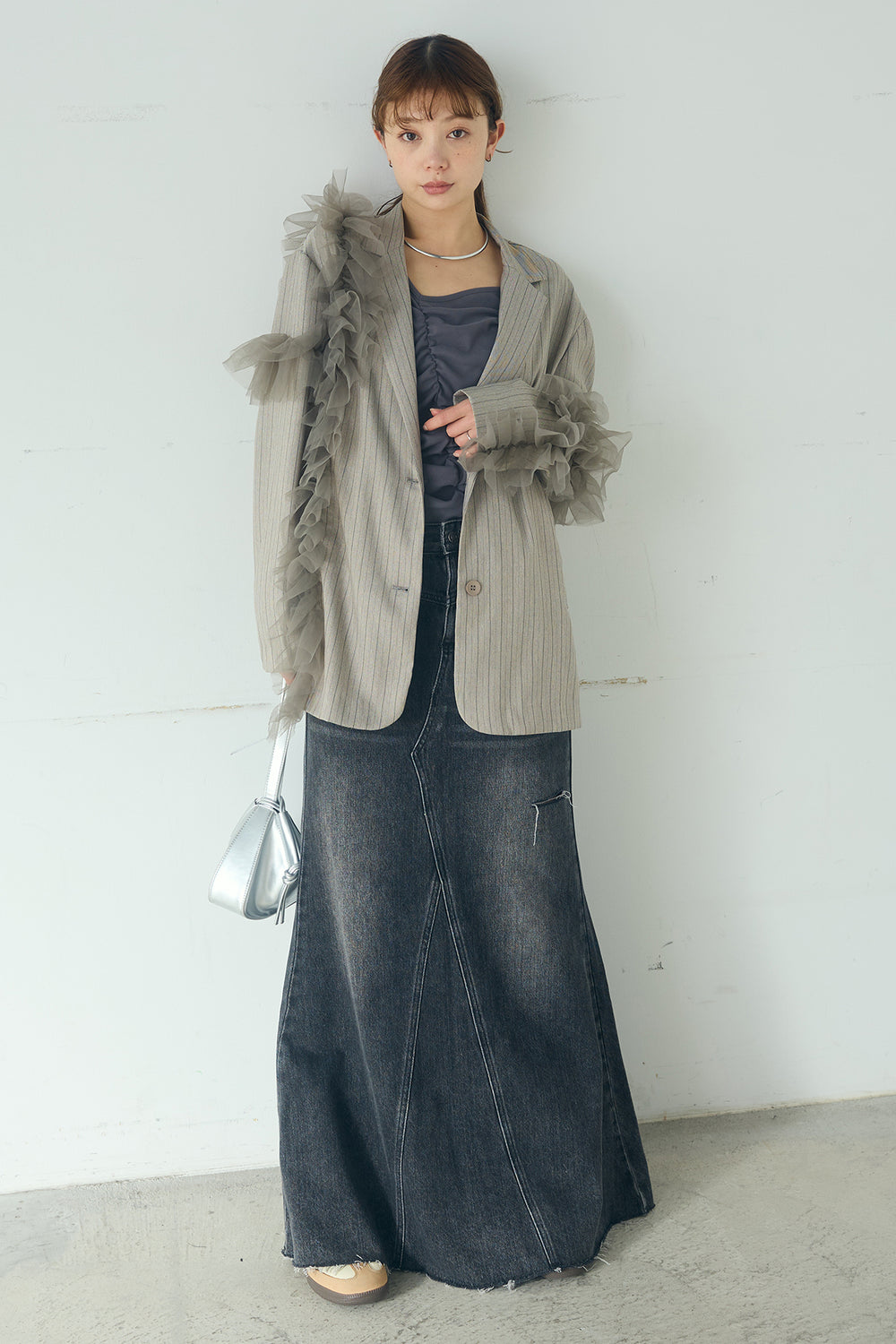 [SET]チュールヘリンボーンストライプジャケット+Aラインデニムスカート(2set)