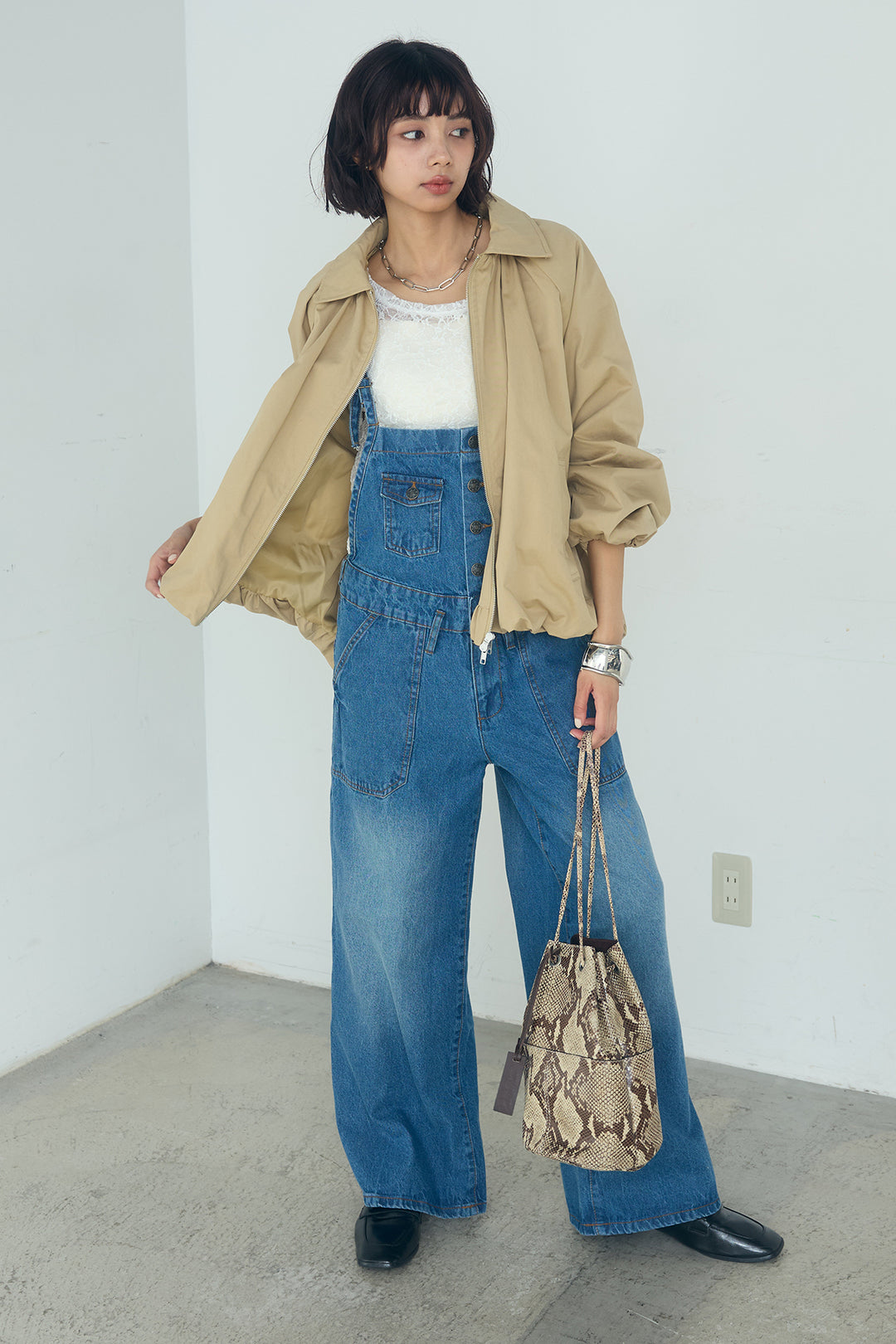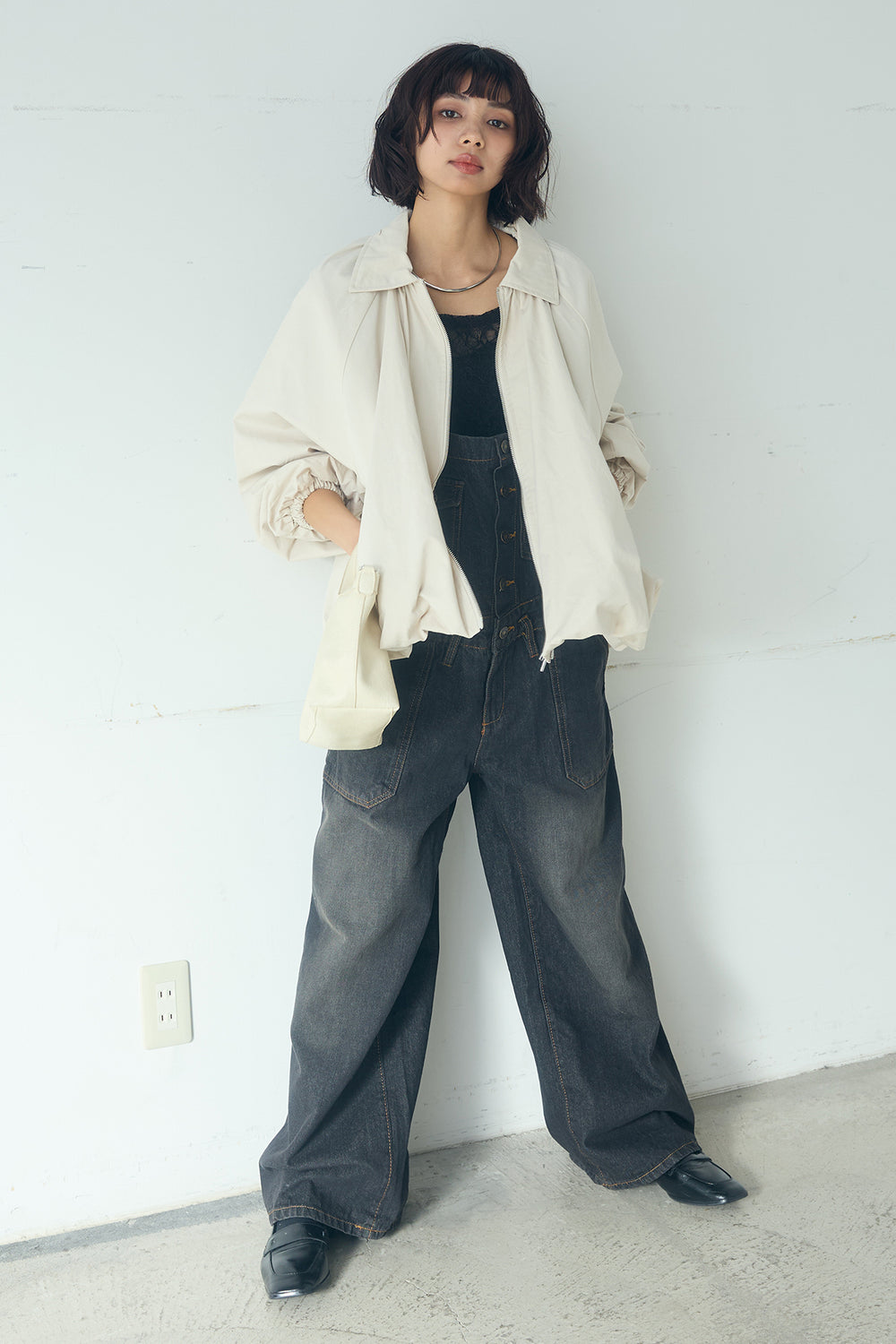 [SET]綿ツイルバルーンジャケット+デニムサロペットワイドパンツ+レース刺繍ギャザーインナー(3set)