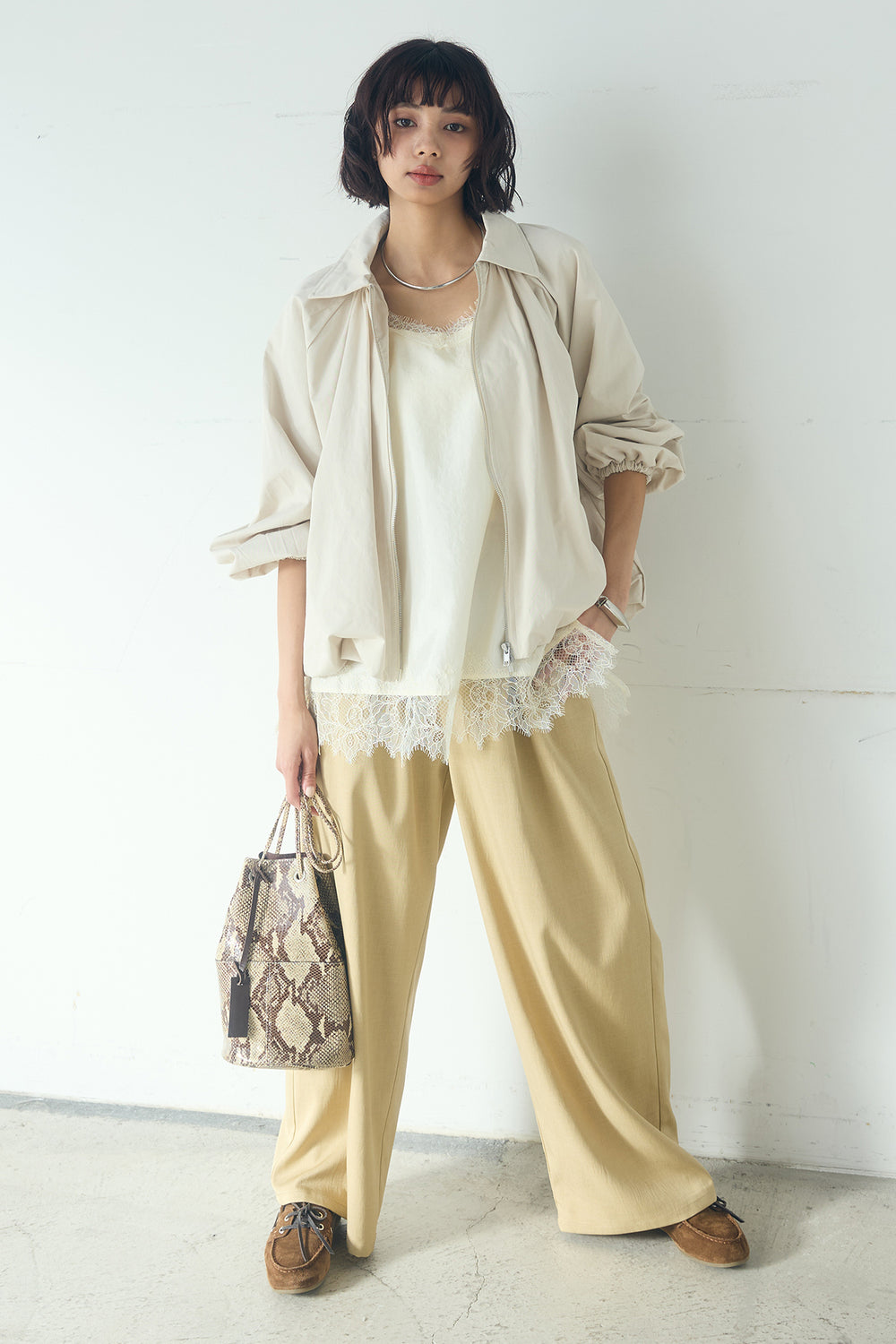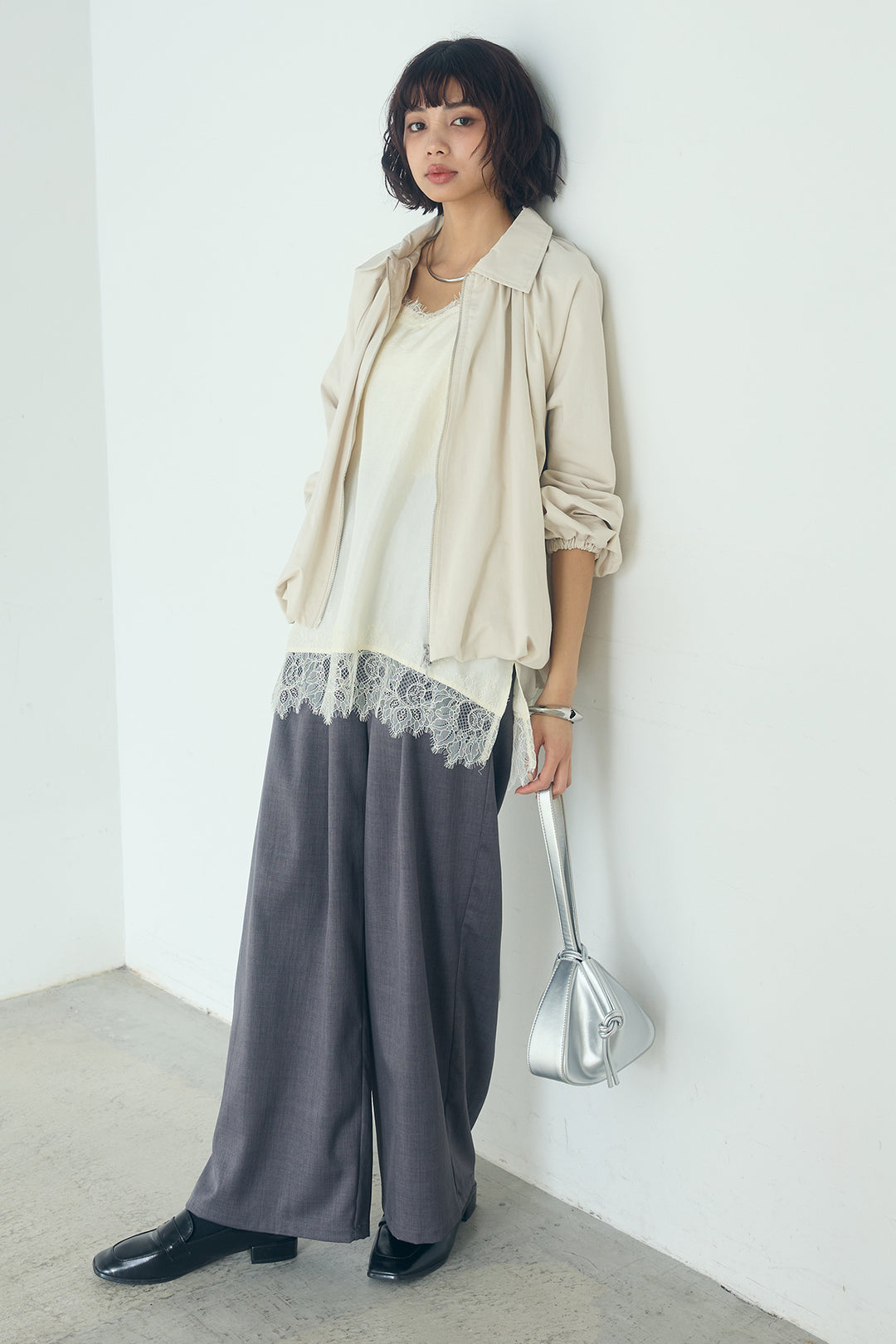 [SET]綿ツイルバルーンジャケット+ツイルメニータックパンツ+レースサテンキャミインナー(3set)