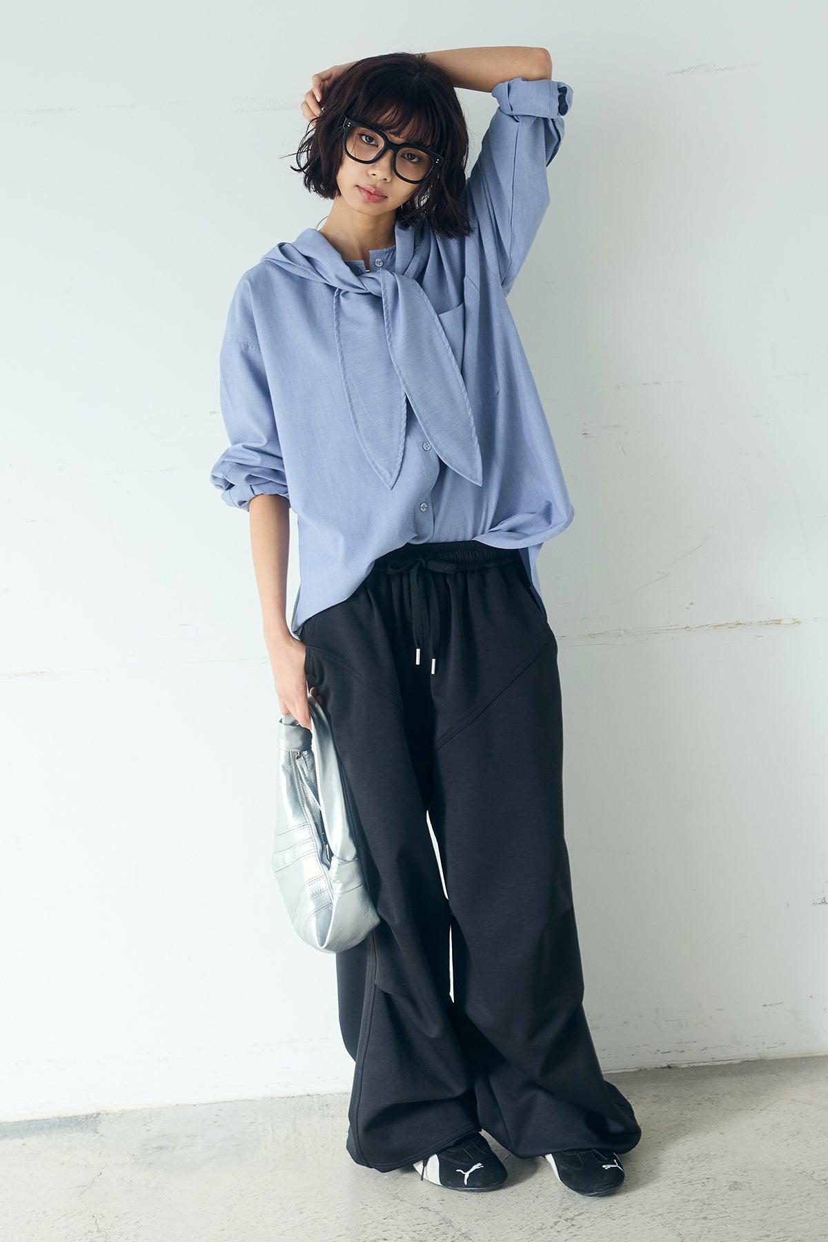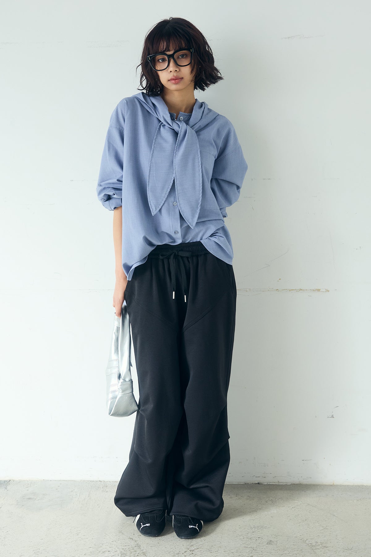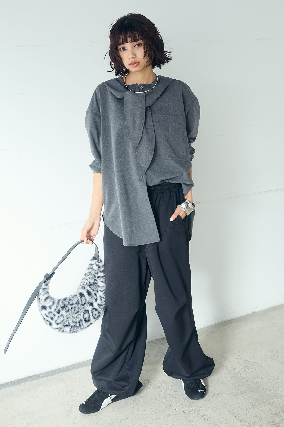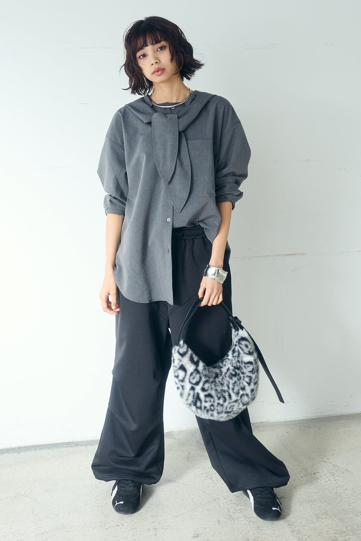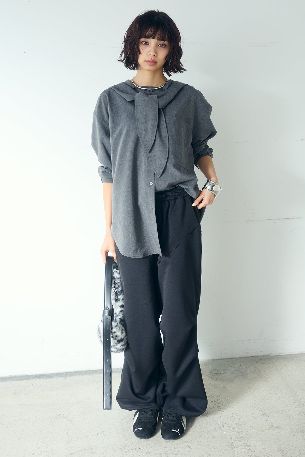 [SET]無地タイ付フーディーBIGシャツ+ランダムタックデザインワイドパンツ(2set)