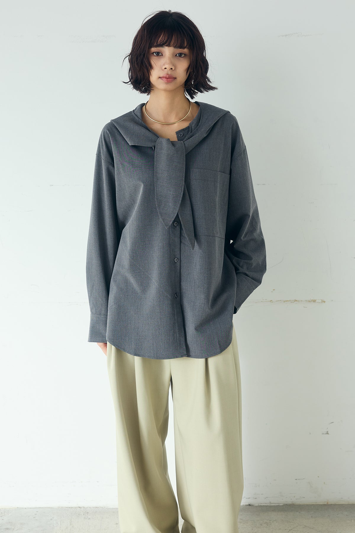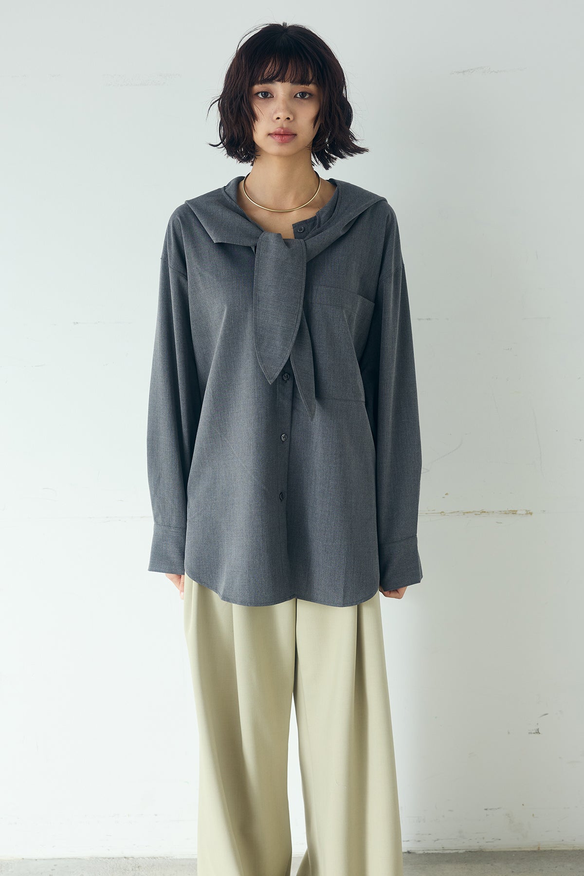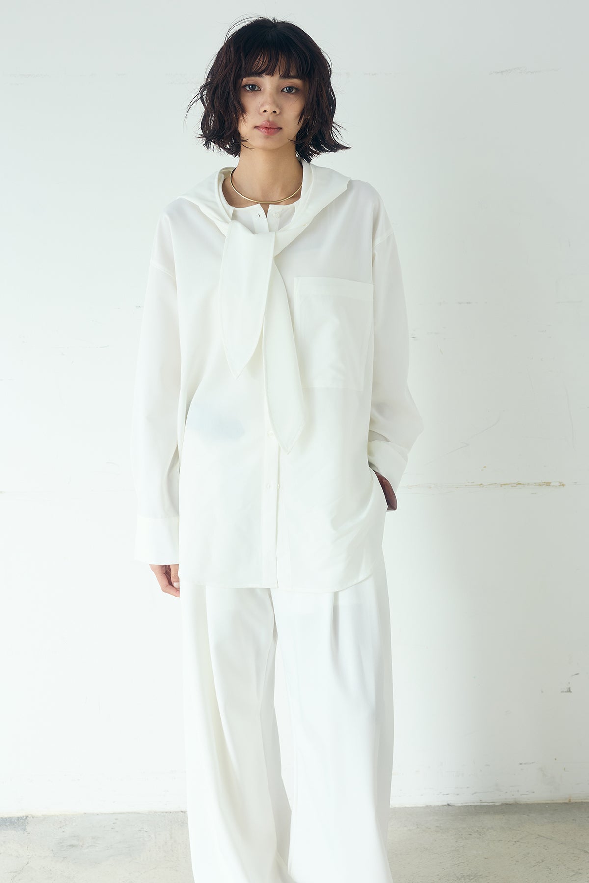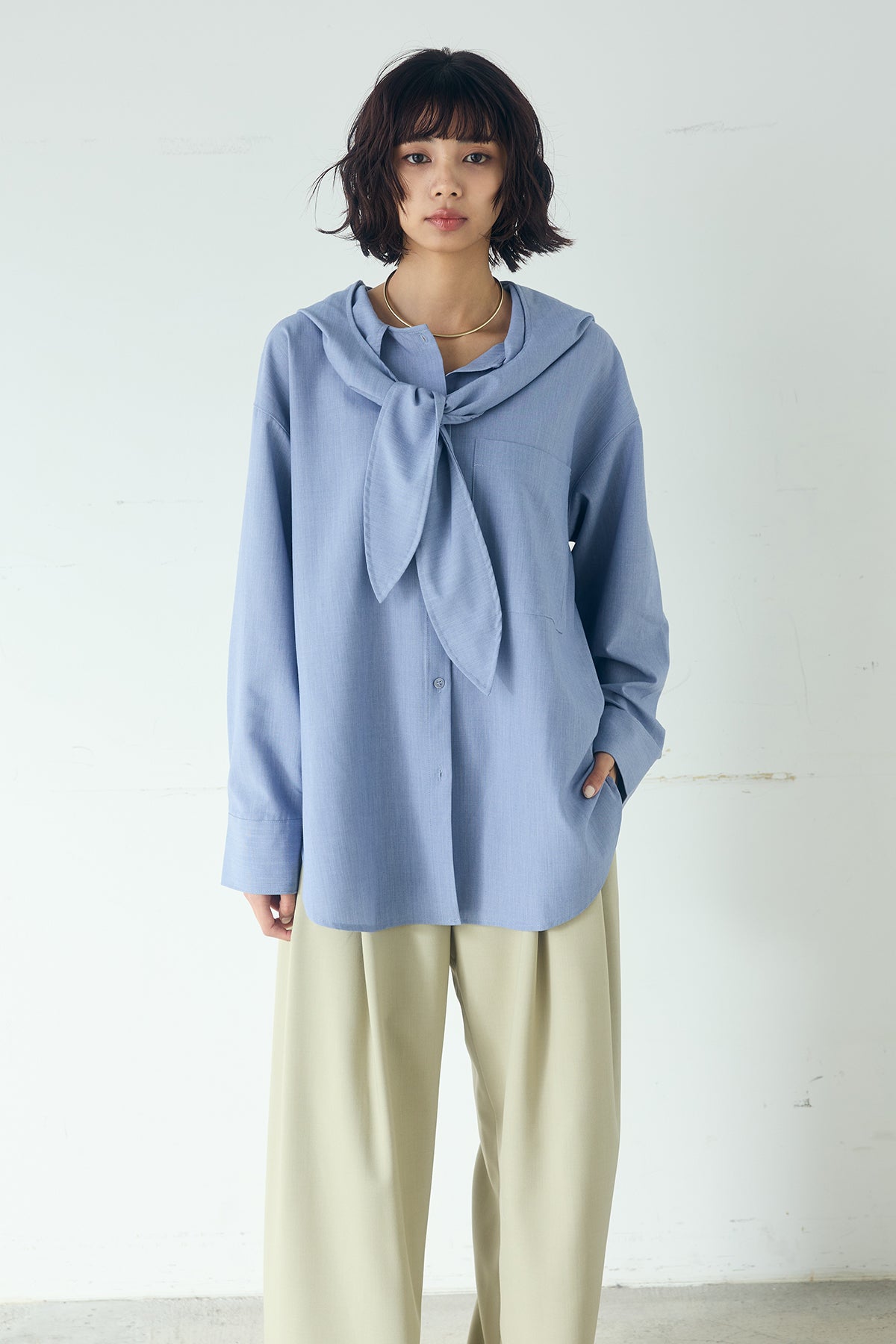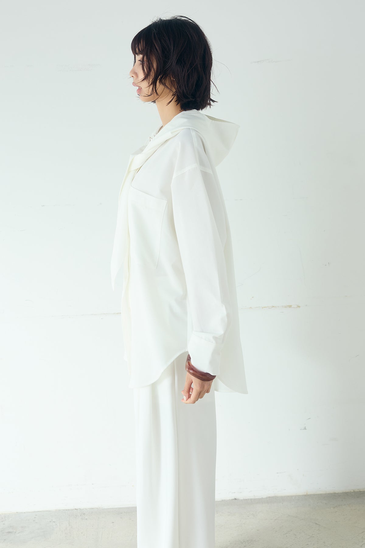 無地タイ付フーディーBIGシャツ クリーンな無地デザインにタイディテールを組み合わせた、存在感のあるビッグシルエットシャツ。 ゆとりのあるサイズ感が自然な抜けを生み、タイを垂らしたり軽く結んだりとアレンジ次第で印象の変化を楽しめます。フーディーデザインがほどよくカジュアルさを加え、パンツにもスカートにも合わせやすい一枚。シンプルながらも着こなしに表情を添え、日常のスタイリングに取り入れやすいアイテムです。