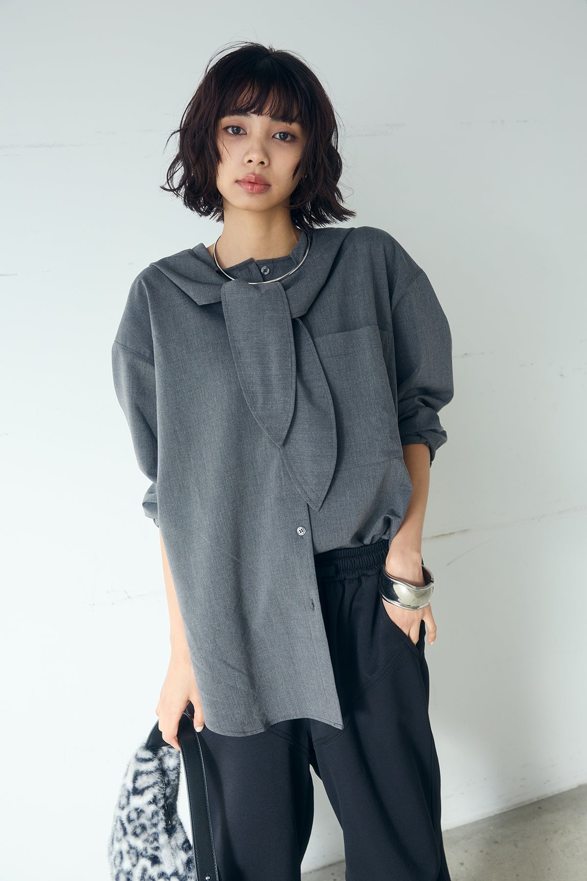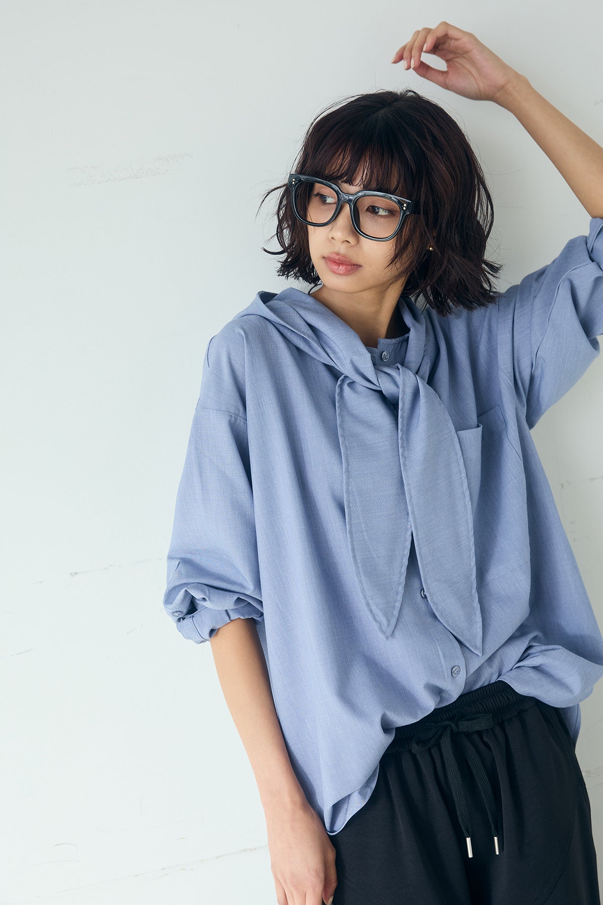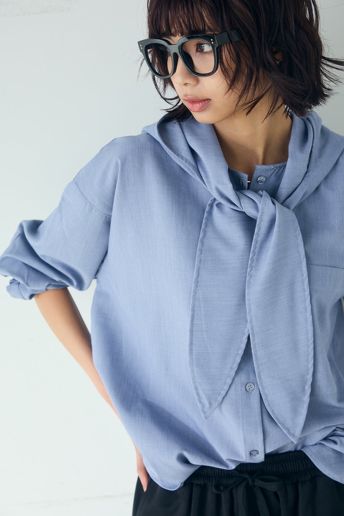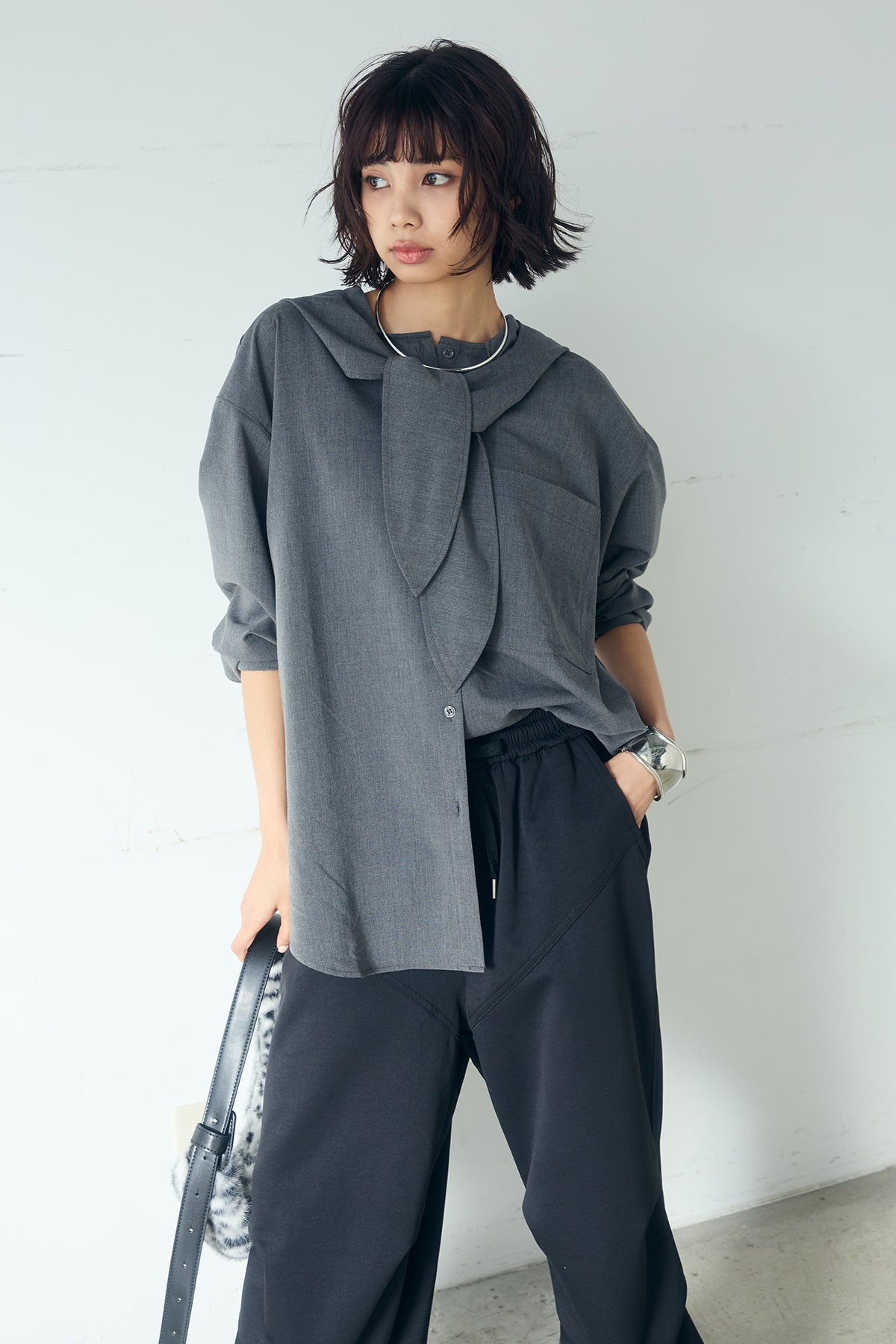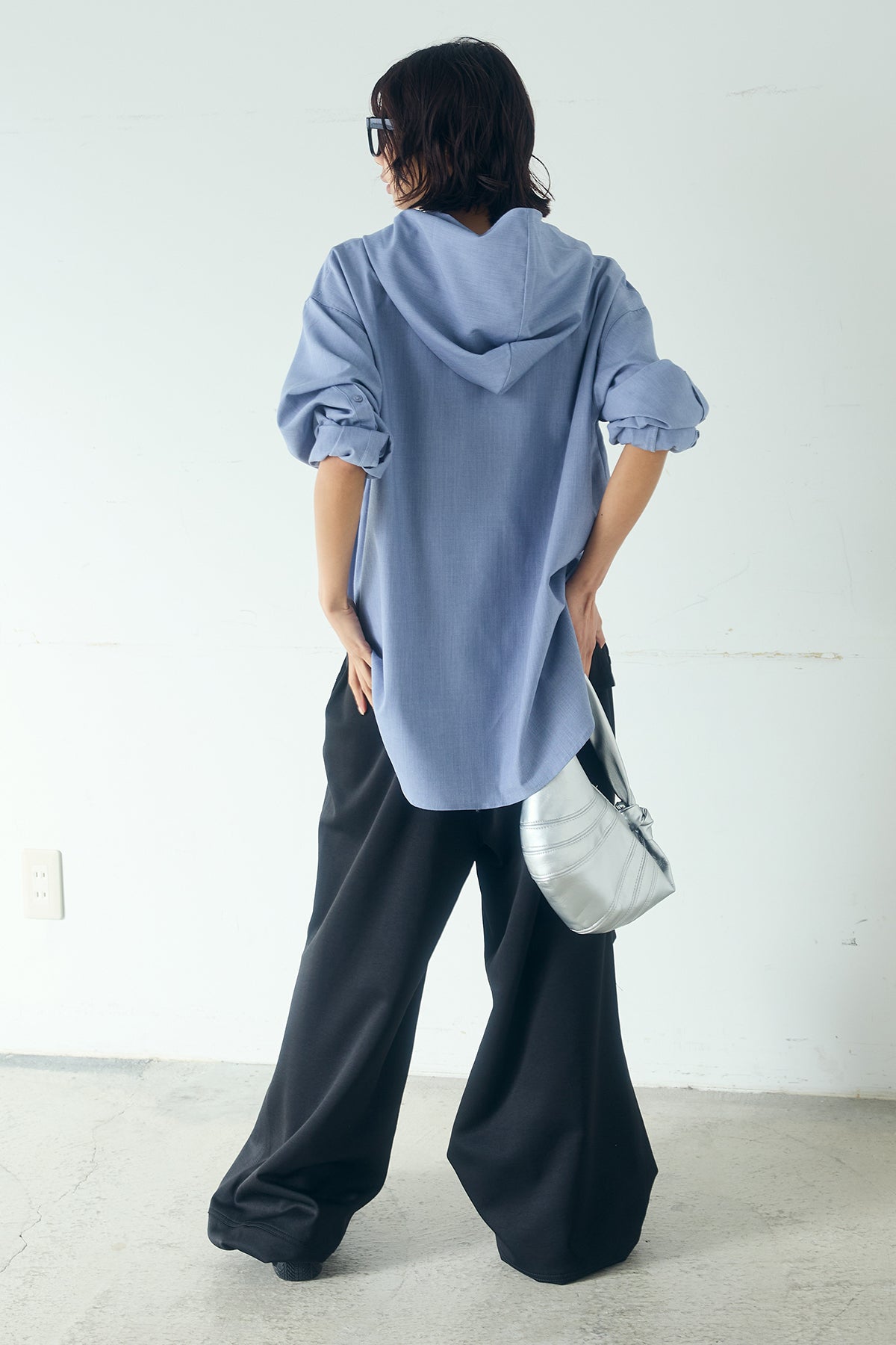 無地タイ付フーディーBIGシャツ クリーンな無地デザインにタイディテールを組み合わせた、存在感のあるビッグシルエットシャツ。 ゆとりのあるサイズ感が自然な抜けを生み、タイを垂らしたり軽く結んだりとアレンジ次第で印象の変化を楽しめます。フーディーデザインがほどよくカジュアルさを加え、パンツにもスカートにも合わせやすい一枚。シンプルながらも着こなしに表情を添え、日常のスタイリングに取り入れやすいアイテムです。