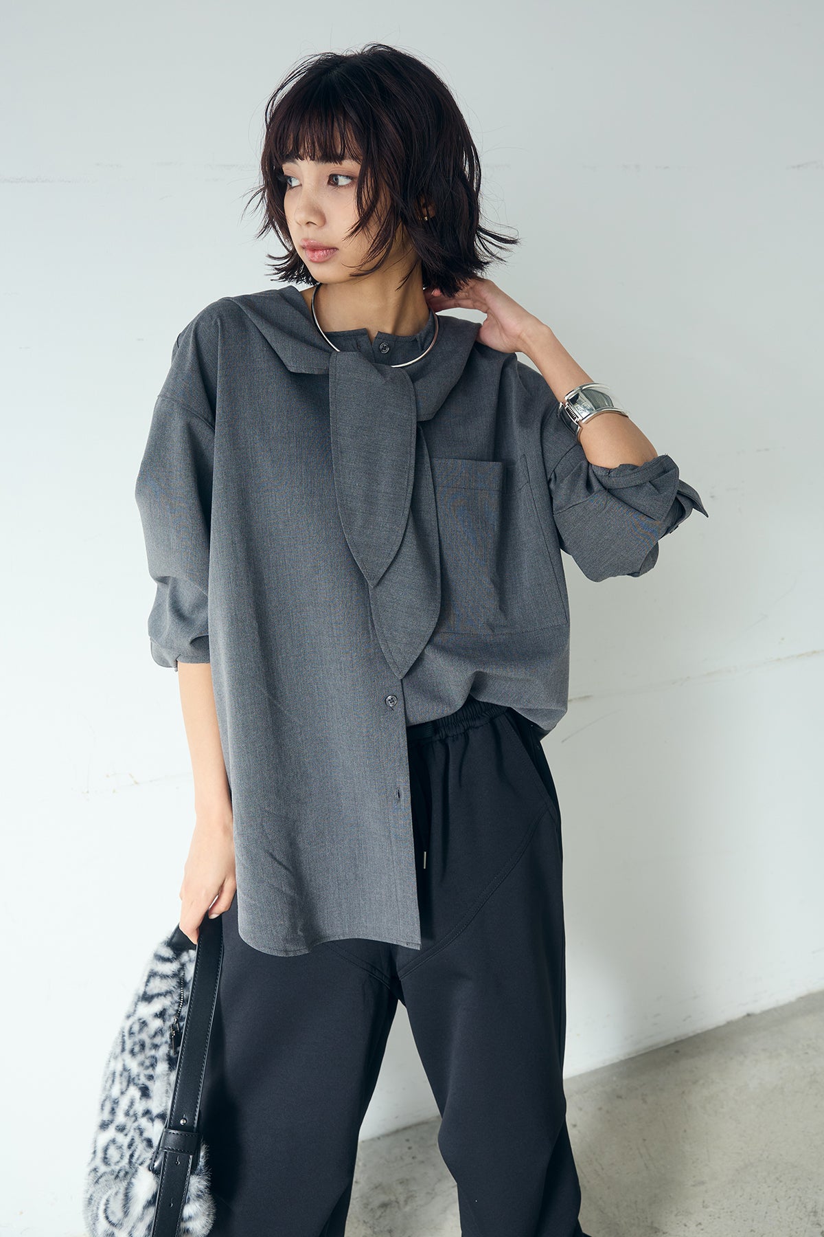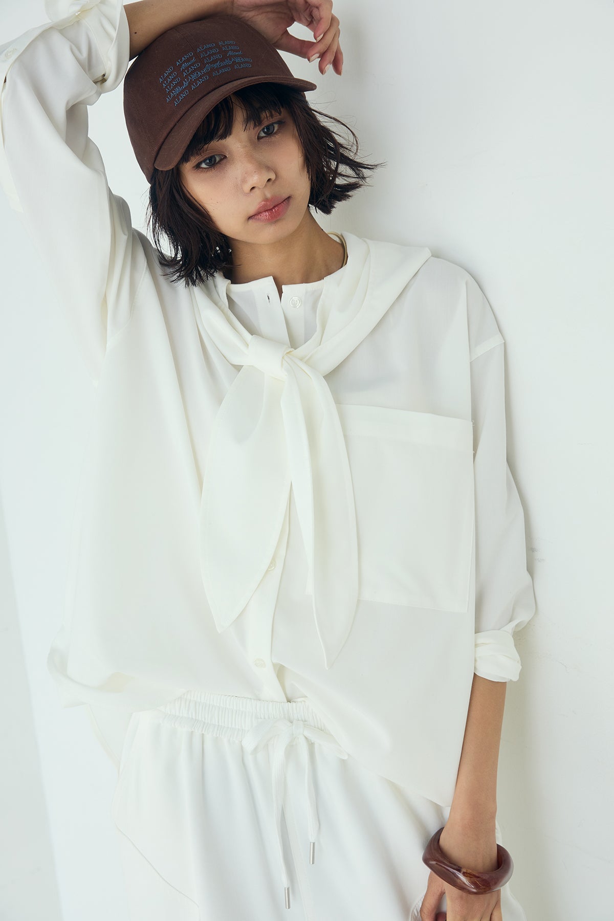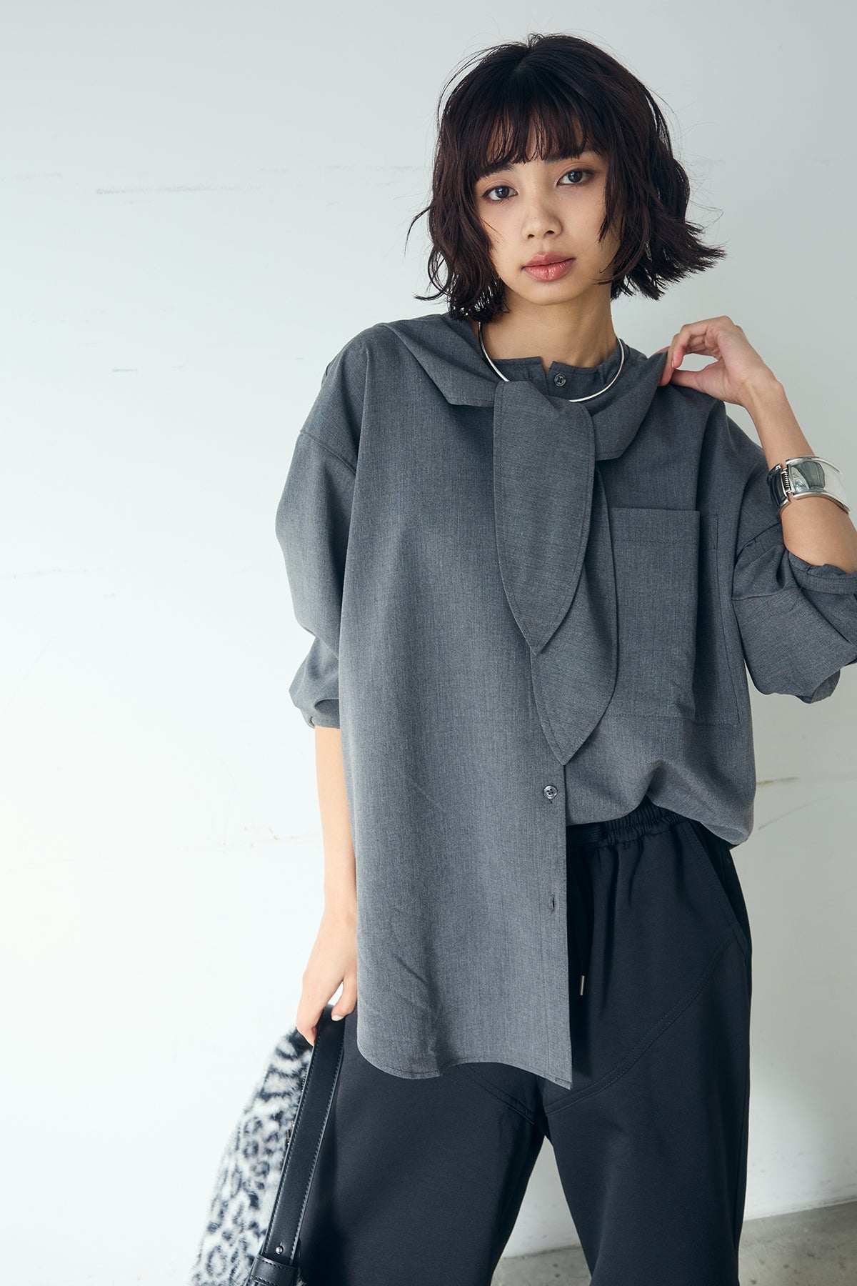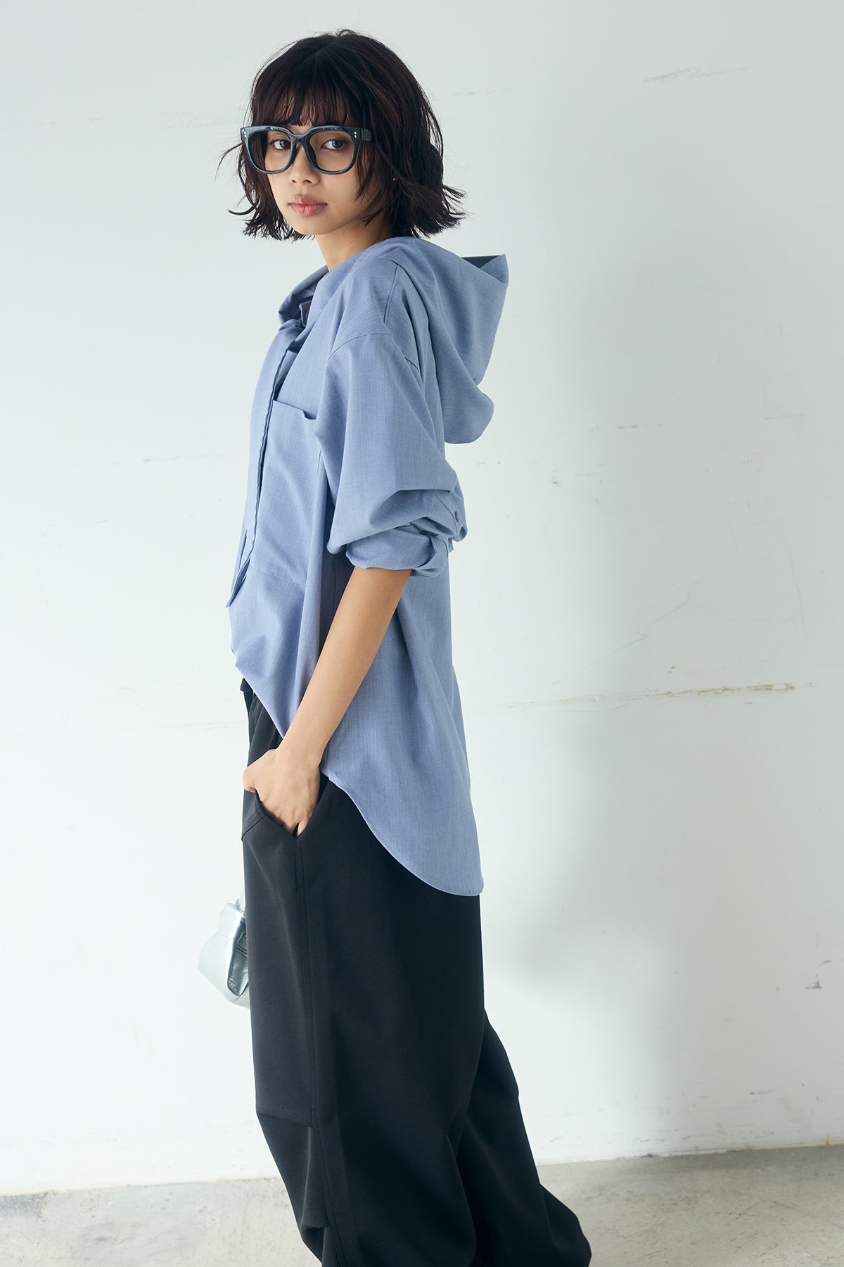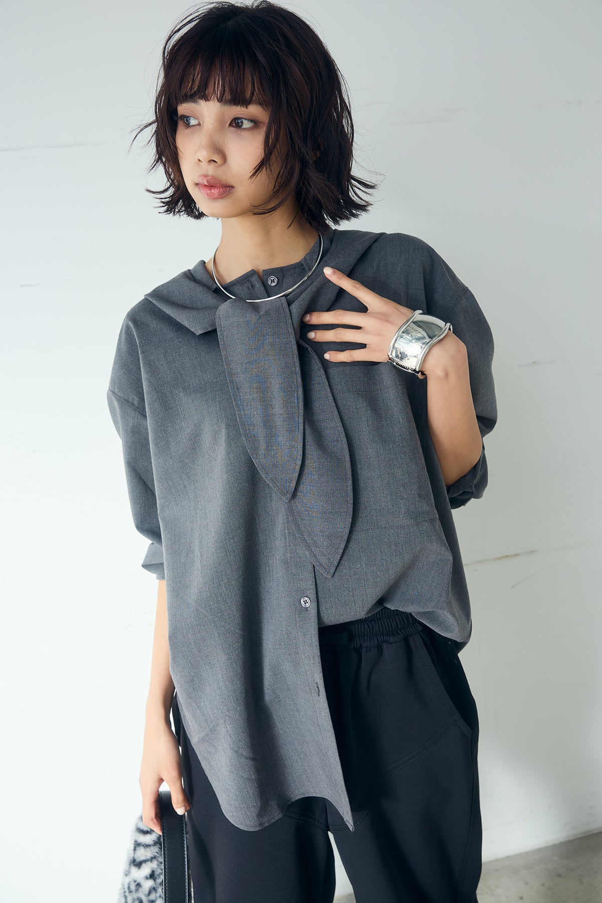 無地タイ付フーディーBIGシャツ クリーンな無地デザインにタイディテールを組み合わせた、存在感のあるビッグシルエットシャツ。 ゆとりのあるサイズ感が自然な抜けを生み、タイを垂らしたり軽く結んだりとアレンジ次第で印象の変化を楽しめます。フーディーデザインがほどよくカジュアルさを加え、パンツにもスカートにも合わせやすい一枚。シンプルながらも着こなしに表情を添え、日常のスタイリングに取り入れやすいアイテムです。