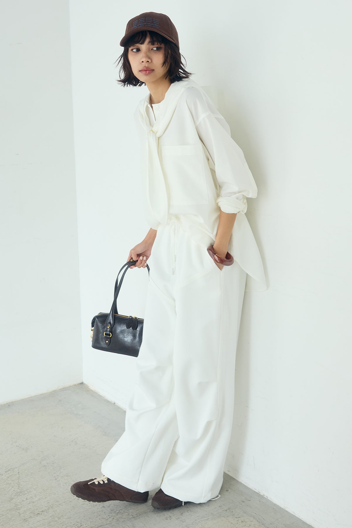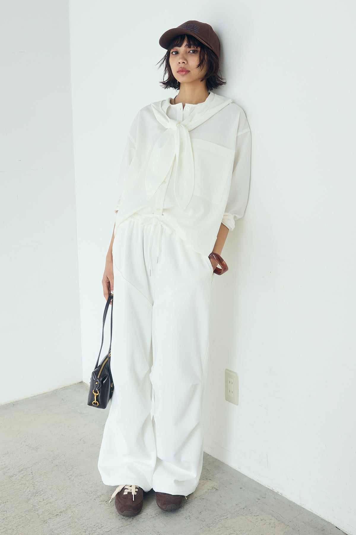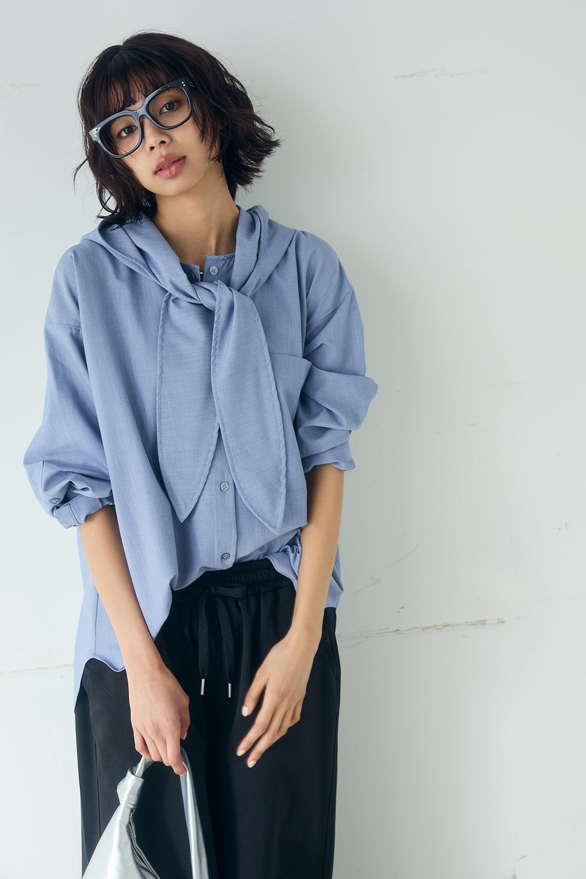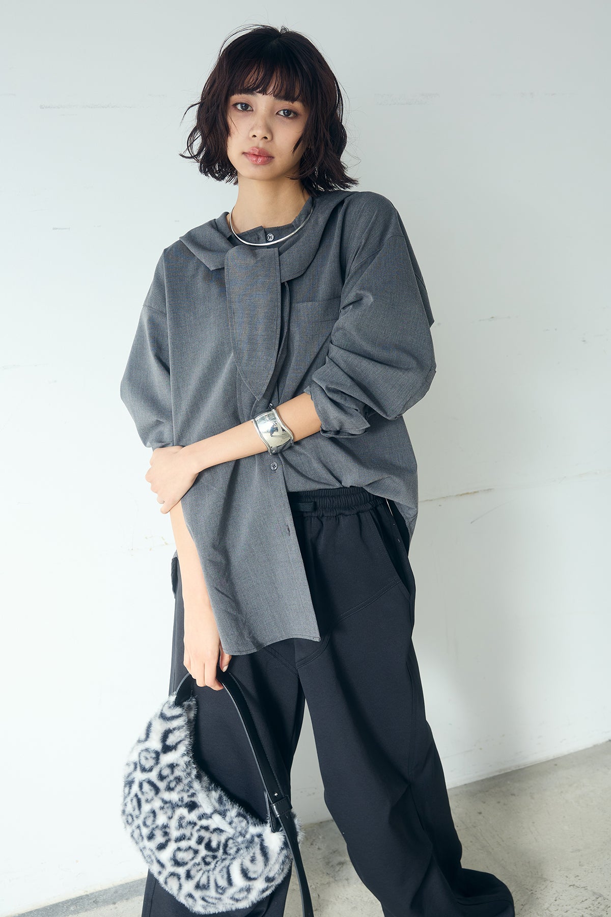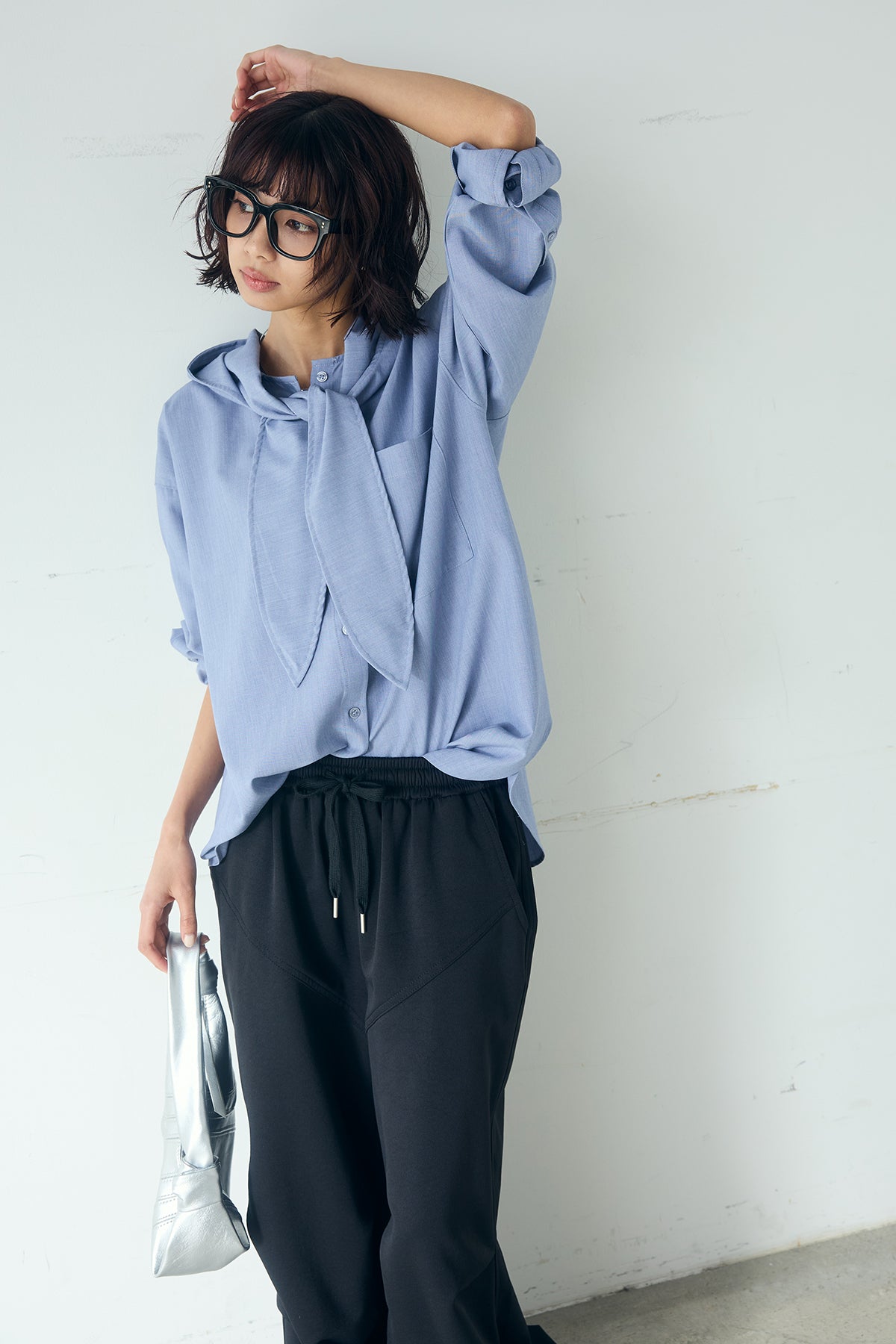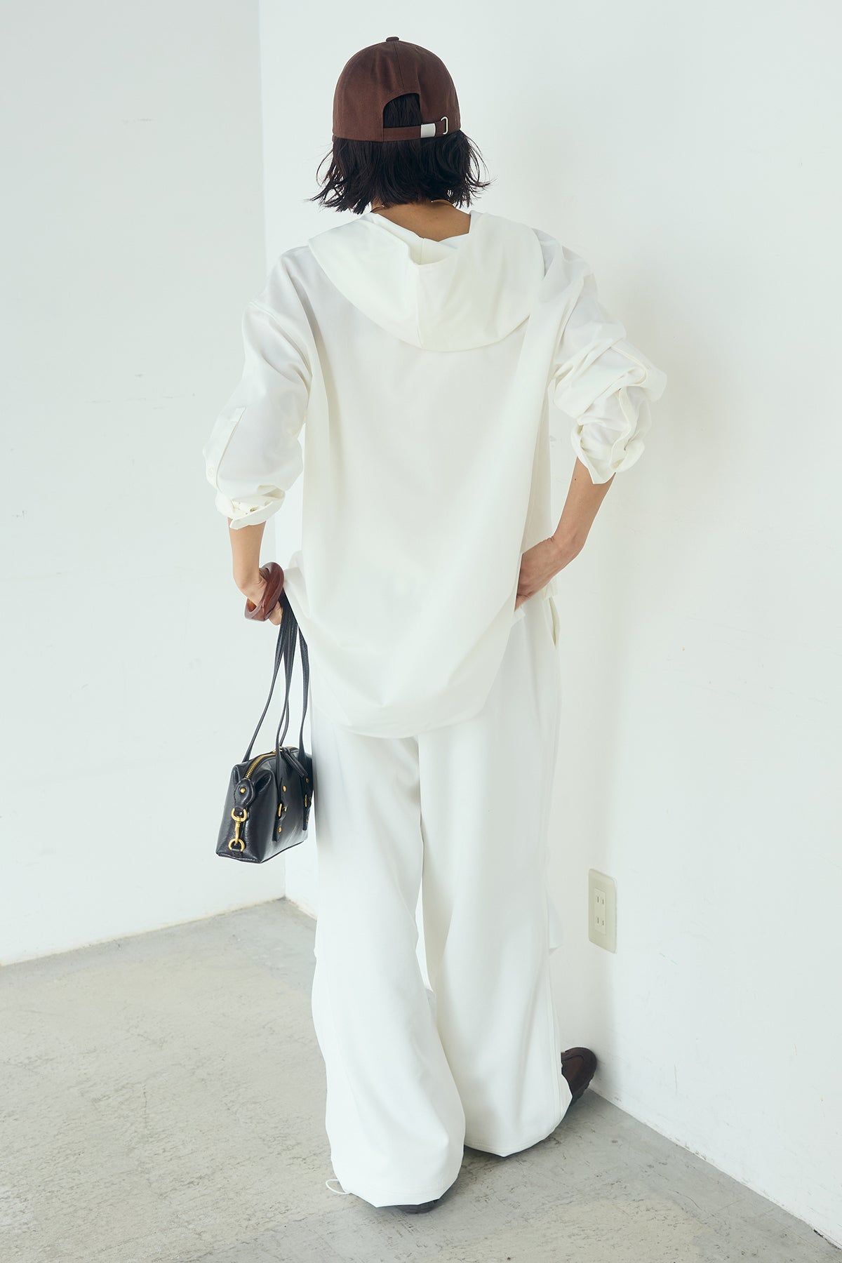 無地タイ付フーディーBIGシャツ クリーンな無地デザインにタイディテールを組み合わせた、存在感のあるビッグシルエットシャツ。 ゆとりのあるサイズ感が自然な抜けを生み、タイを垂らしたり軽く結んだりとアレンジ次第で印象の変化を楽しめます。フーディーデザインがほどよくカジュアルさを加え、パンツにもスカートにも合わせやすい一枚。シンプルながらも着こなしに表情を添え、日常のスタイリングに取り入れやすいアイテムです。