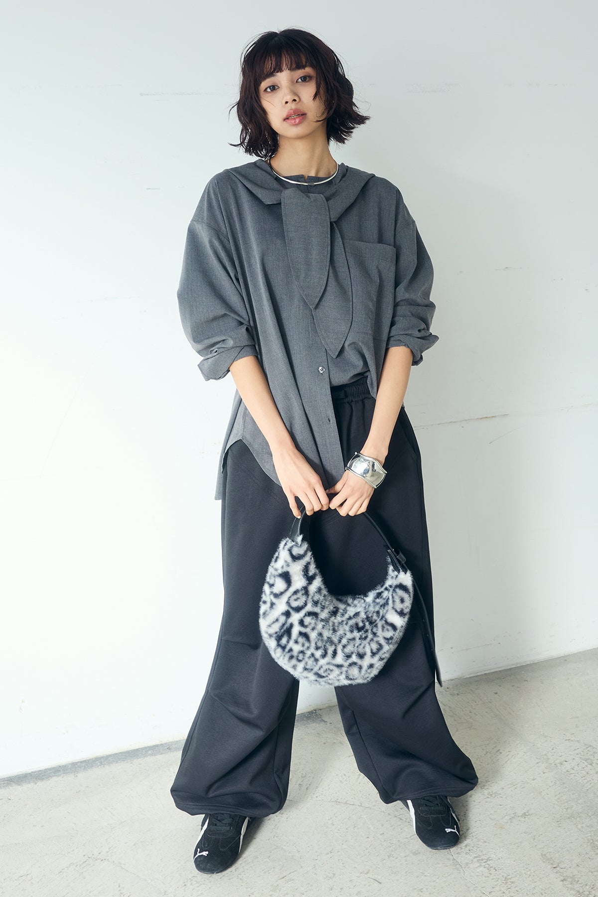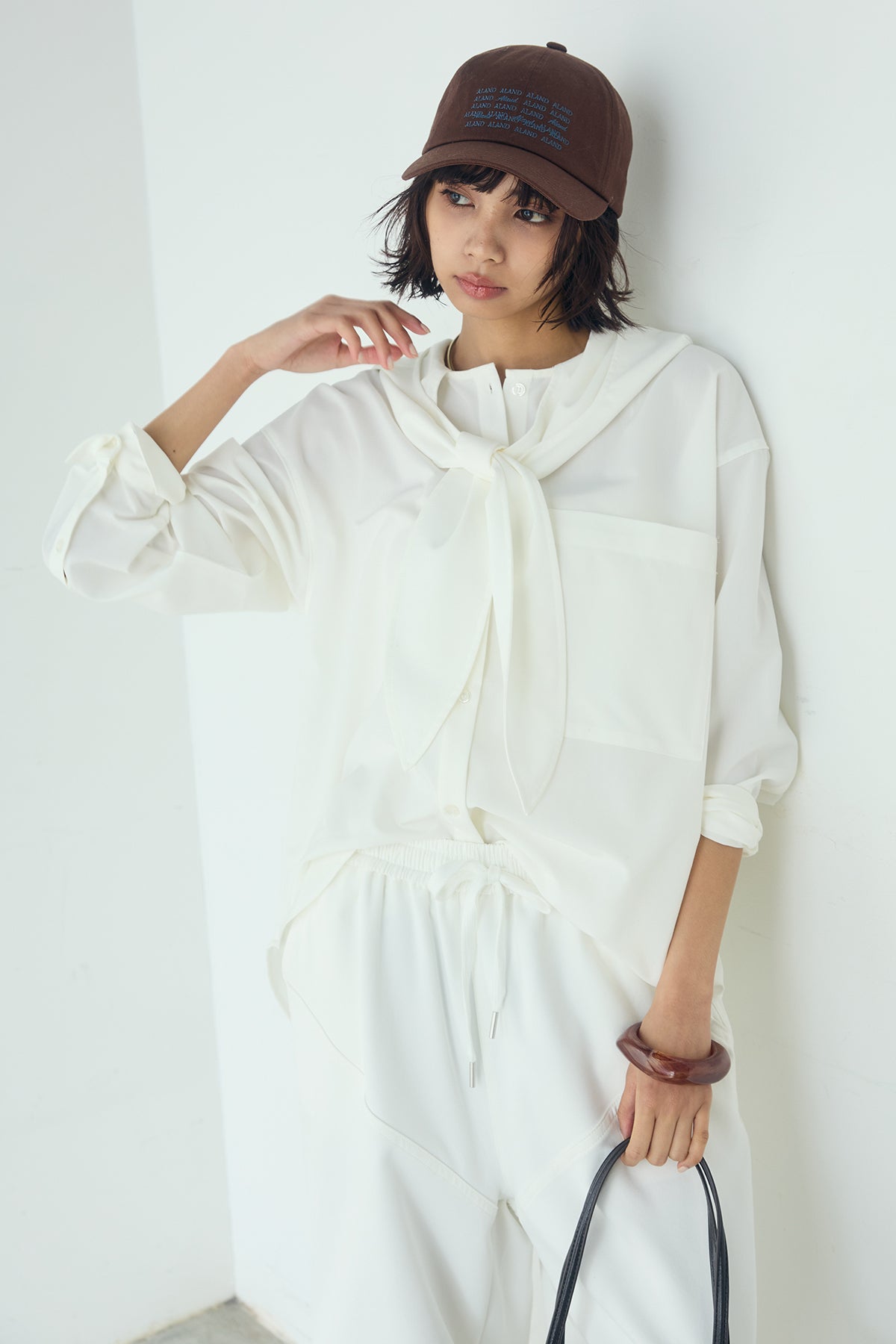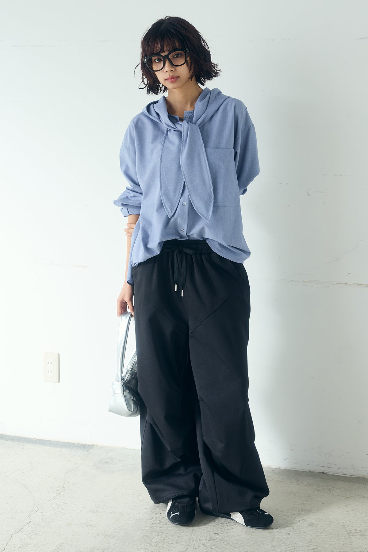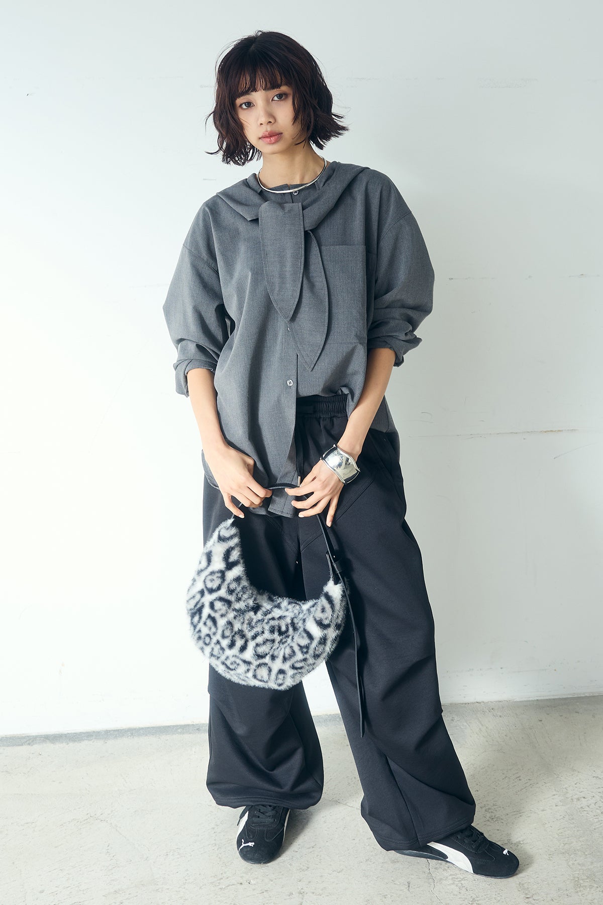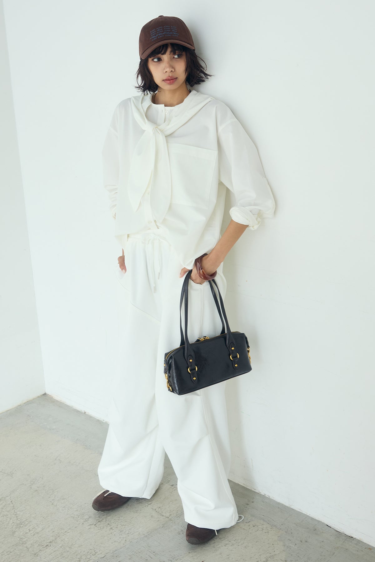 無地タイ付フーディーBIGシャツ クリーンな無地デザインにタイディテールを組み合わせた、存在感のあるビッグシルエットシャツ。 ゆとりのあるサイズ感が自然な抜けを生み、タイを垂らしたり軽く結んだりとアレンジ次第で印象の変化を楽しめます。フーディーデザインがほどよくカジュアルさを加え、パンツにもスカートにも合わせやすい一枚。シンプルながらも着こなしに表情を添え、日常のスタイリングに取り入れやすいアイテムです。