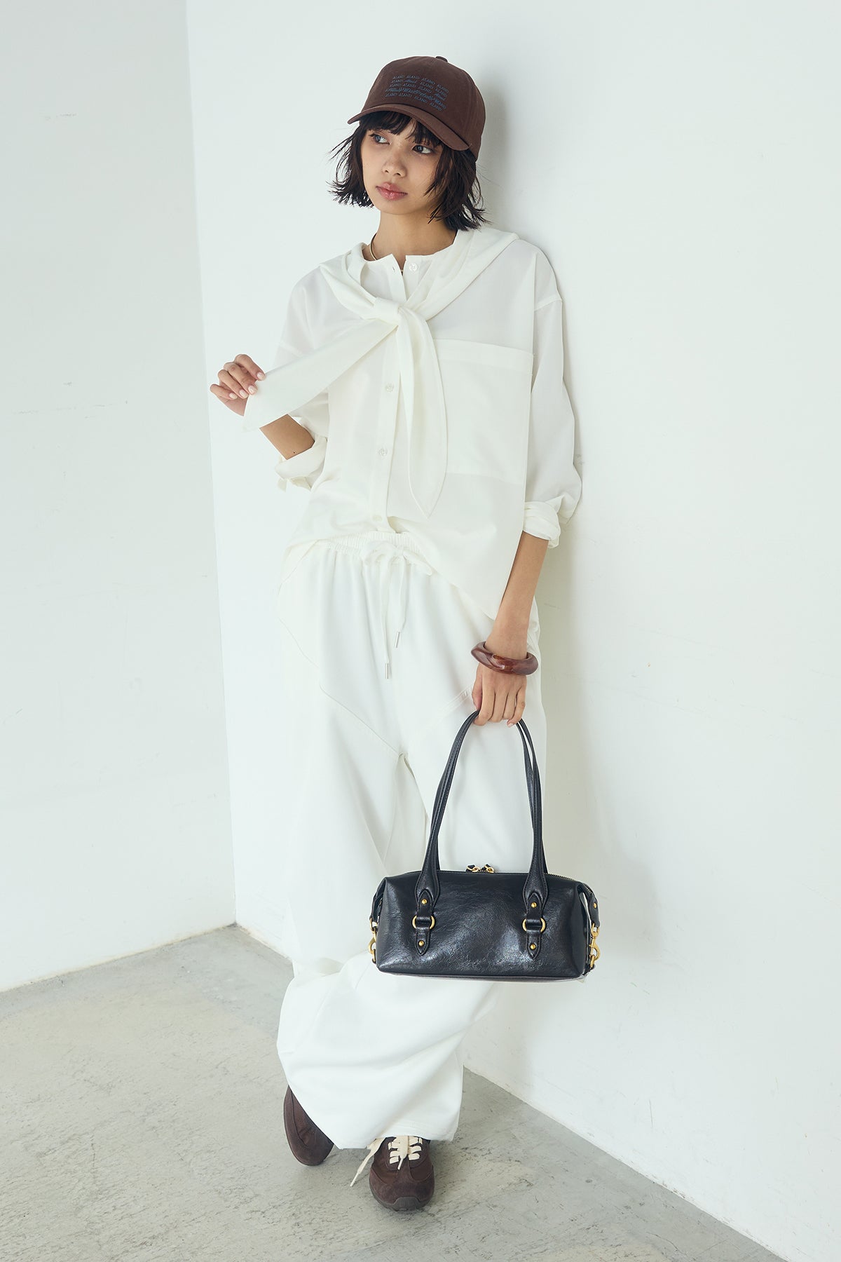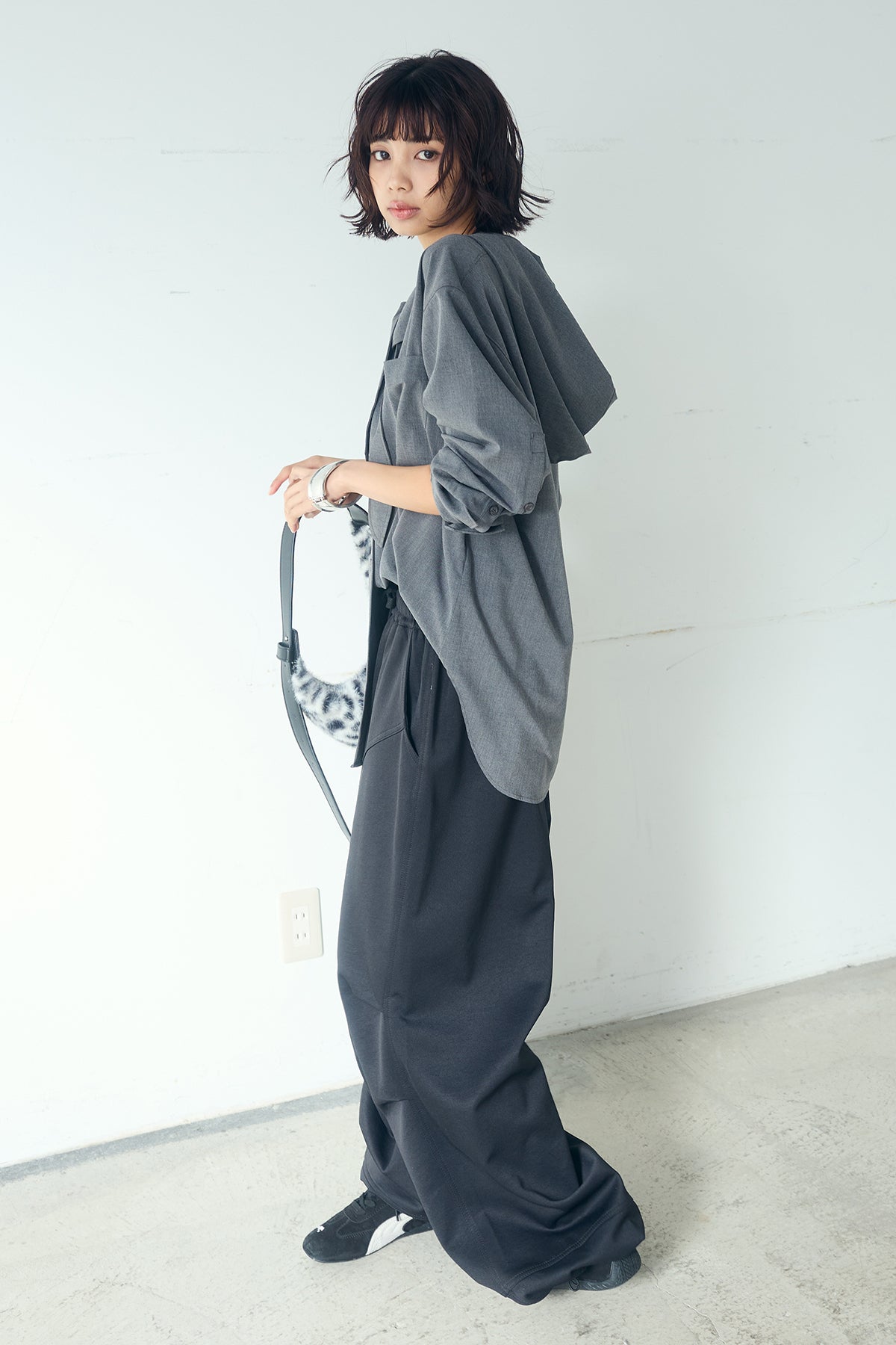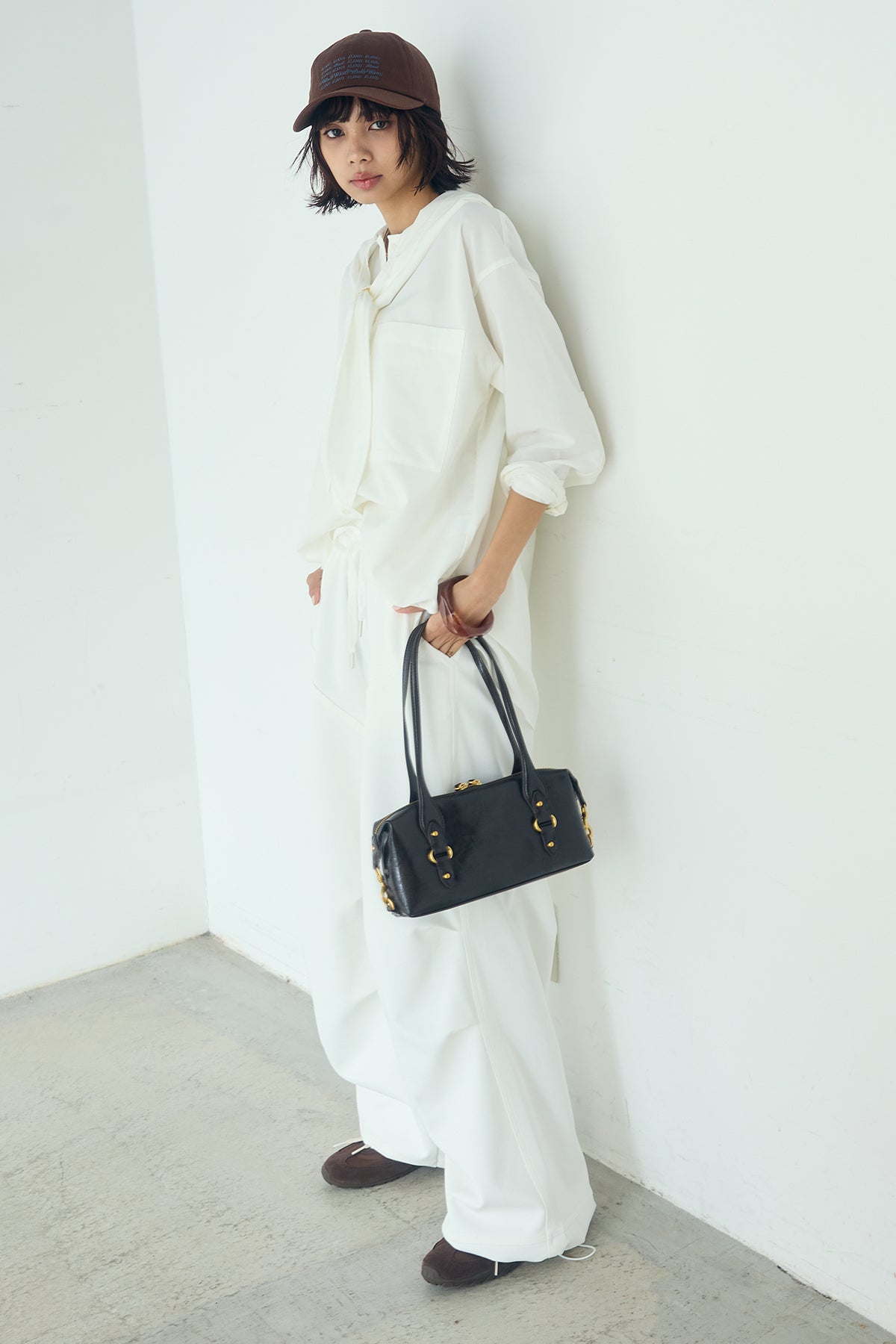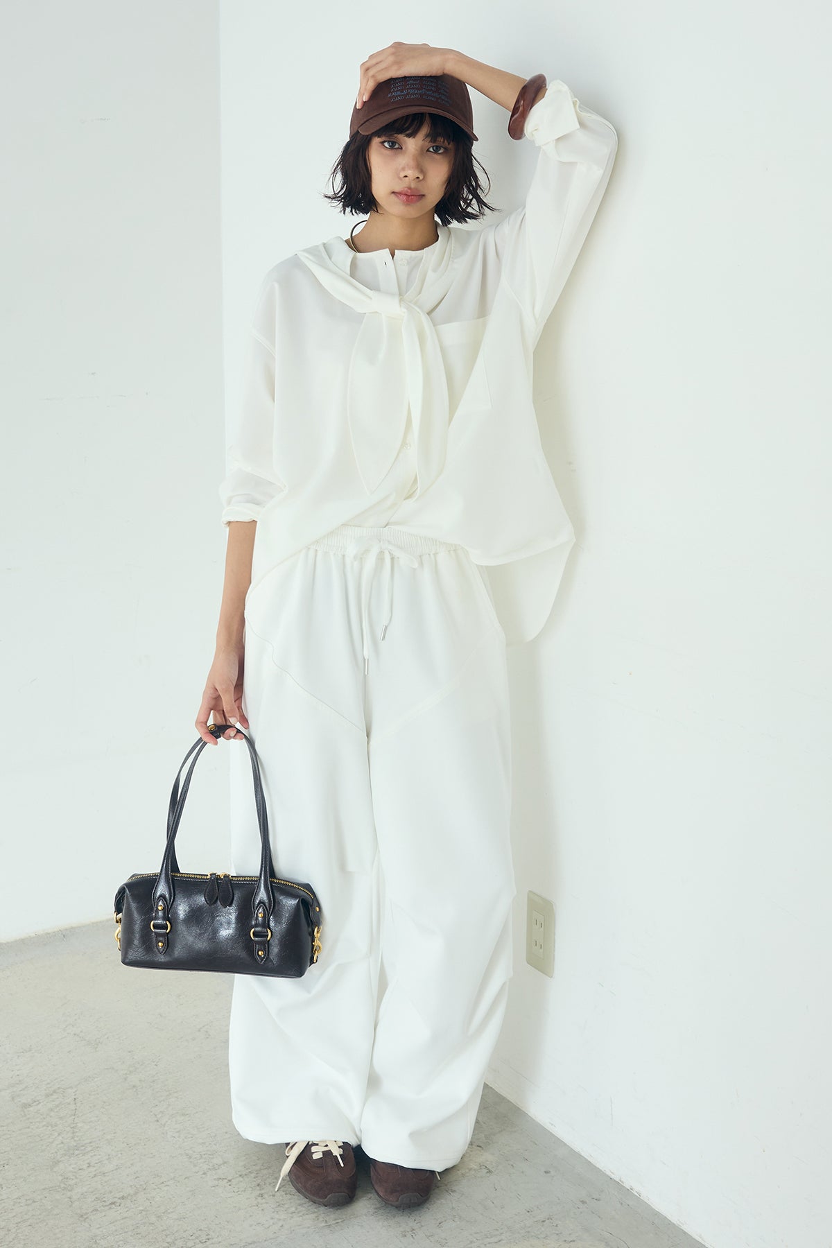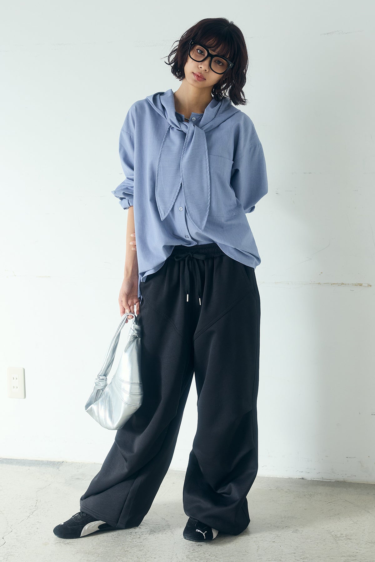 無地タイ付フーディーBIGシャツ クリーンな無地デザインにタイディテールを組み合わせた、存在感のあるビッグシルエットシャツ。 ゆとりのあるサイズ感が自然な抜けを生み、タイを垂らしたり軽く結んだりとアレンジ次第で印象の変化を楽しめます。フーディーデザインがほどよくカジュアルさを加え、パンツにもスカートにも合わせやすい一枚。シンプルながらも着こなしに表情を添え、日常のスタイリングに取り入れやすいアイテムです。
