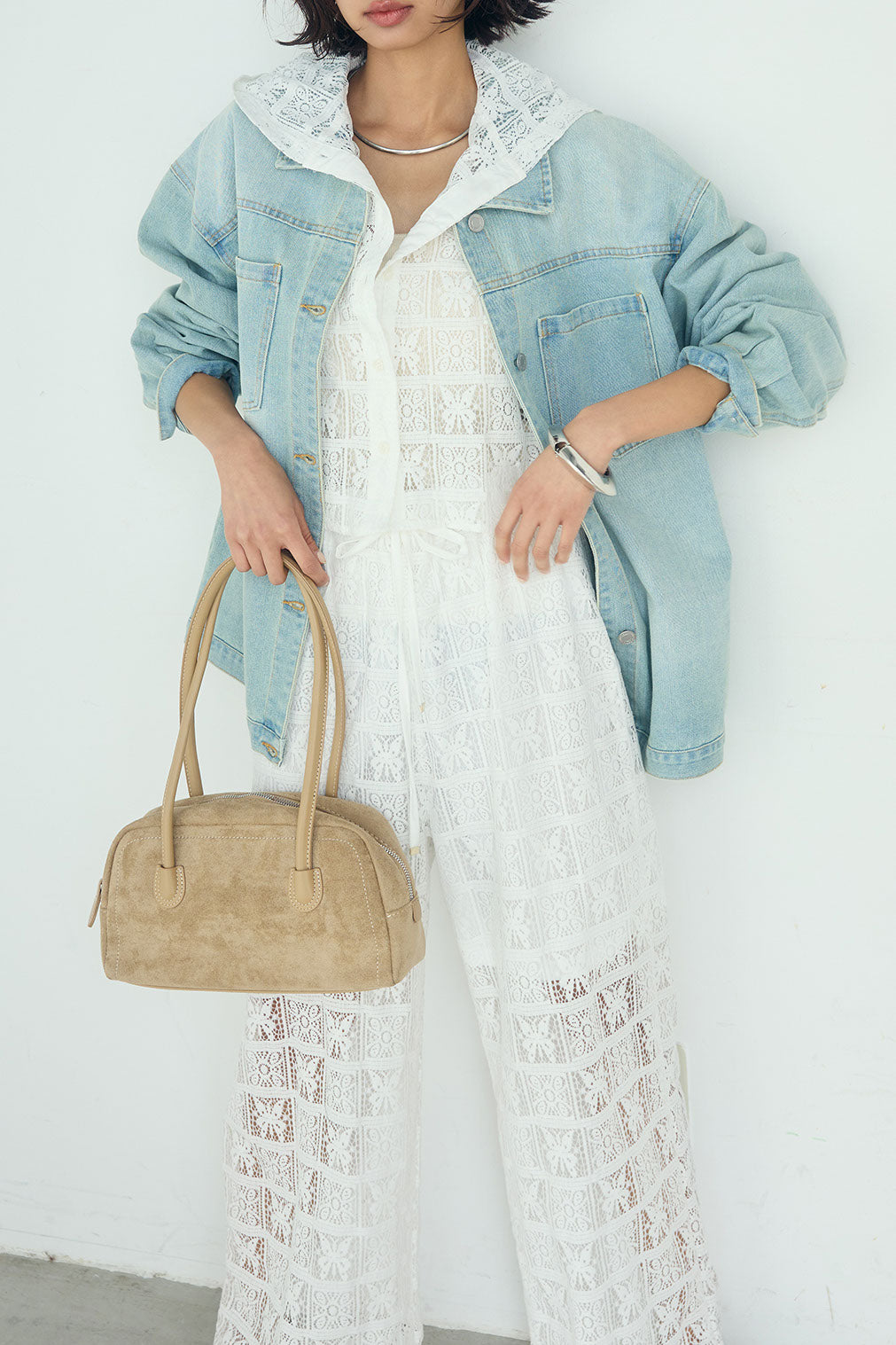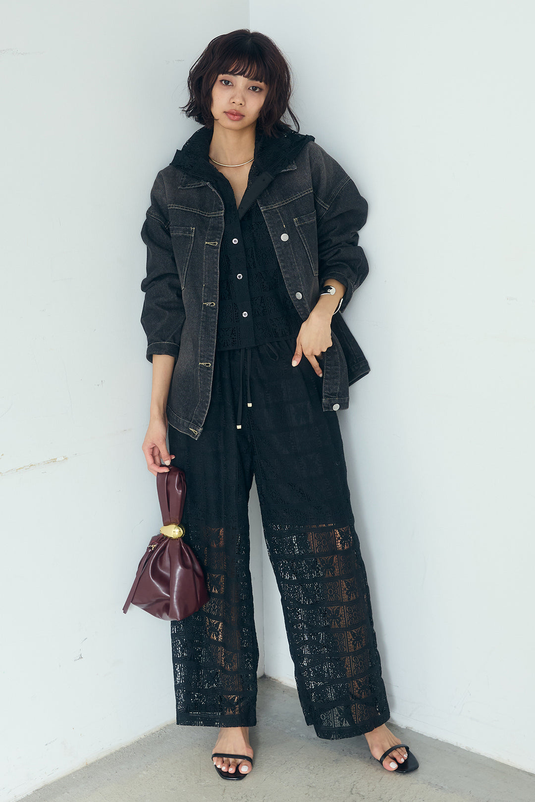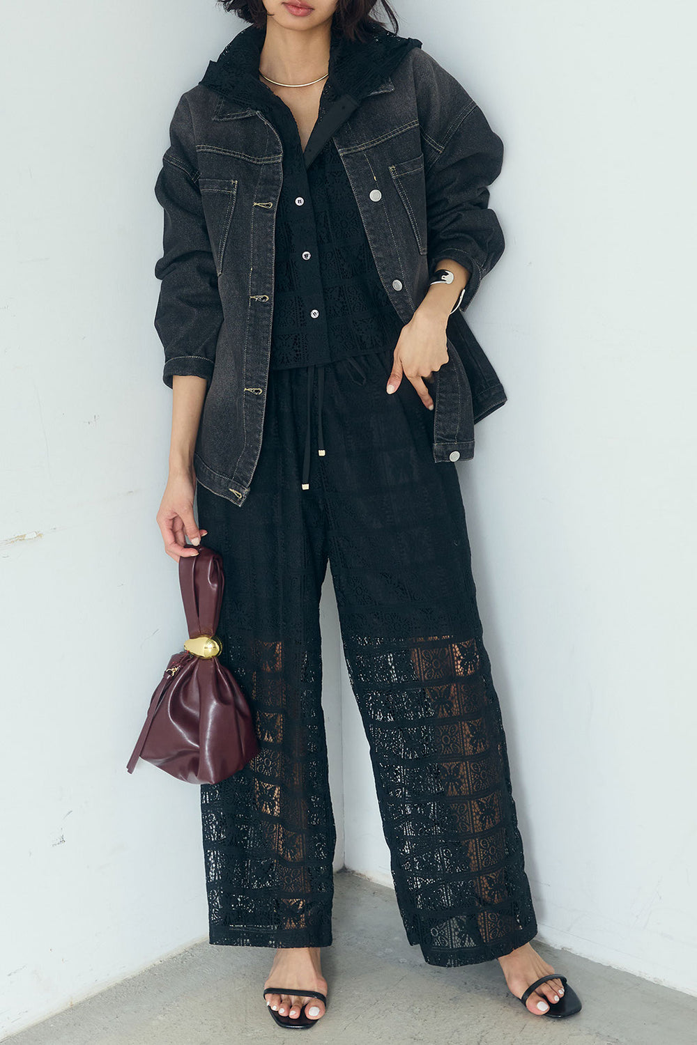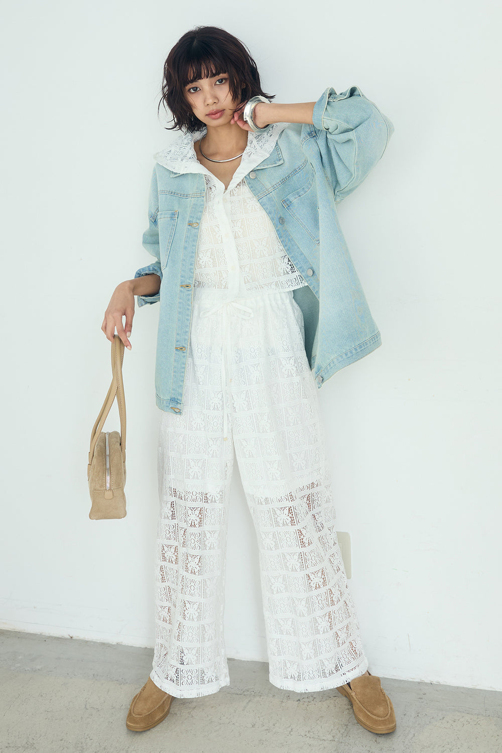 [SET]デニムオーバーサイズジャケット+パッチワークレースイージーパンツ+パッチワークレースショート丈フードシャツ(3set)