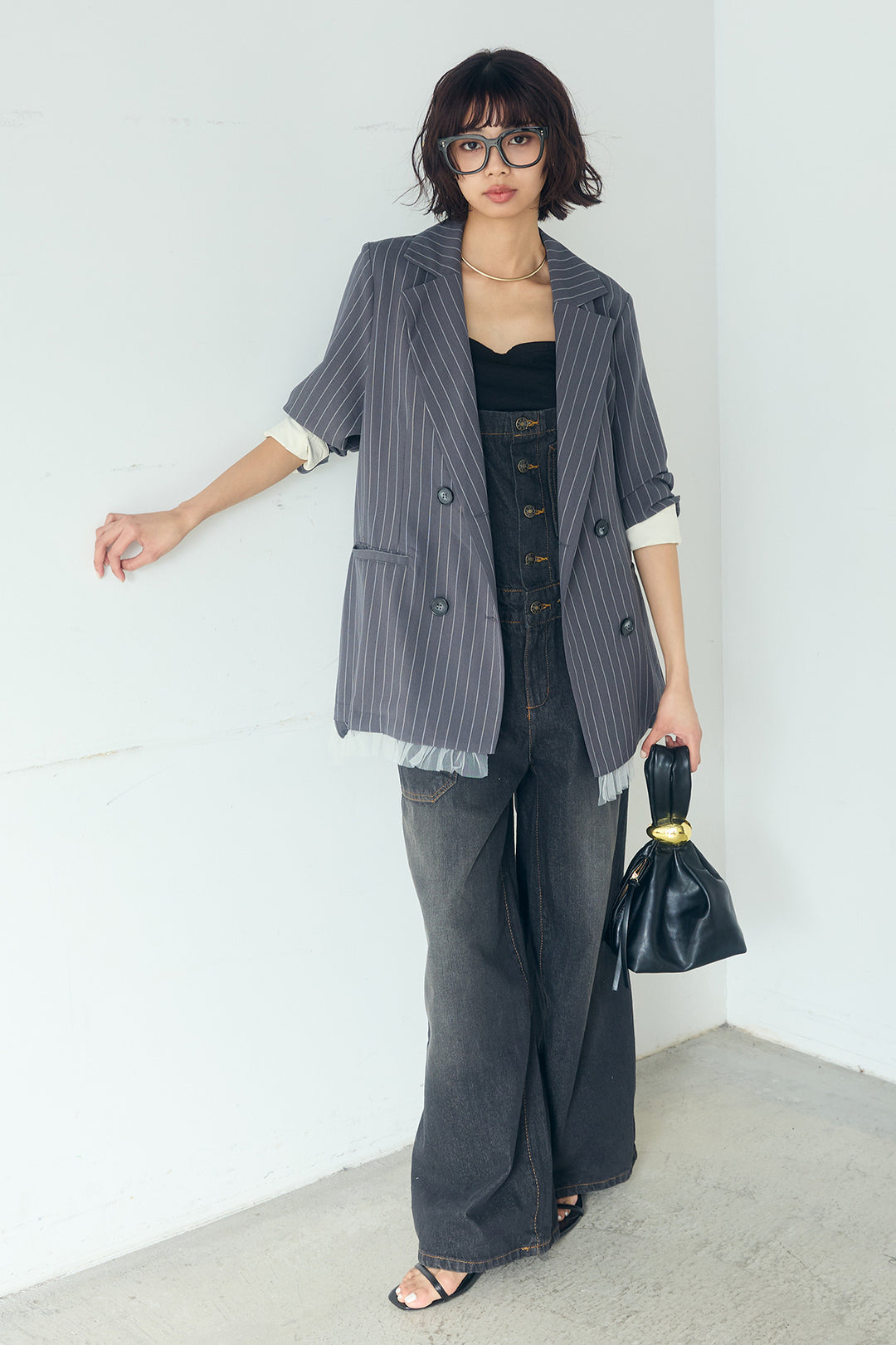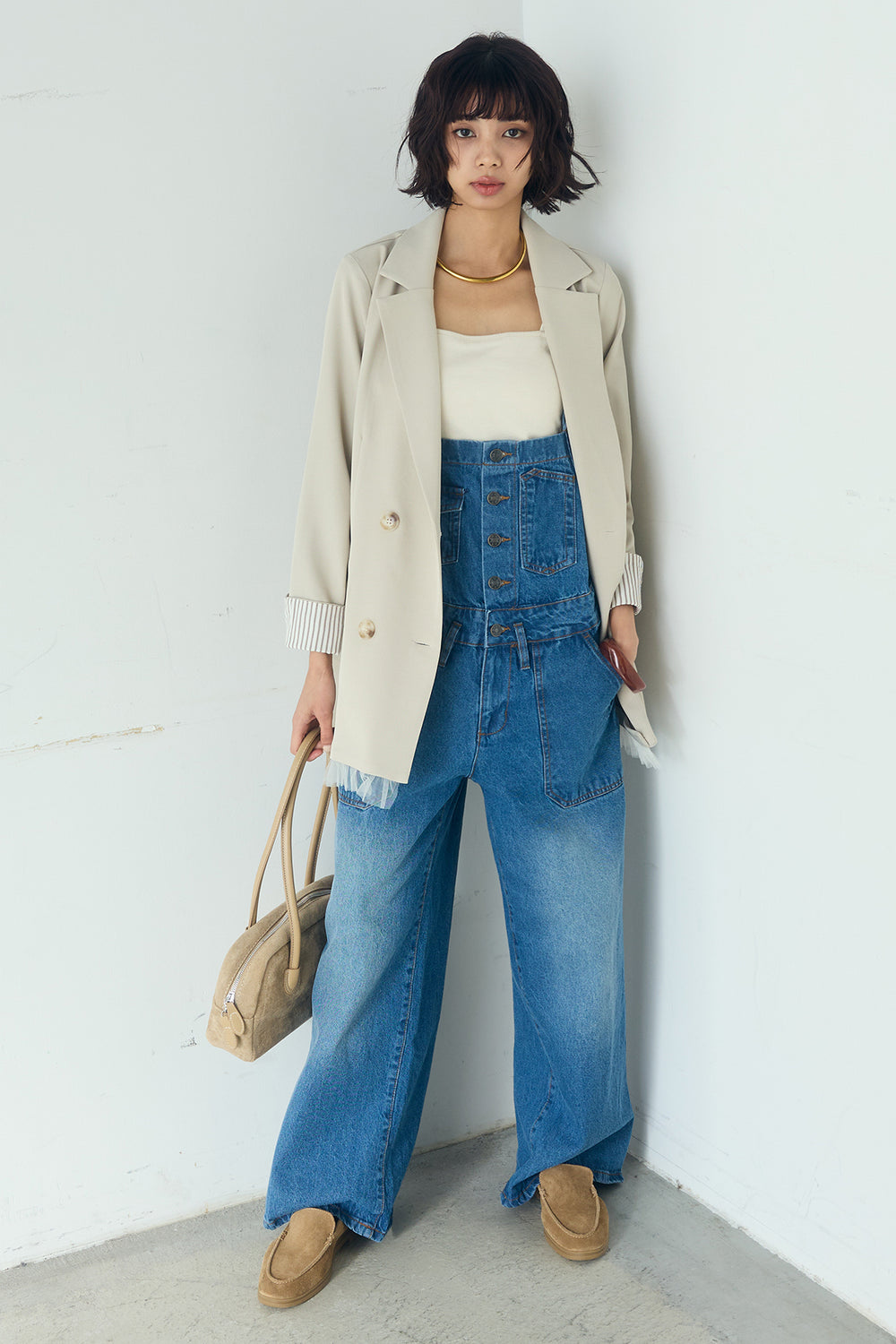 [SET]裾フリルダブルジャケット+デニムサロペットワイドパンツ(2set)