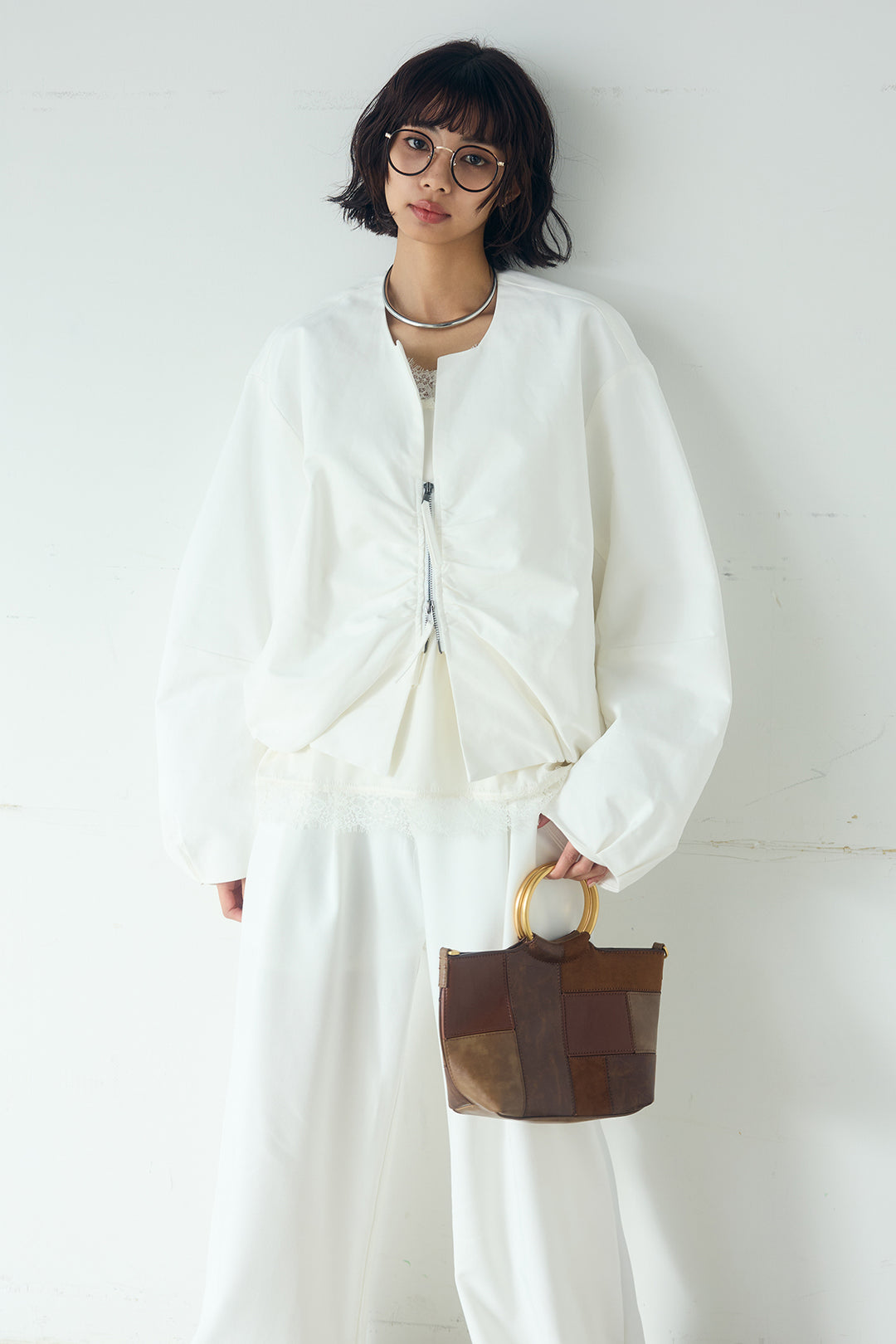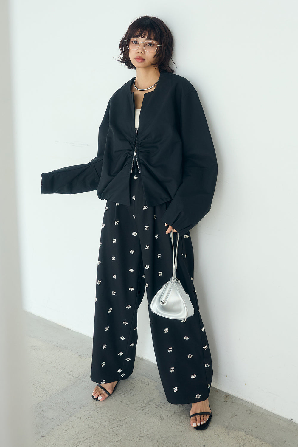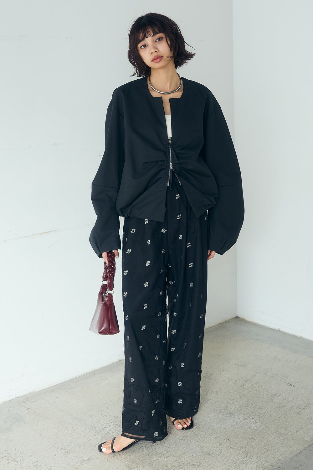 [SET]ノーカラーフロントギャザージップアウター+花柄刺繍ツイルタックパンツ(2set)