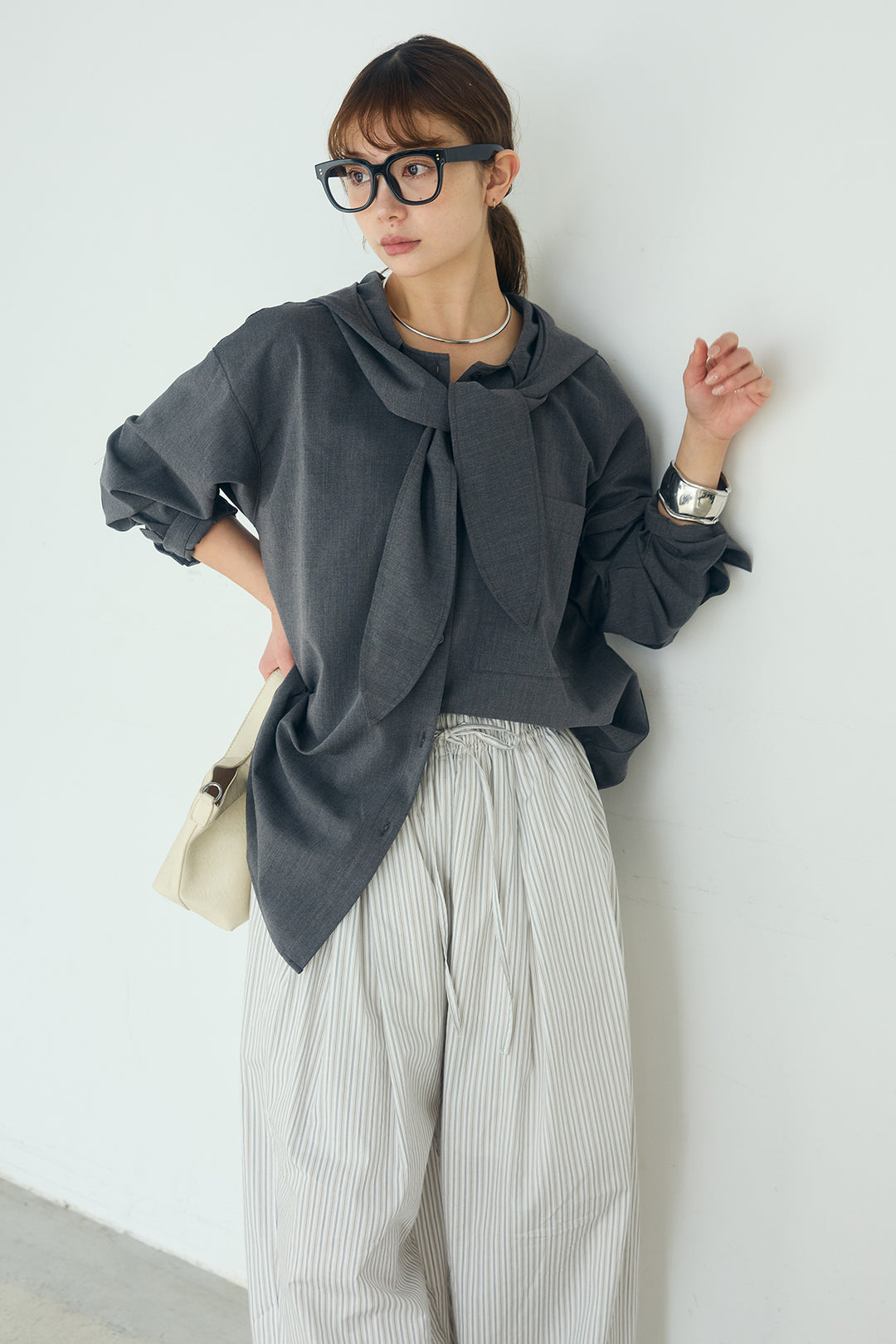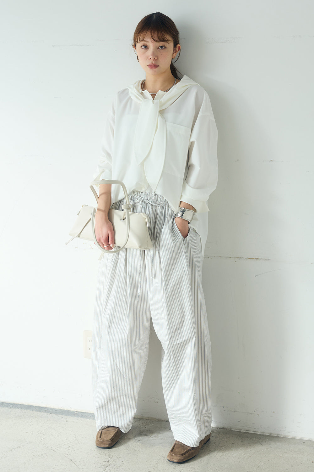 [SET]無地タイ付フーディーBIGシャツ+ランダムストライプタックギャザーパンツ(2set)