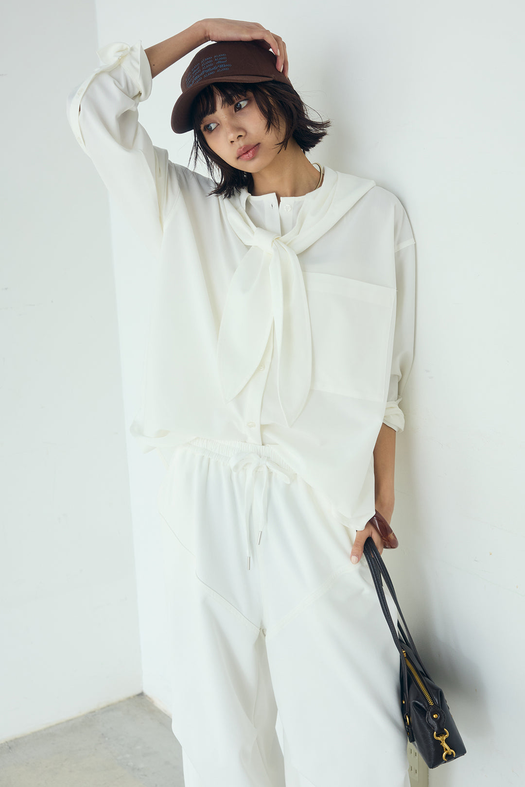 [SET]無地タイ付フーディーBIGシャツ+ランダムタックデザインワイドパンツ(2set)