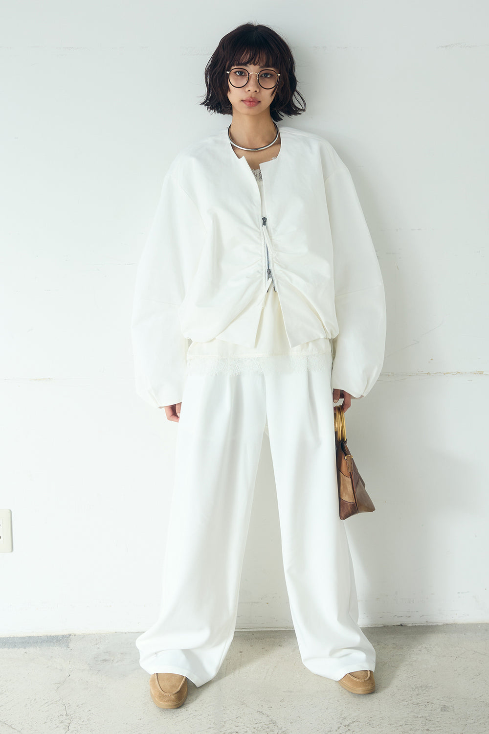 [SET]ノーカラーフロントギャザージップアウター+花柄刺繍ツイルタックパンツ+ニュアンスウェーブ刺繍シアーチュールパンツ(3set)