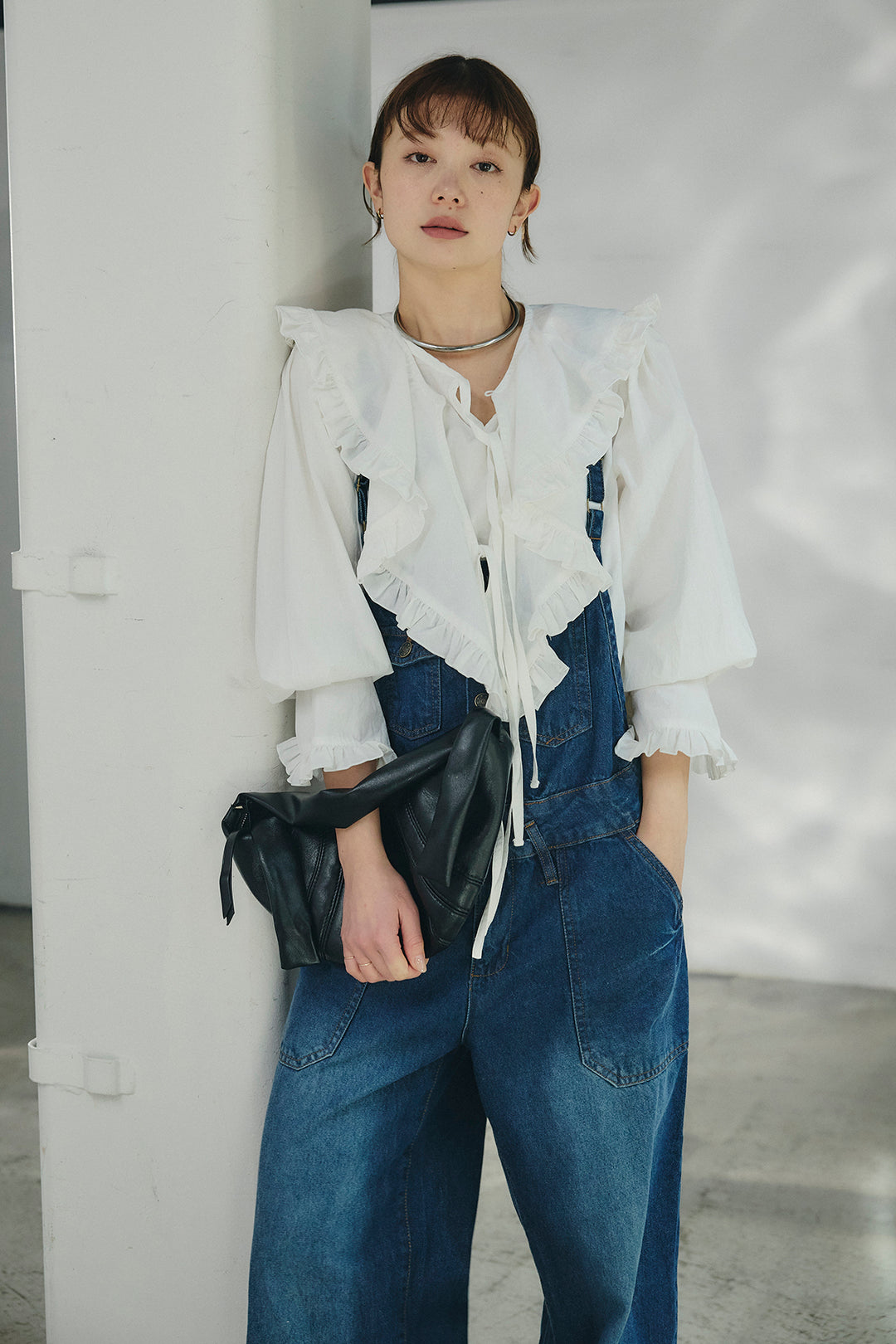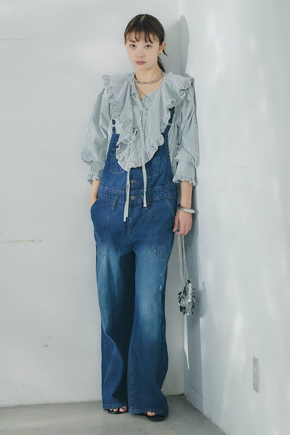[SET]コットンフリルブラウス+デニムサロペットワイドパンツ(2set)