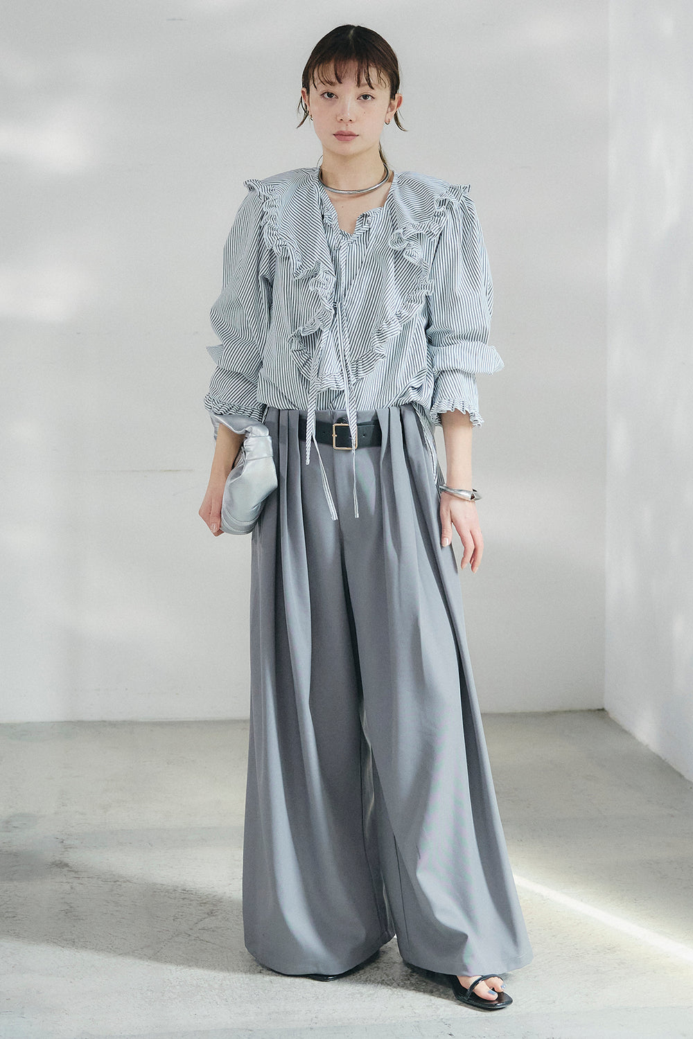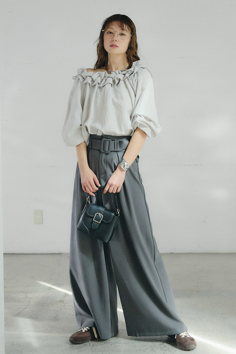 [SET]ネックフリルデザインブラウス+ベルト付きツータックワイドパンツ(2set)
