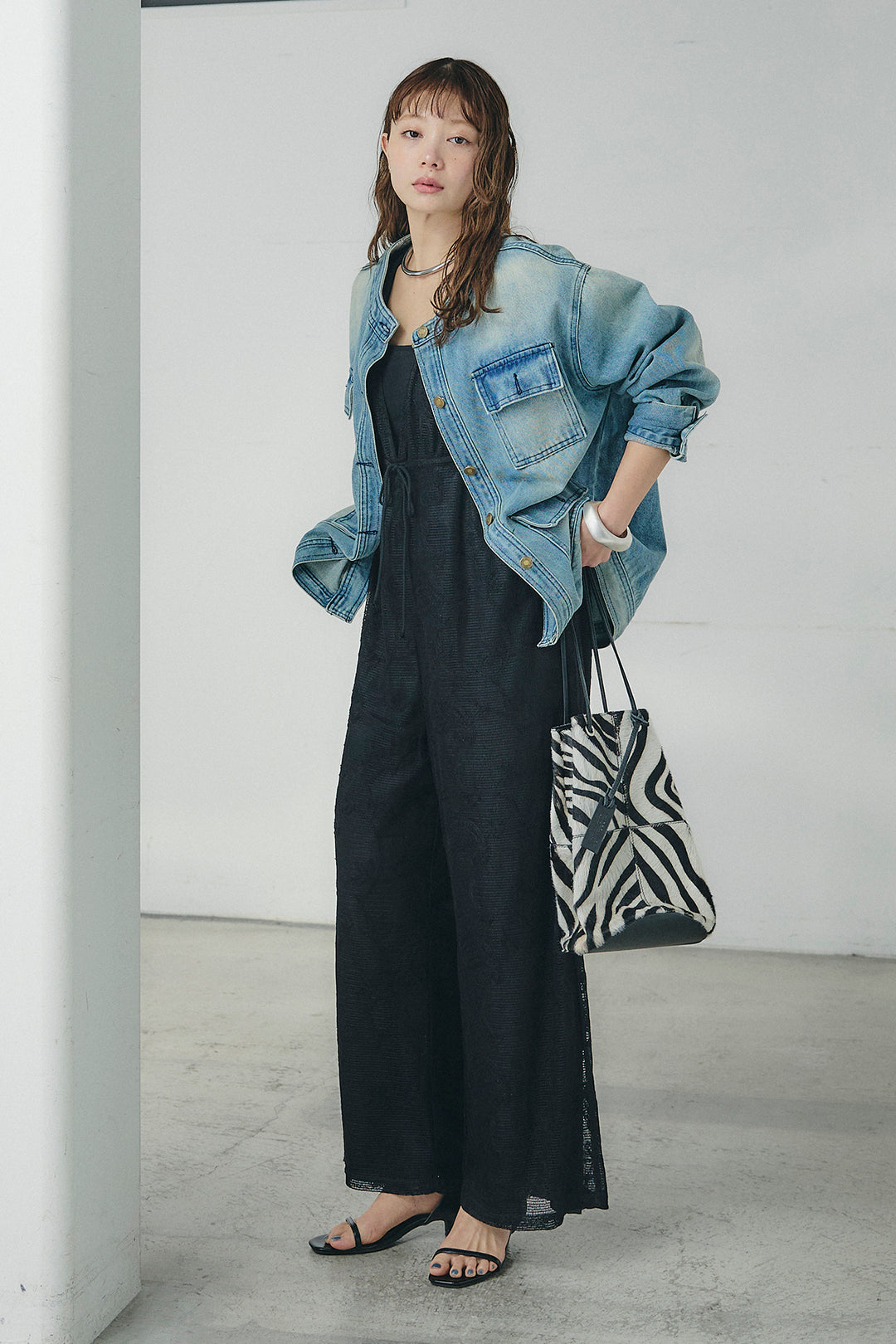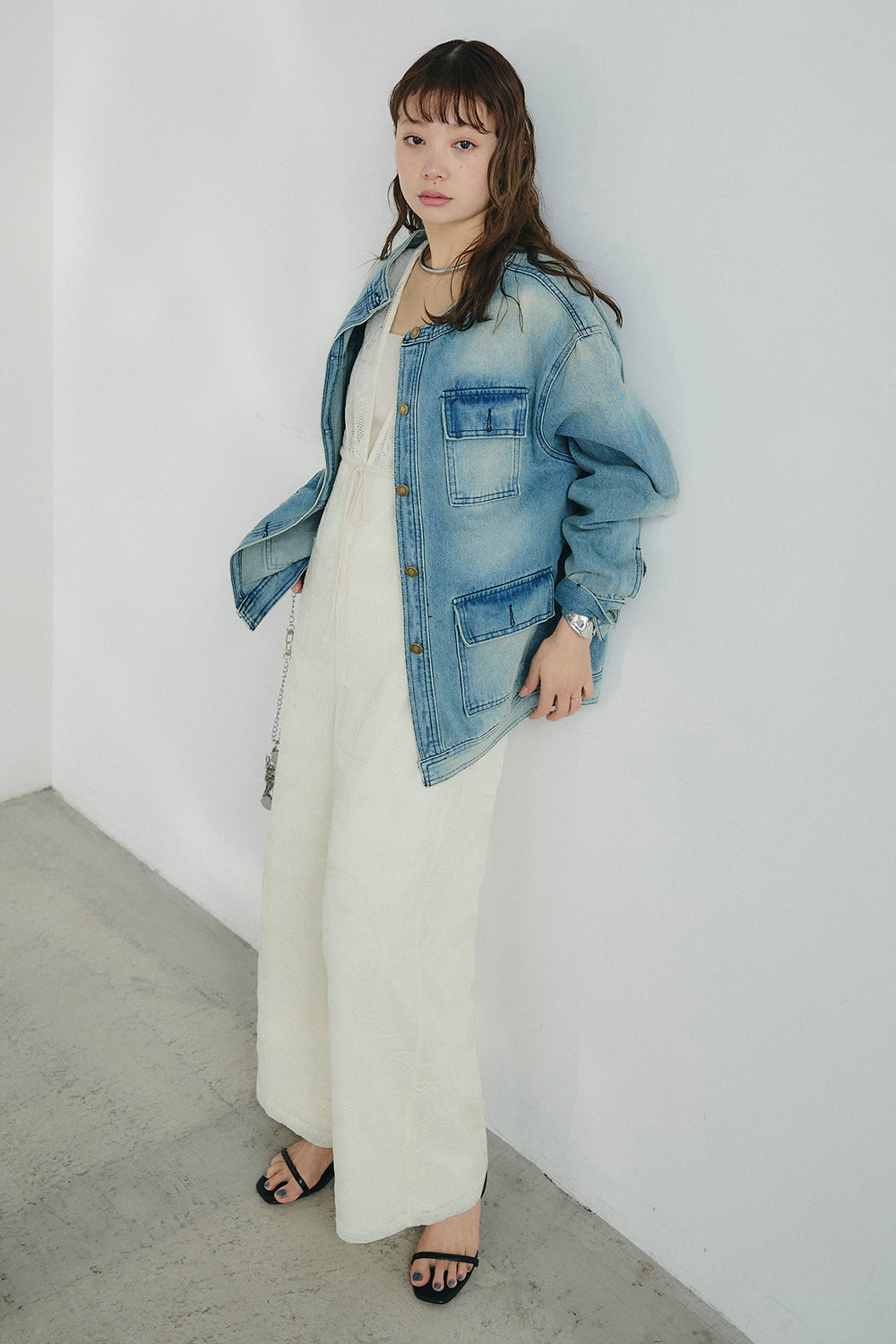 [SET]ノーカラーデニムポケットジャケット+レースサロペット(2set)