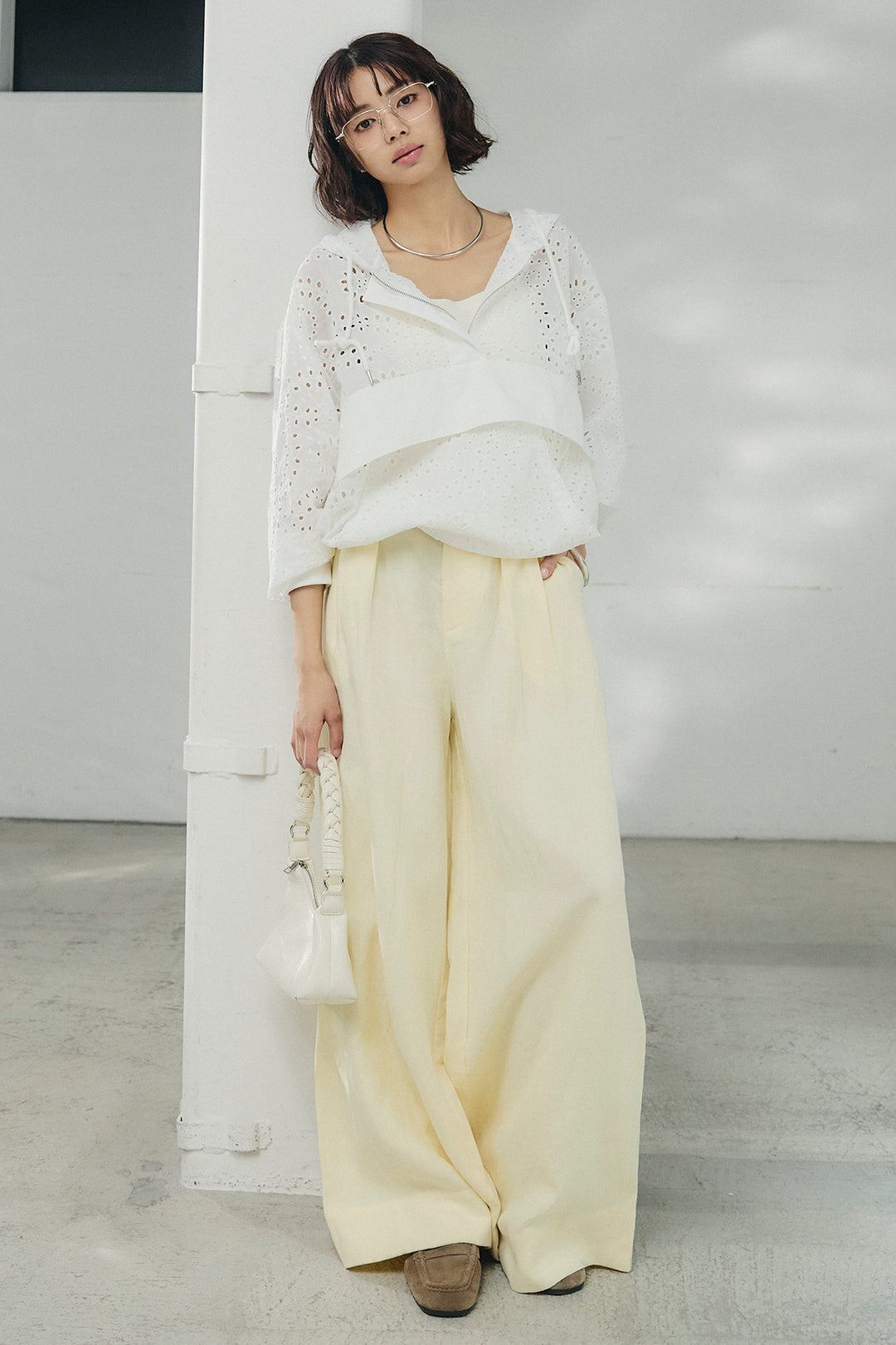 [SET]レースハーフジップアップフーディー+リネン混タックストレートワイドパンツ(2set)