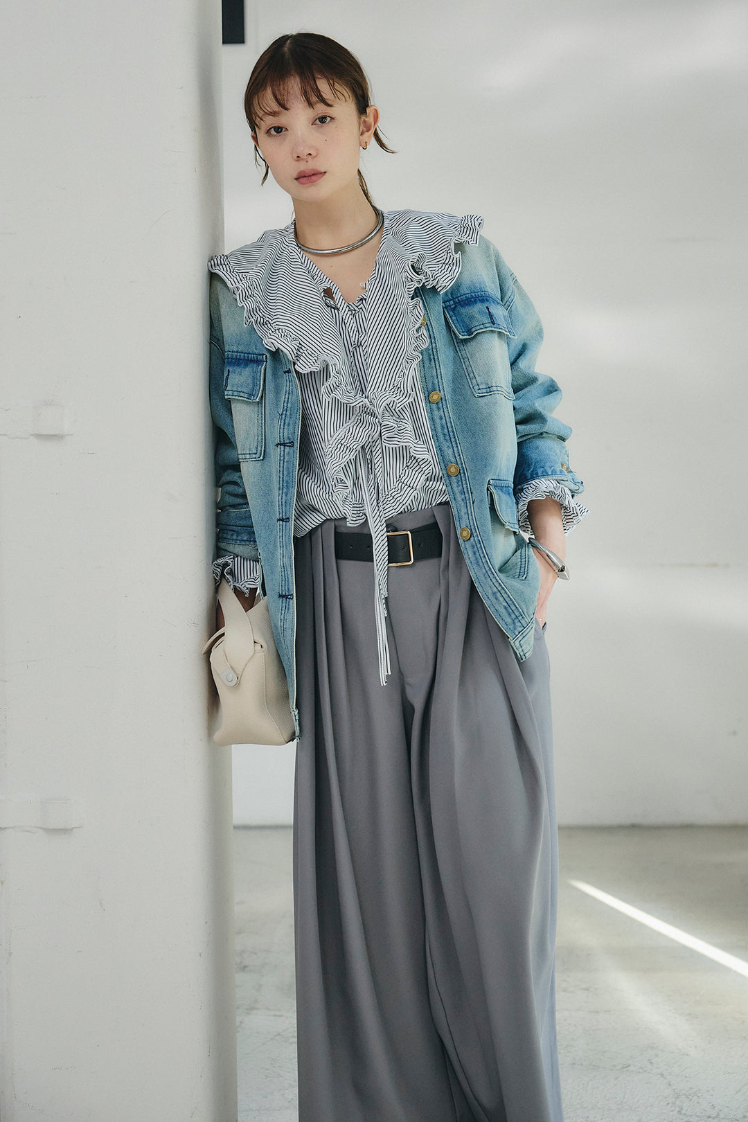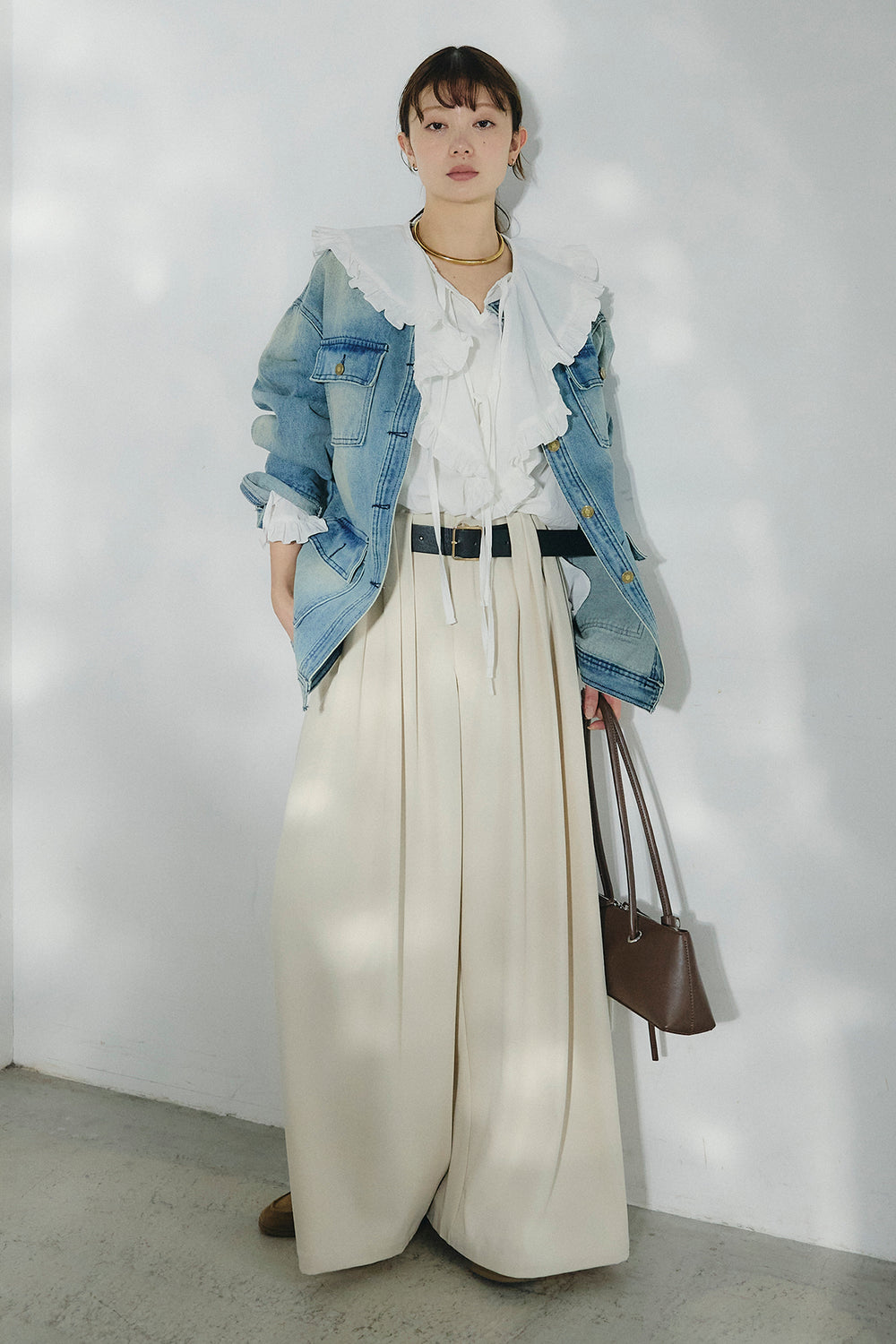 [SET]ノーカラーデニムポケットジャケット+コットンフリルブラウス+ベルト付きタックデザインハイウエストロングパンツ(3set)