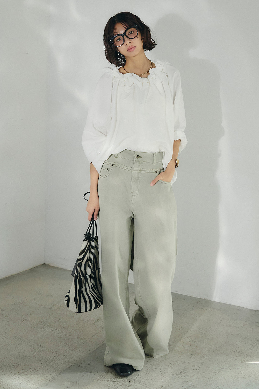 [SET]ネックフリルデザインブラウス+ウエスト裁ち切りデニムワイドパンツ(2set)