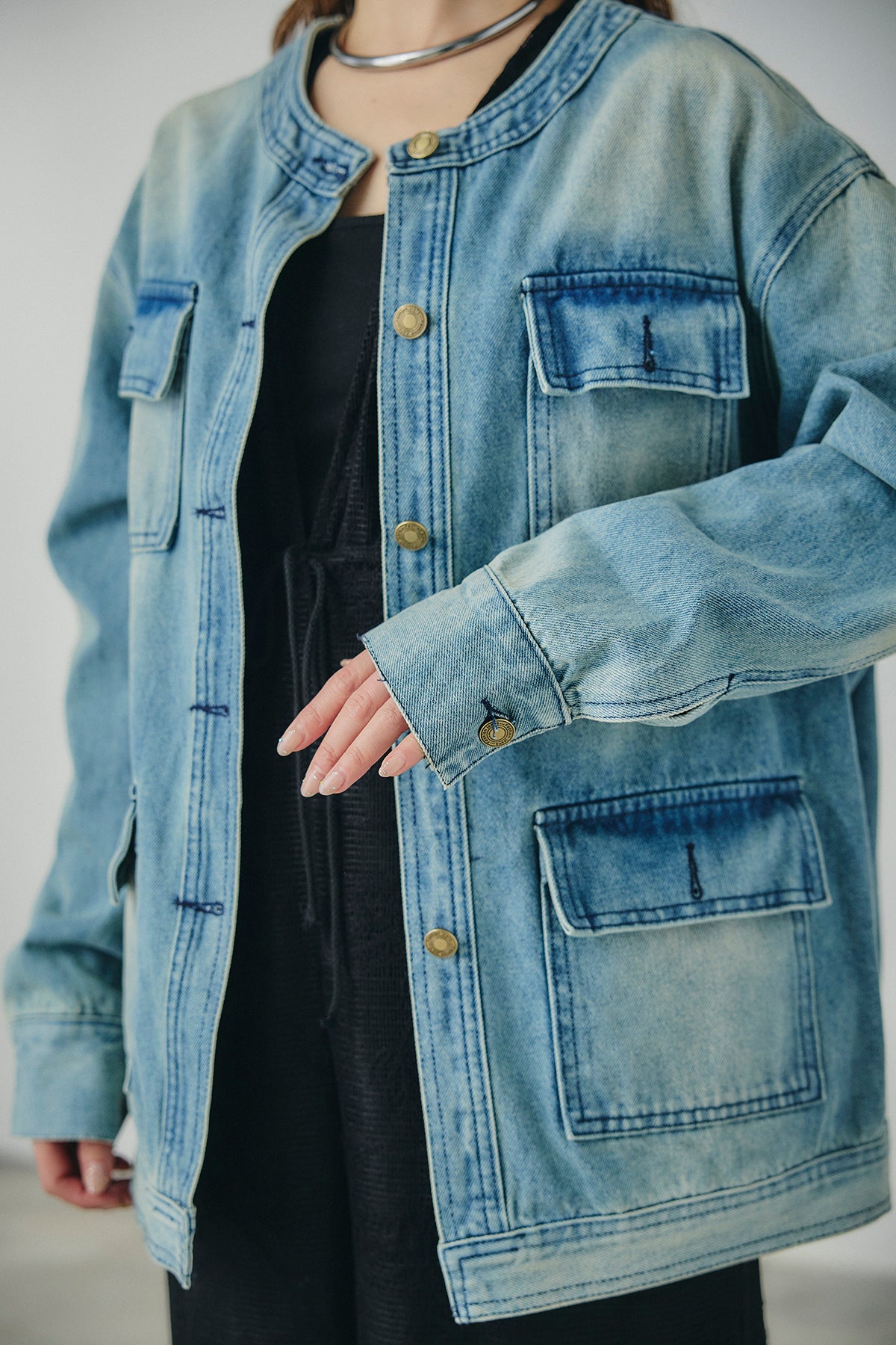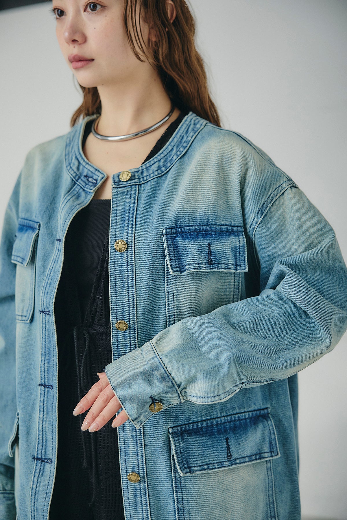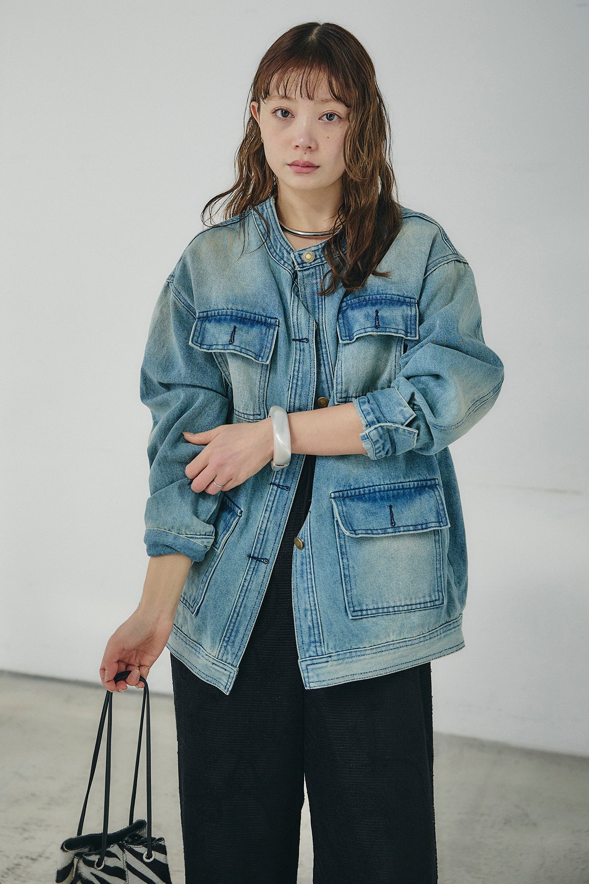 ノーカラーデニムポケットジャケット