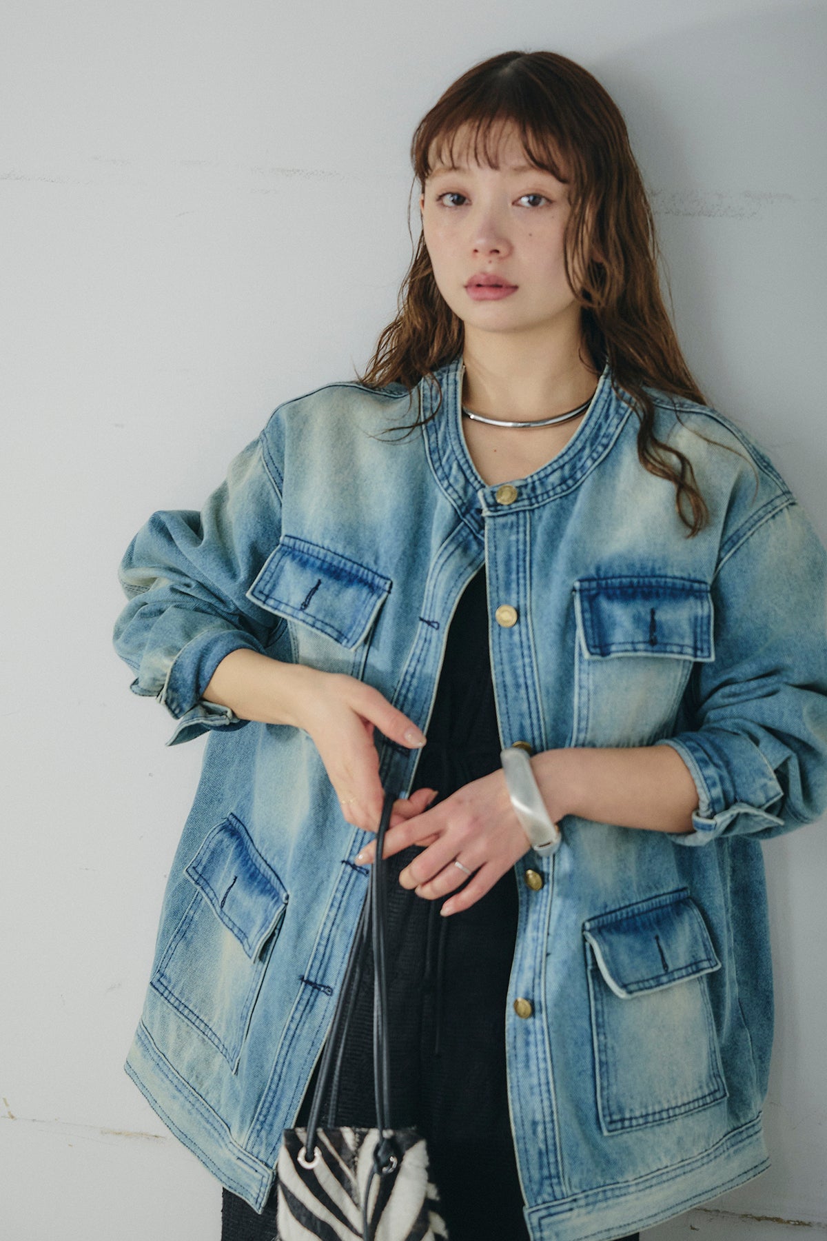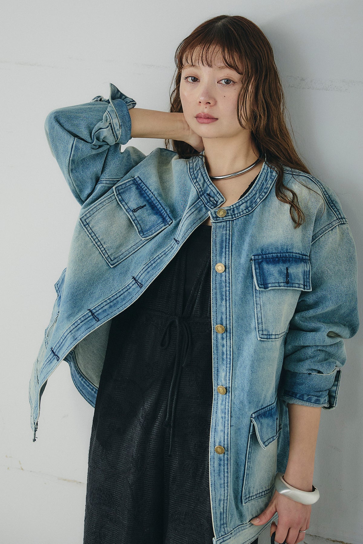 ヴィンテージライクな風合いが魅力のノーカラーデニムポケットジャケット。程よく色落ちした表情がこなれた雰囲気を引き立て、羽織るだけでスタイリングに奥行きをプラスします。すっきりとしたノーカラーデザインが顔まわりを軽やかに見せ、インナーとのレイヤードも楽しめるバランスに。フロントに配した大きめのポケットが実用性とアクセントを兼ね備え、シンプルながら存在感のある仕上がりです。ゆとりのあるシルエットで厚手のトップスにも重ねやすく、デイリーから季節の変わり目まで幅広く活躍する一着です。