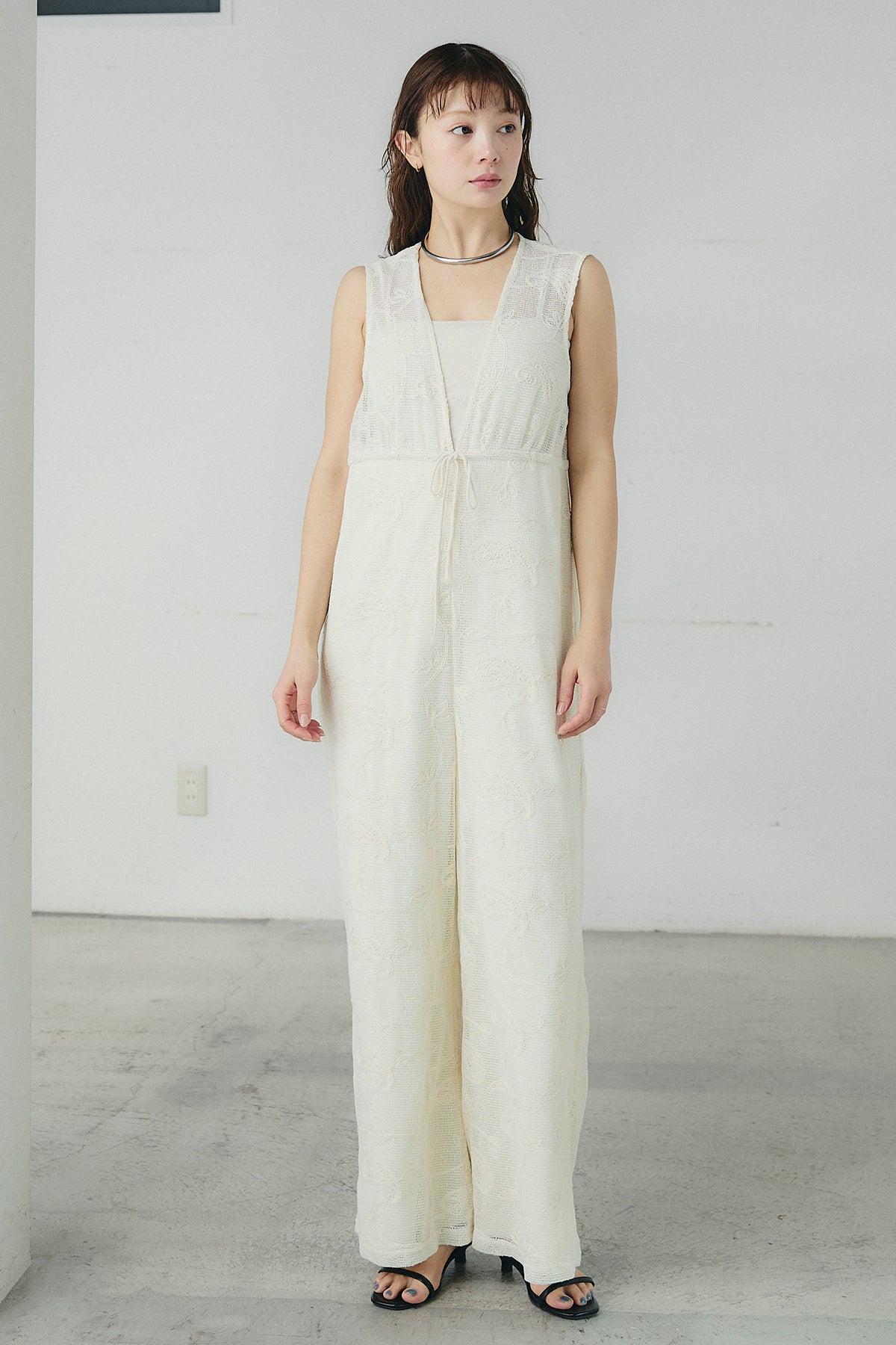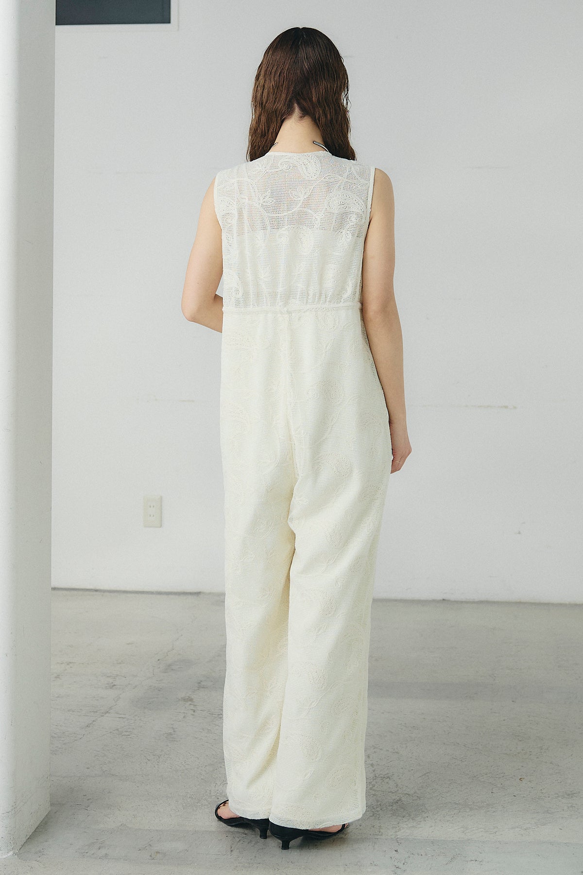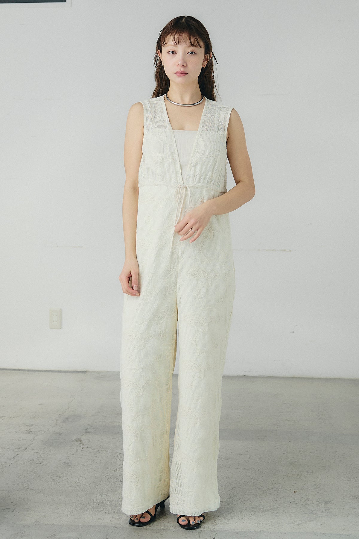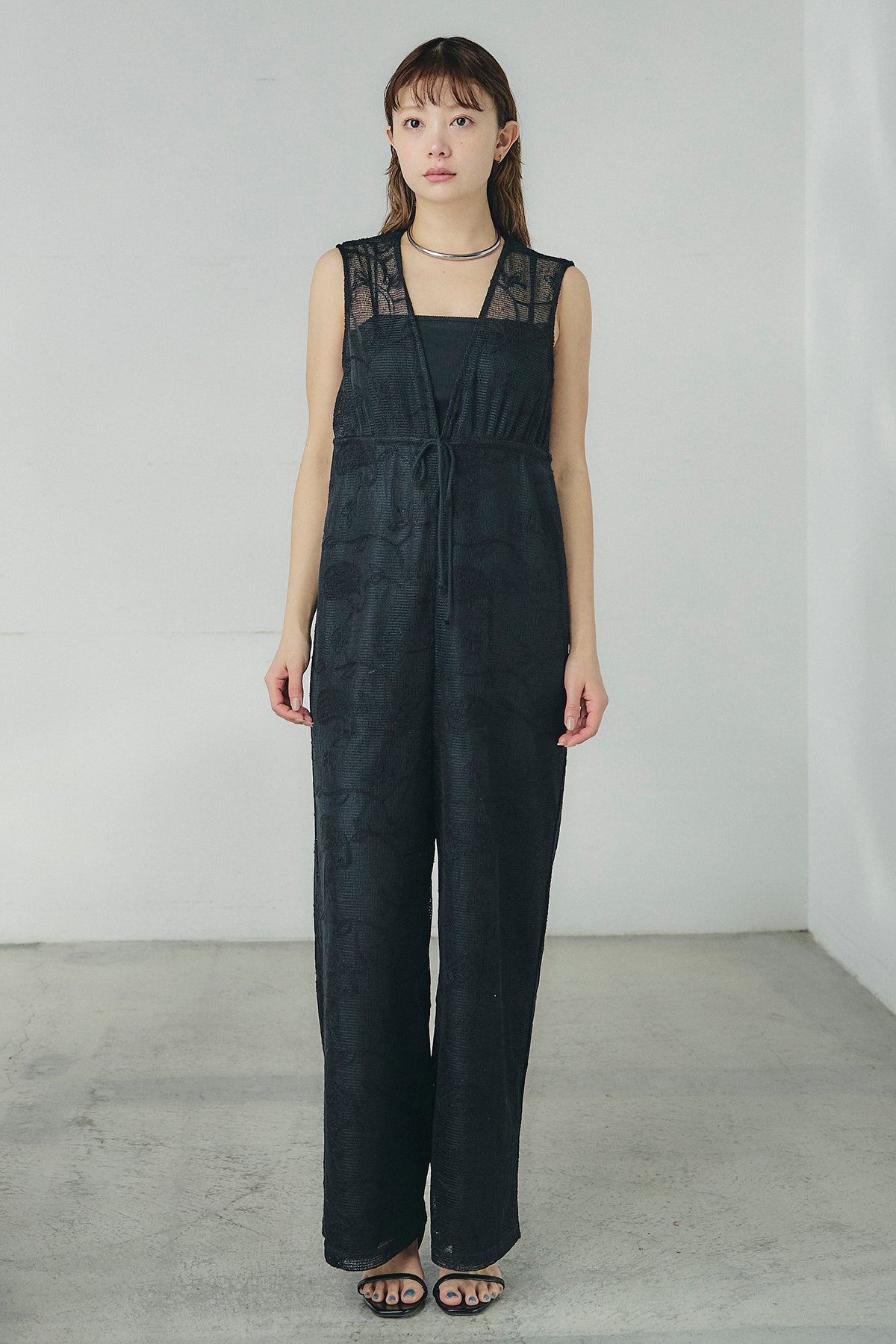 繊細なレース素材が印象的なサロペット。奥行きのある表情がスタイリングに軽やかさを添え、シンプルなインナーと合わせるだけで存在感のある着こなしが完成します。すっきりとしたVネックラインが顔まわりをシャープに見せ、縦のラインを強調するストレートシルエットがバランスよくまとまる一着に。ほどよくゆとりのあるフォルムでリラックスした着心地を叶えながら、きれいめな印象も兼ね備えています。タンクトップやシアートップス、シャツとのレイヤードも楽しめ、日常からお出かけシーンまで幅広く活躍します。