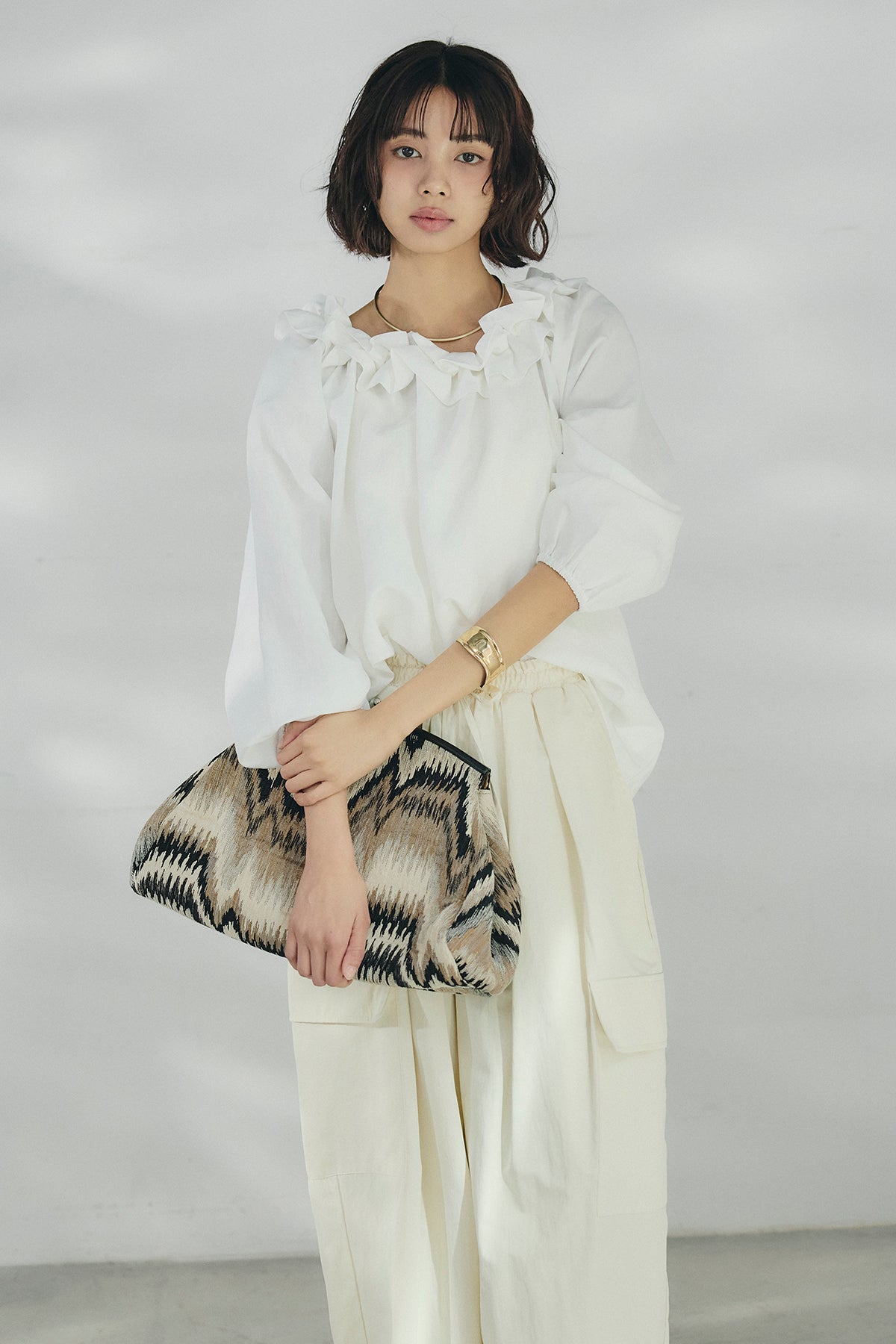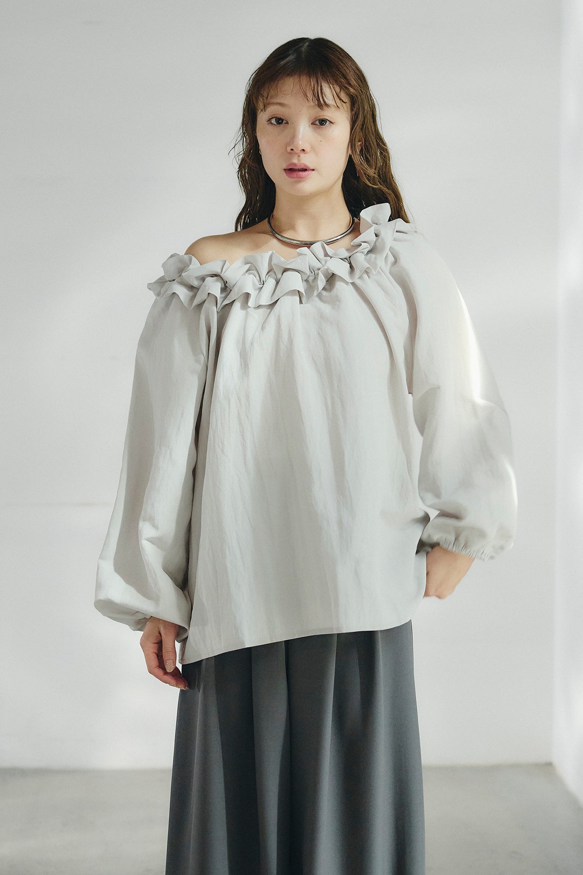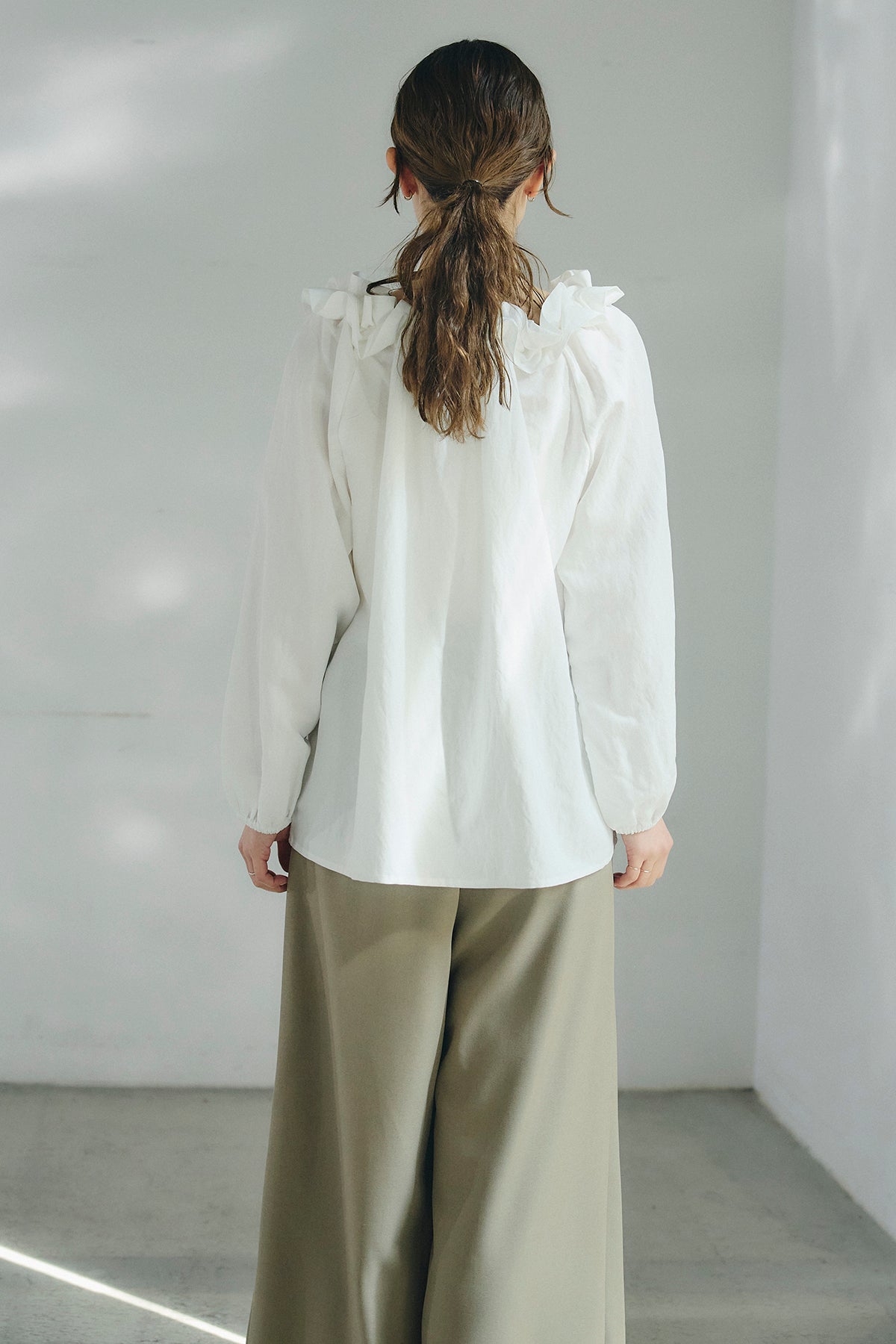 顔まわりを華やかに彩るネックフリルが印象的なデザインブラウス。立体的に重なったフリルがさりげない存在感を添え、シンプルなスタイリングにも表情をプラスします。ふんわりとしたシルエットとボリュームスリーブが軽やかな動きを生み、リラックス感のある着心地に。程よくゆとりのあるフォルムでボトムスを選ばず、パンツからスカートまでバランスよく合わせられます。1枚で着映えするのはもちろん、ジャケットやベストのインナーとしても活躍し、日常からお出かけまで幅広く取り入れやすい一着です。