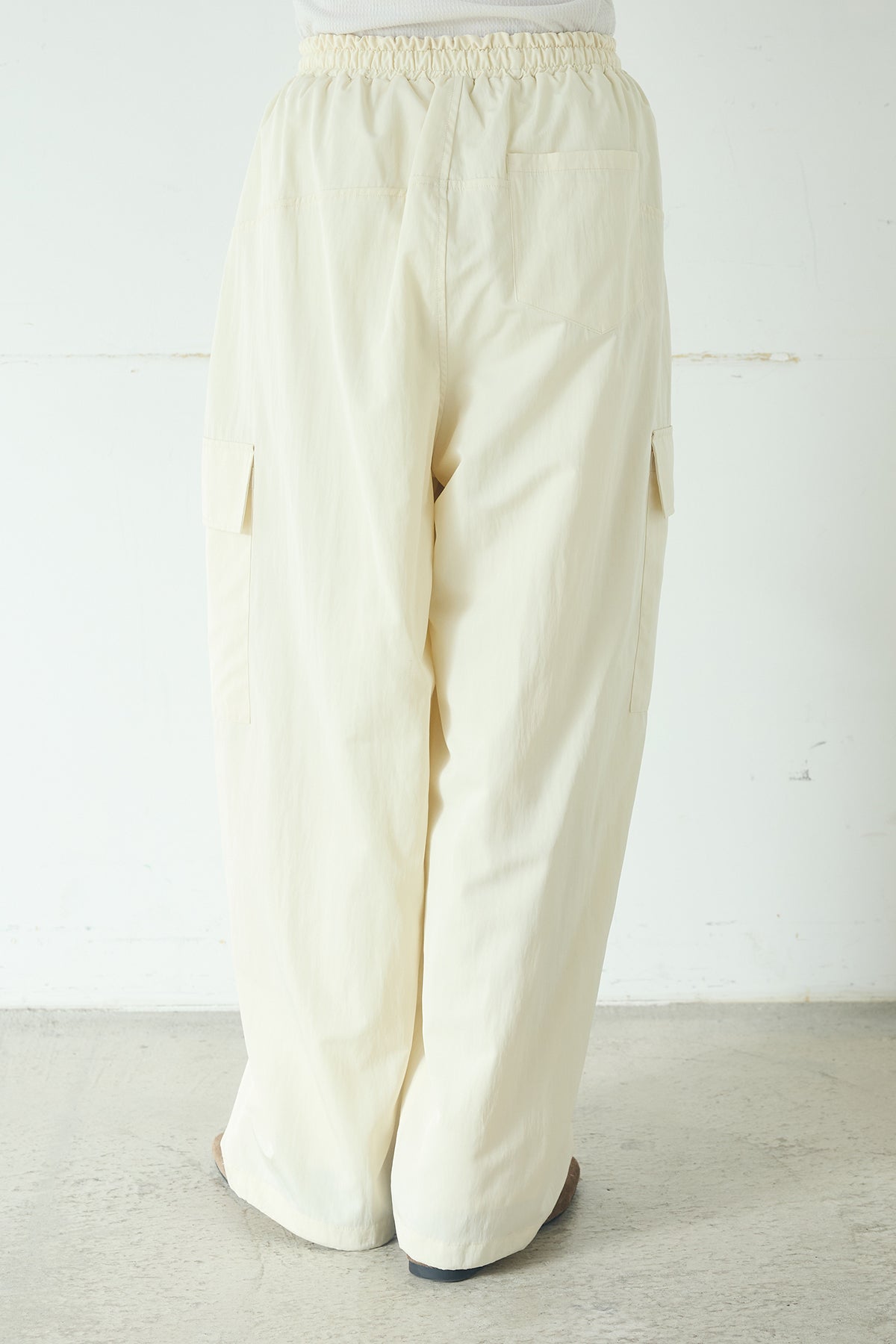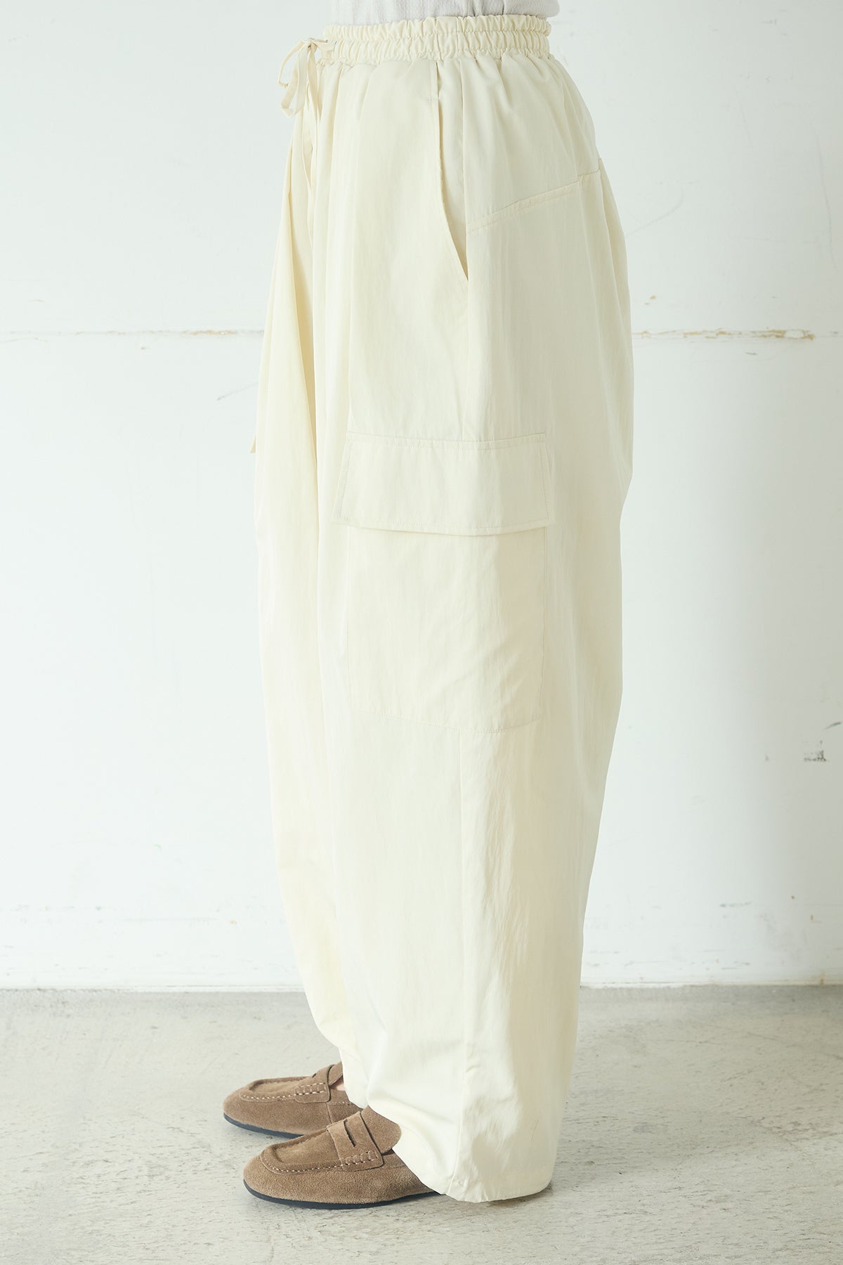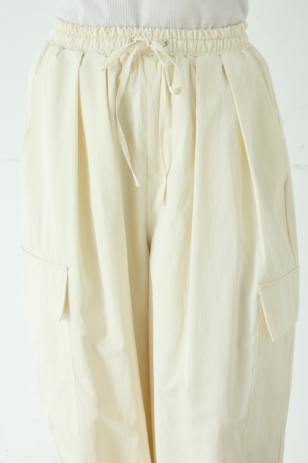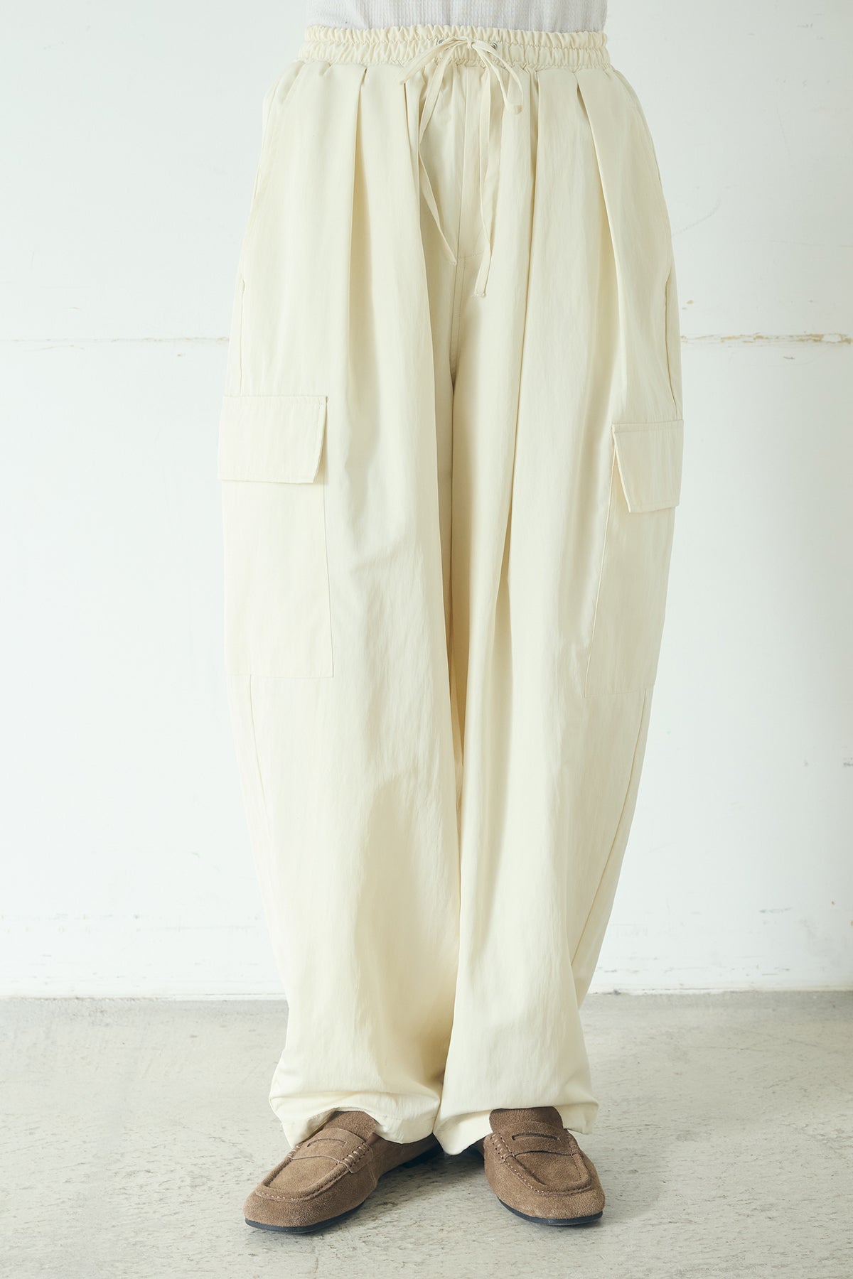 撥水ジョガーパンツ 軽やかな素材感に撥水機能を備えた、実用性とデザイン性を兼ね備えたジョガーパンツ。 ほどよくゆとりのあるシルエットと裾のジョガーデザインが、リラックス感の中にすっきりとした印象を添えます。ウエストはゴム仕様で快適なはき心地を叶えつつ、サイドポケットのディテールがさりげないアクセントに。トップスを選ばず合わせやすく、日常のスタイリングに自然と馴染む一枚です。