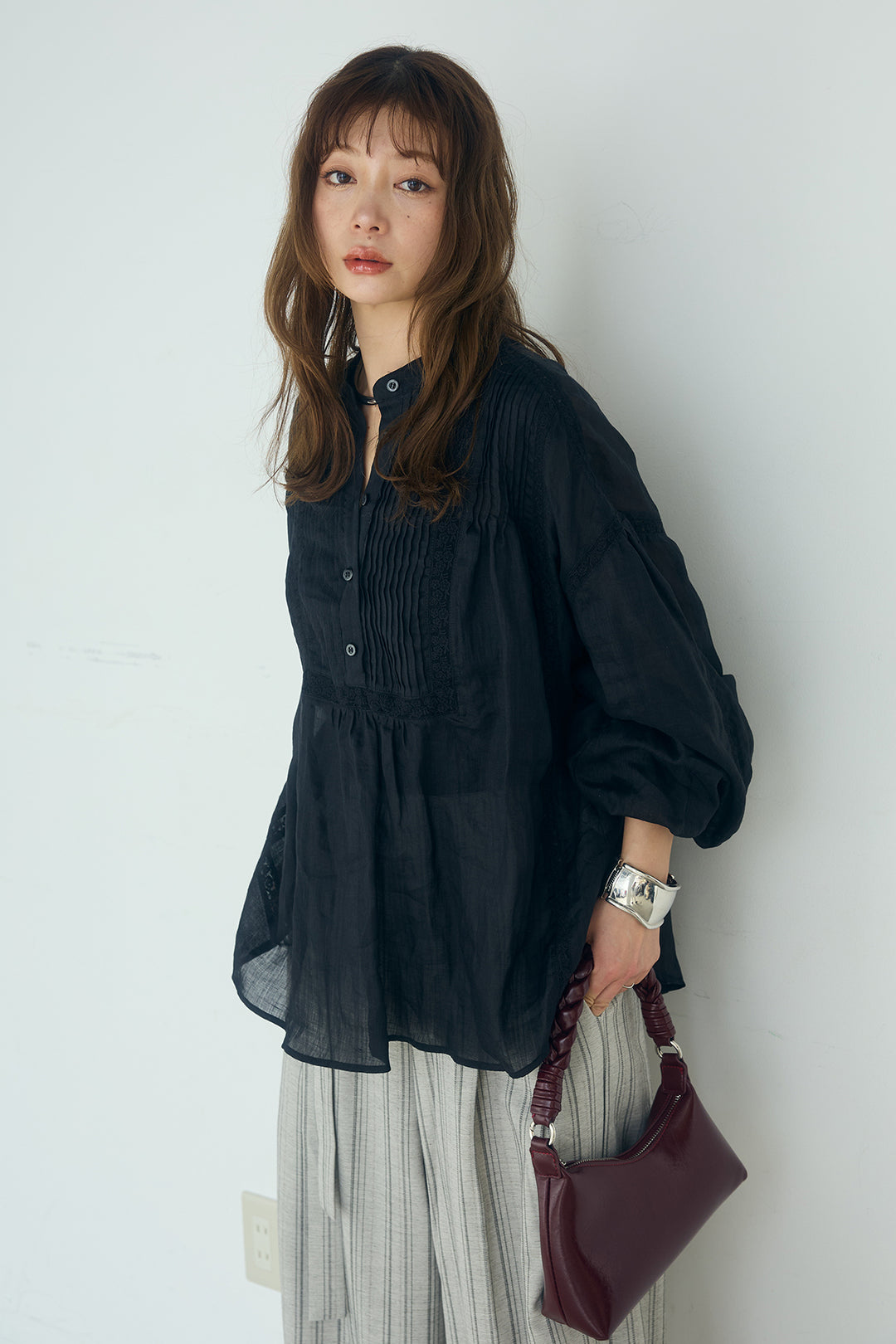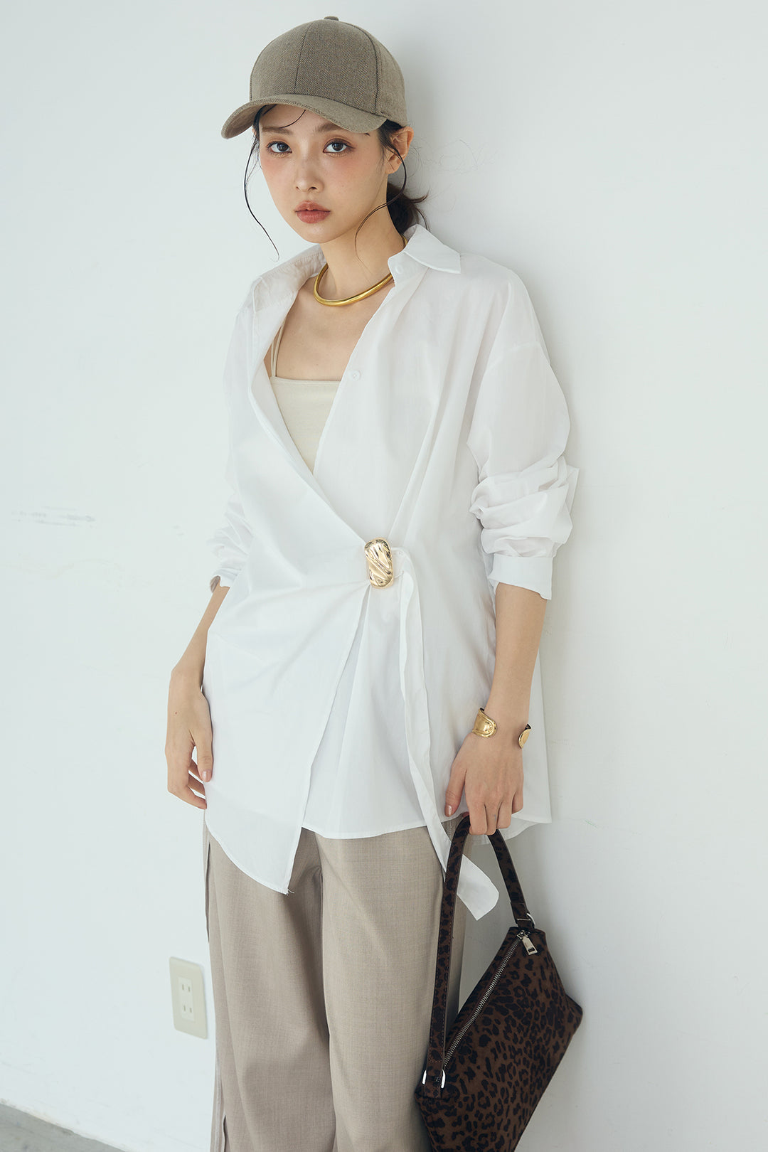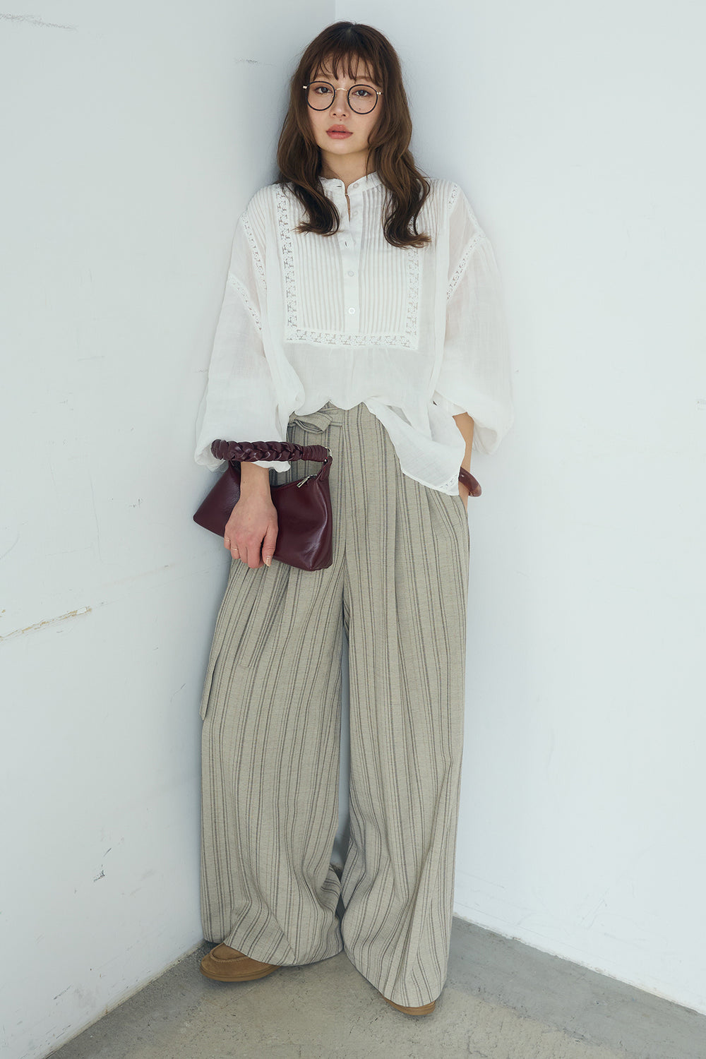 [SET]レース刺繍ラインバンドカラーシャツ+リネン混サイドベルトパンツ(2set)