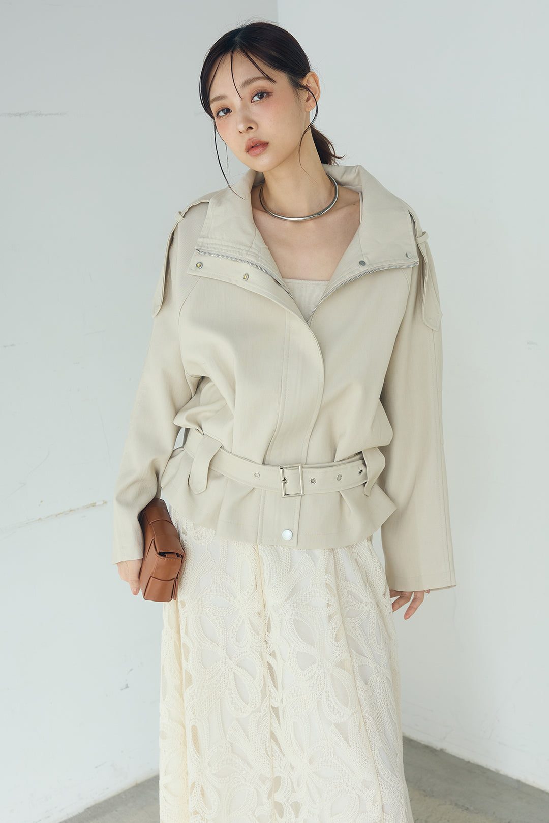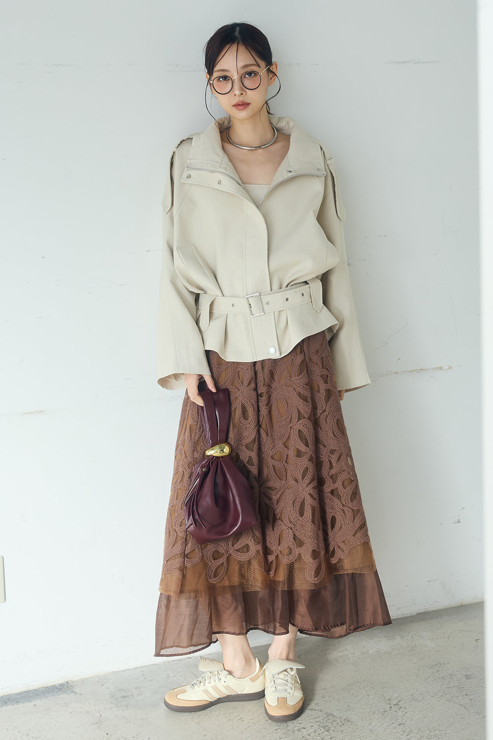[SET]ベルト付きスタンドネックアウター+ニュアンス柄刺繍スカート(2set)