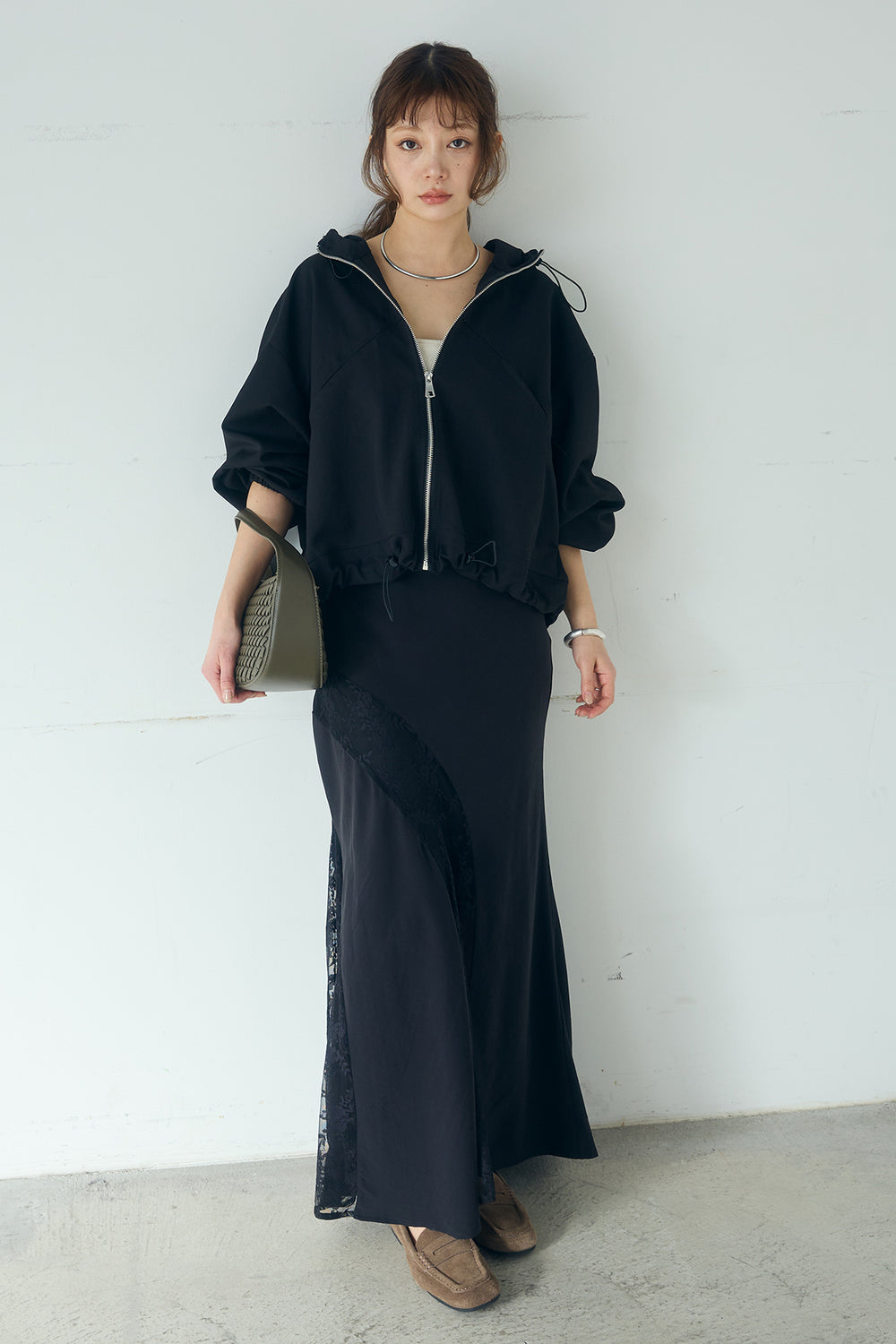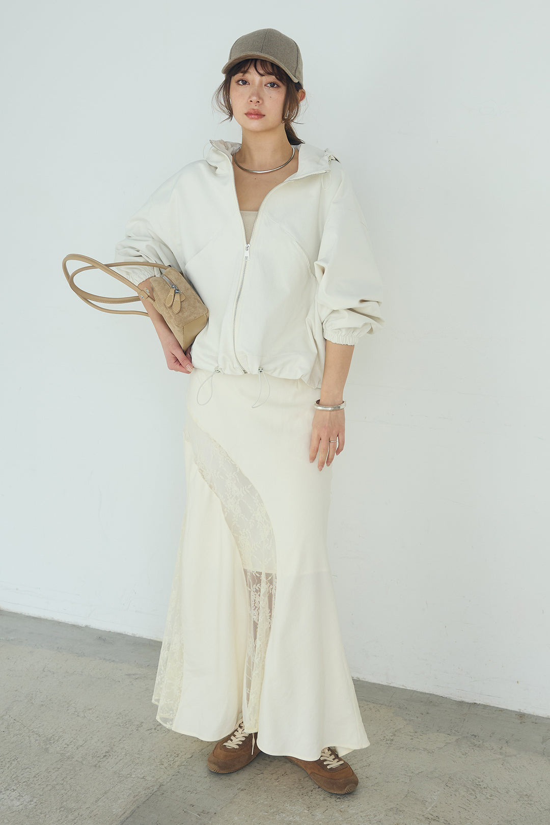 [SET]ネック裾絞りブルゾンアウター+刺繍レースデザインサテンスカート(2set)