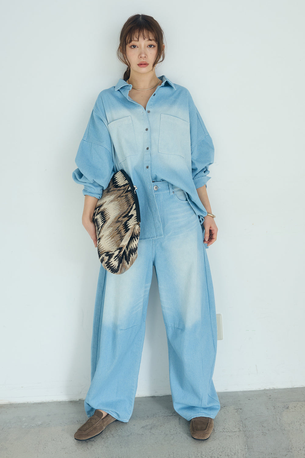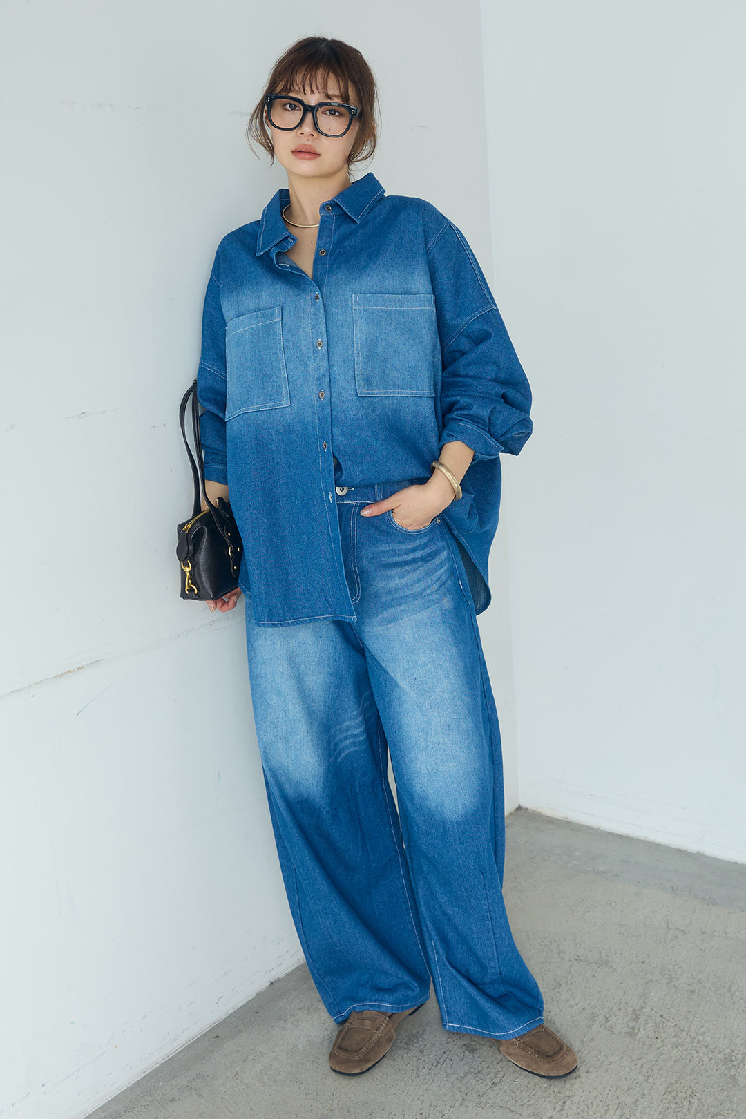 [SET]ヴィンテージ加工デニムオーバーシャツ+ヴィンテージ加工デニムワイドパンツ(2set)
