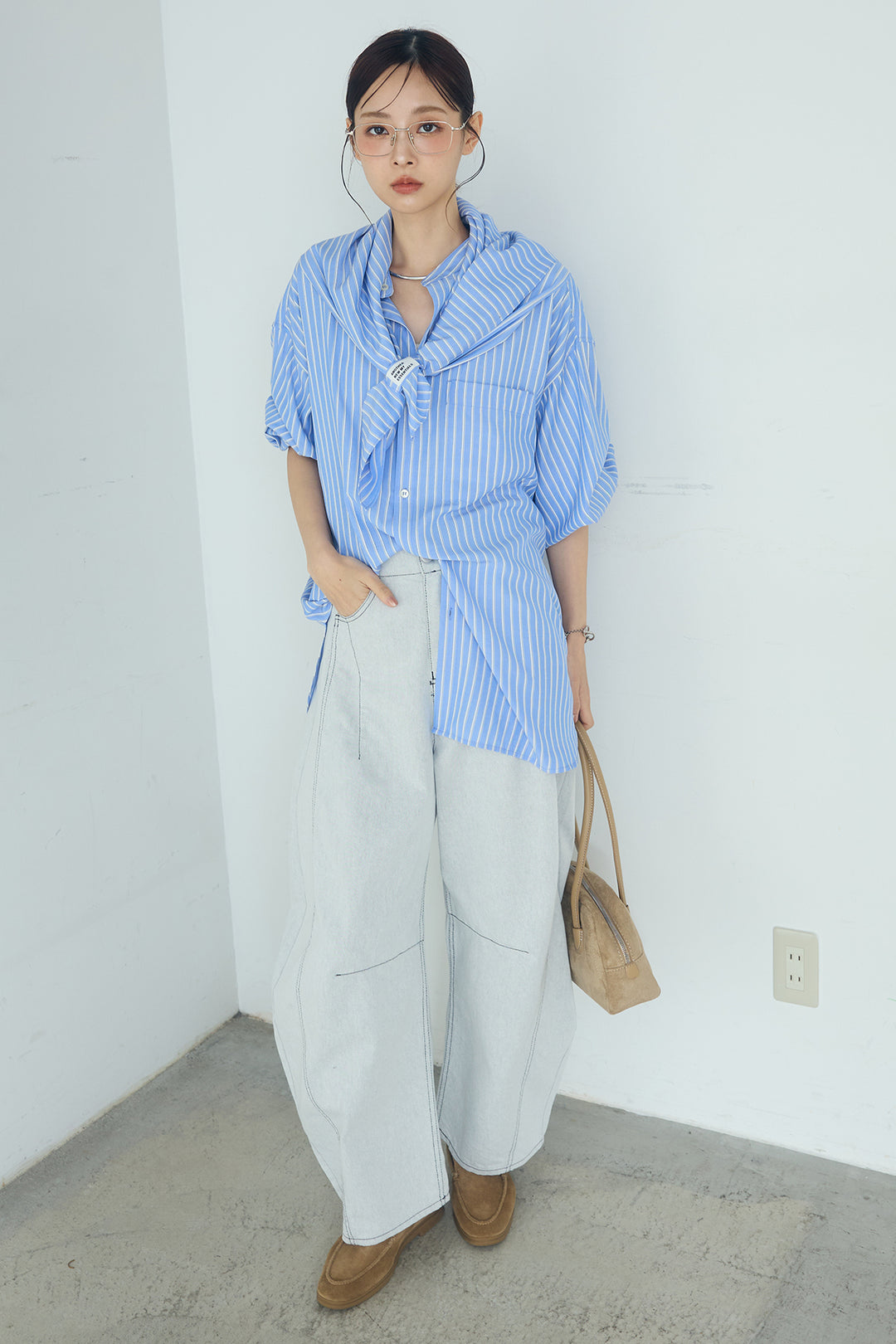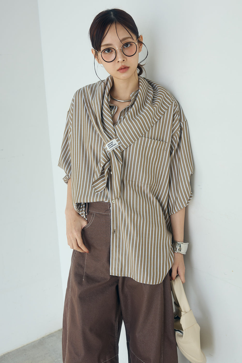 [SET]レーヨンストライプスカーフ+ツイル配色ステッチバレルパンツ+レーヨンストライプバンドカラー長袖シャツ(3set)