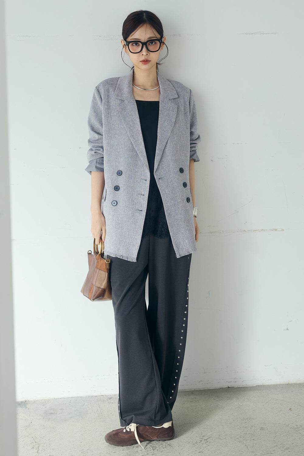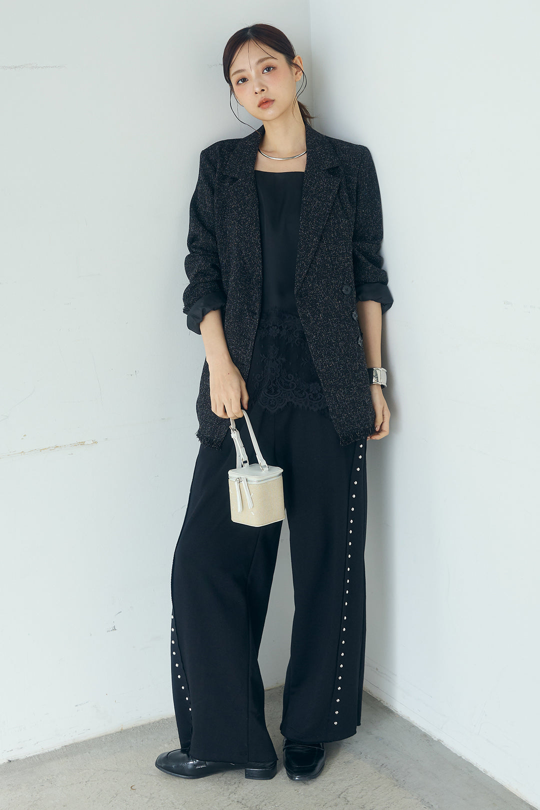 [SET]スラブネップツイードフリンジテーラードジャケット+サイドデザイン入りスウェットパンツ+裾レースキャミソール(3set)