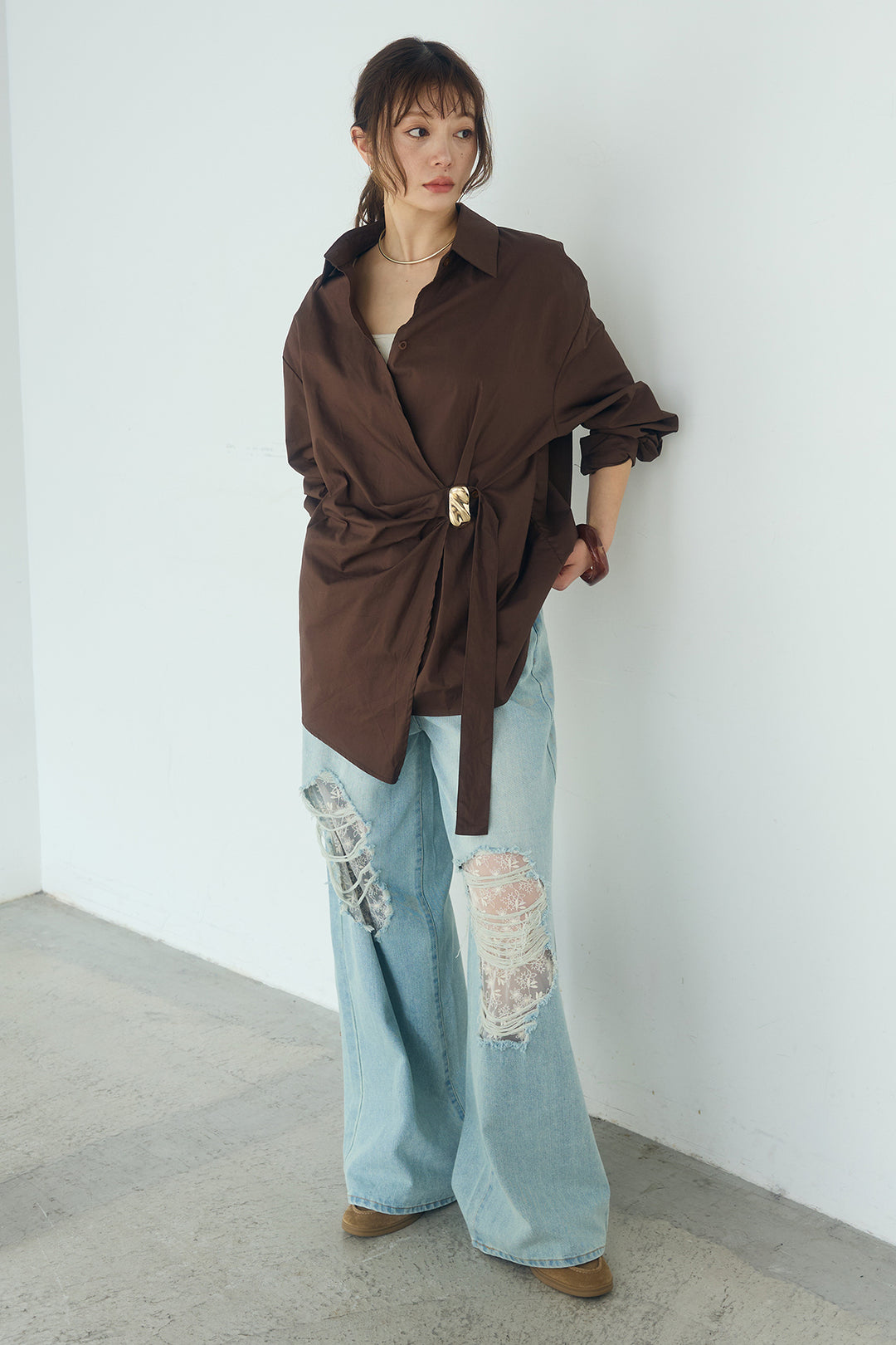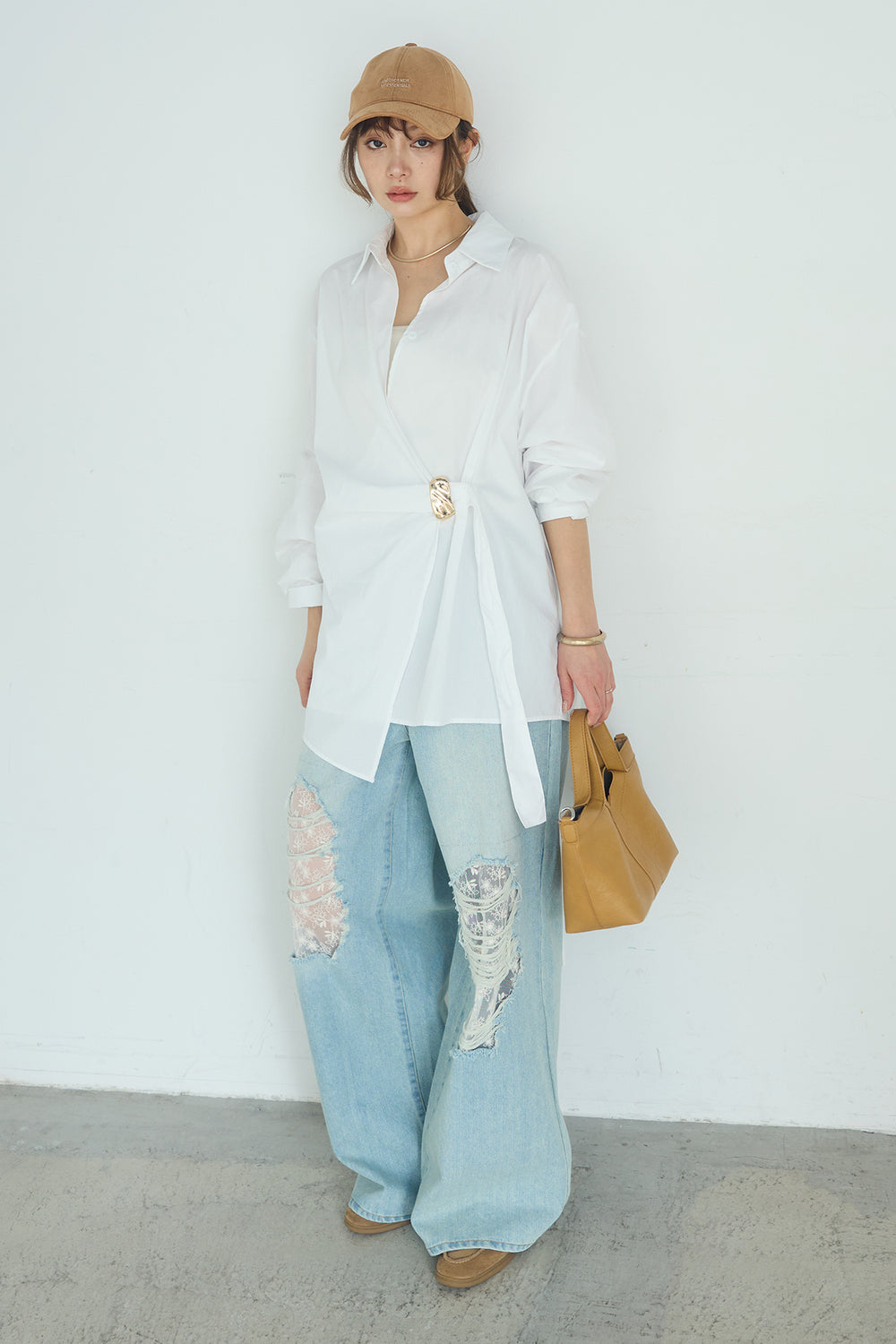 [SET]サイド留め具デザインシャツ+デニムレース付きワイドパンツ(2set)