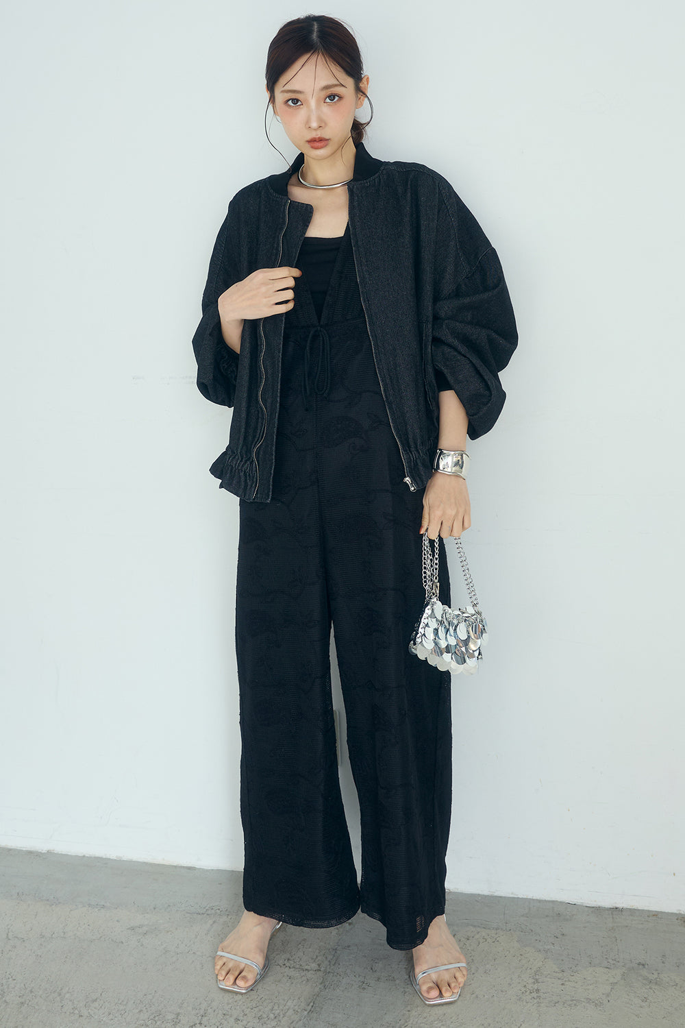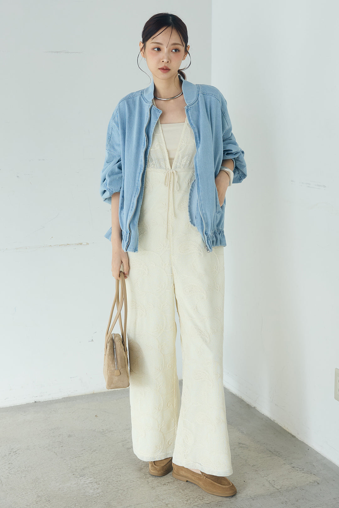 [SET]袖シャーリング裾フリルデニムブルゾン+レースサロペット(2set)